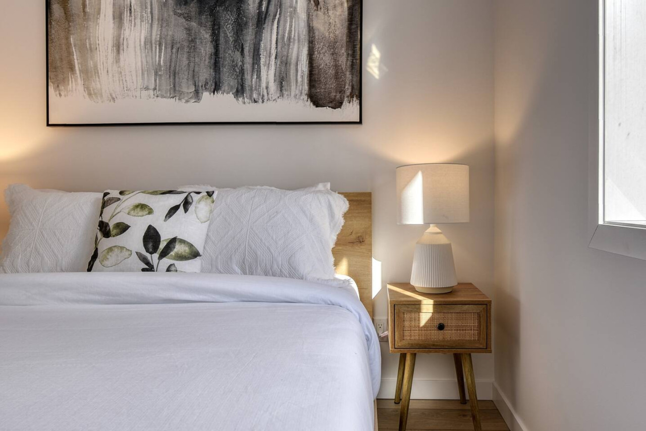 The main living room is furnished with a comfortable sofa, electric fireplace, and Smart TV. The open concept design and abundant windows provide lots of natural light.