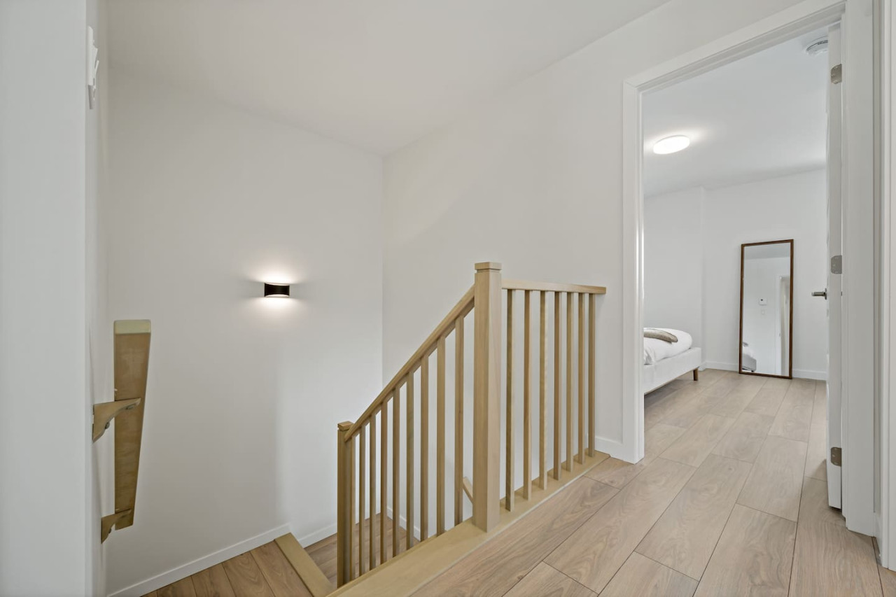 Il y a 4 chambres dans cette maison, 3 à l'étage et une au sous-sol. La chambre 1, la principale, dispose d'un lit king size, d'un espace de travail, d'un placard et d'une salle de bain complète. Les chambres 2 et 3 sont situées à l'étage et disposent chacune d'un lit double. Au sous-sol, vous trouverez la chambre n°4 avec deux lits superposés. Il y a 3,5 salles de bains au total, y compris la salle de bains de la chambre principale.