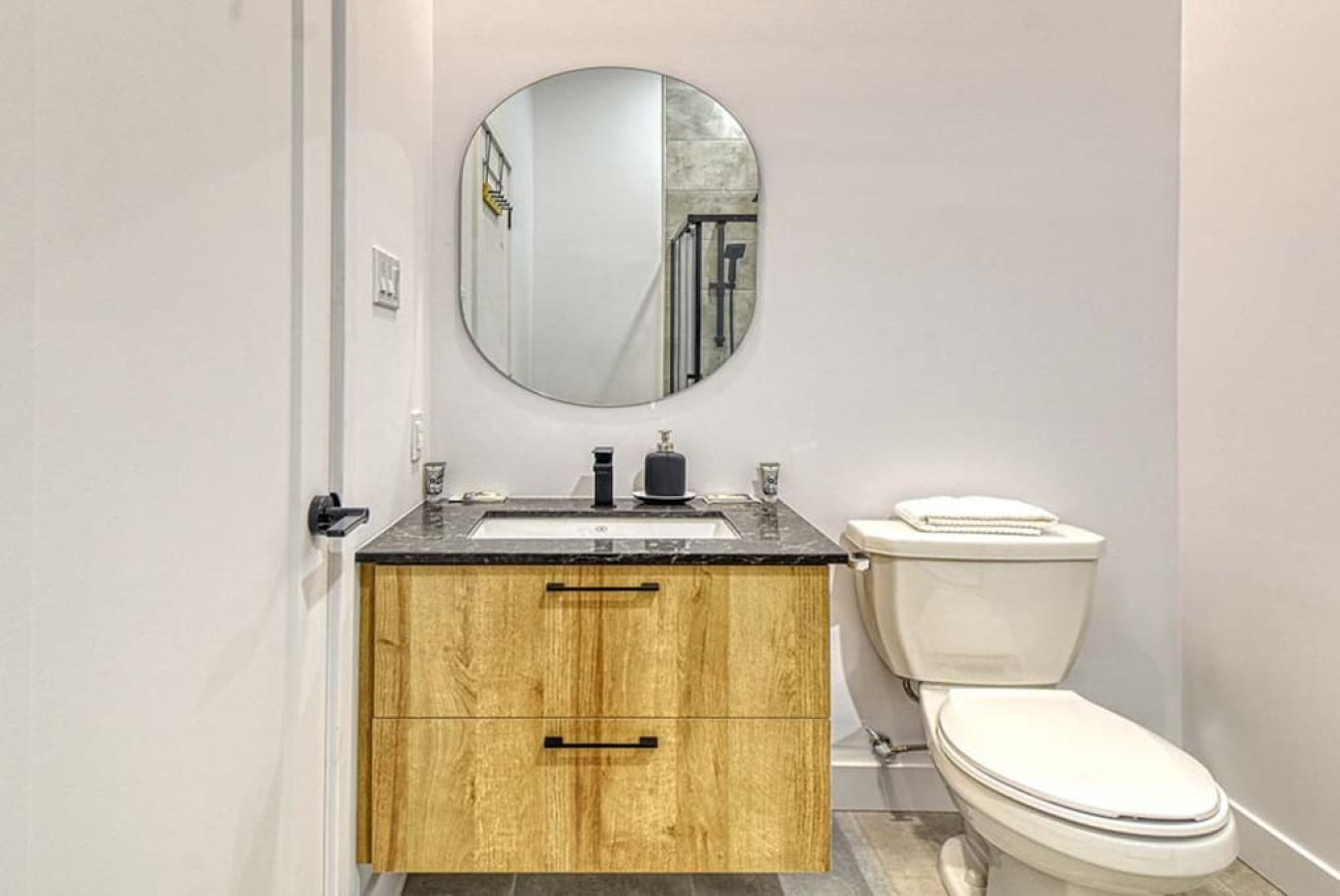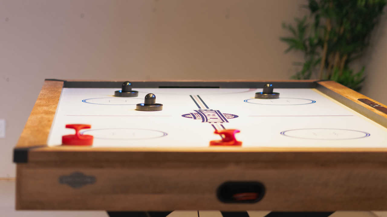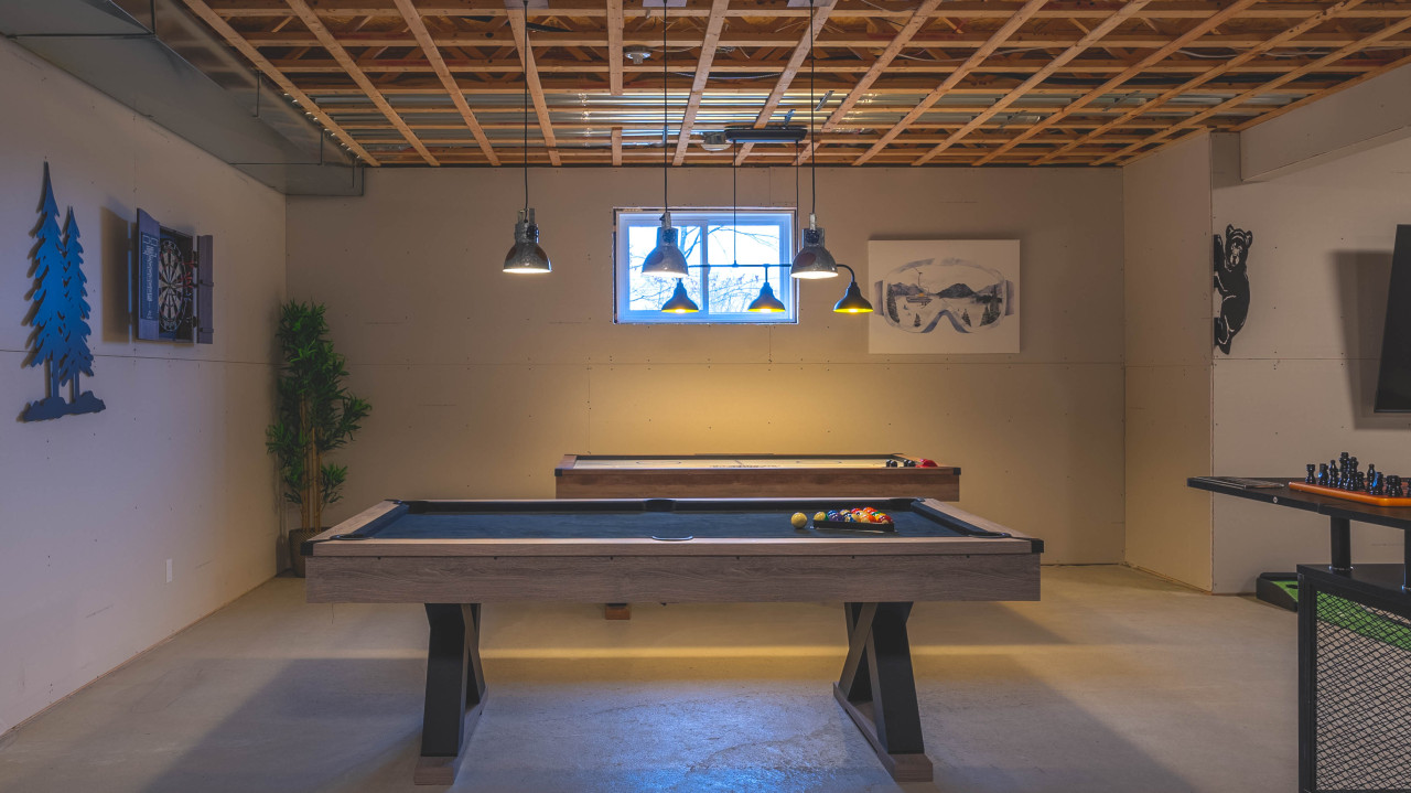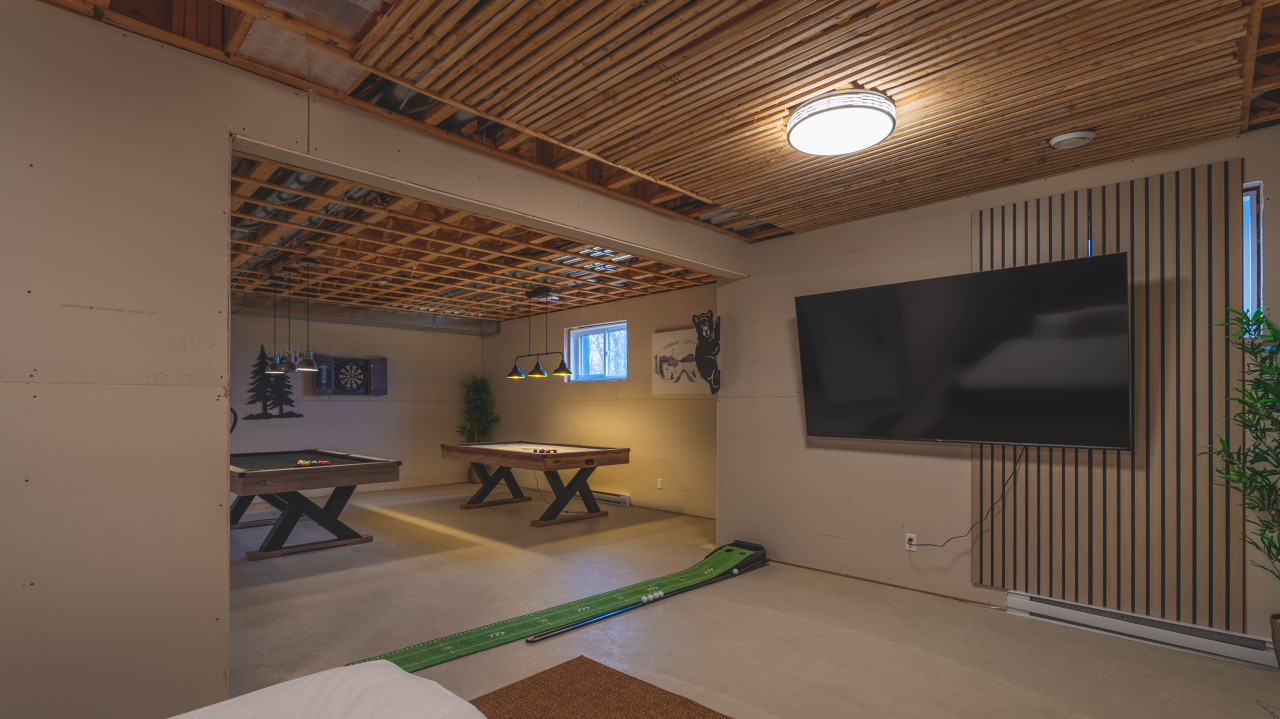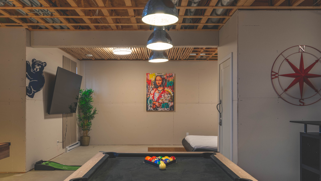 Descendez au rez-de-chaussée pour profiter de l'espace de divertissement avec un billard, un jeu de hockey sur table et un lit king size supplémentaire.