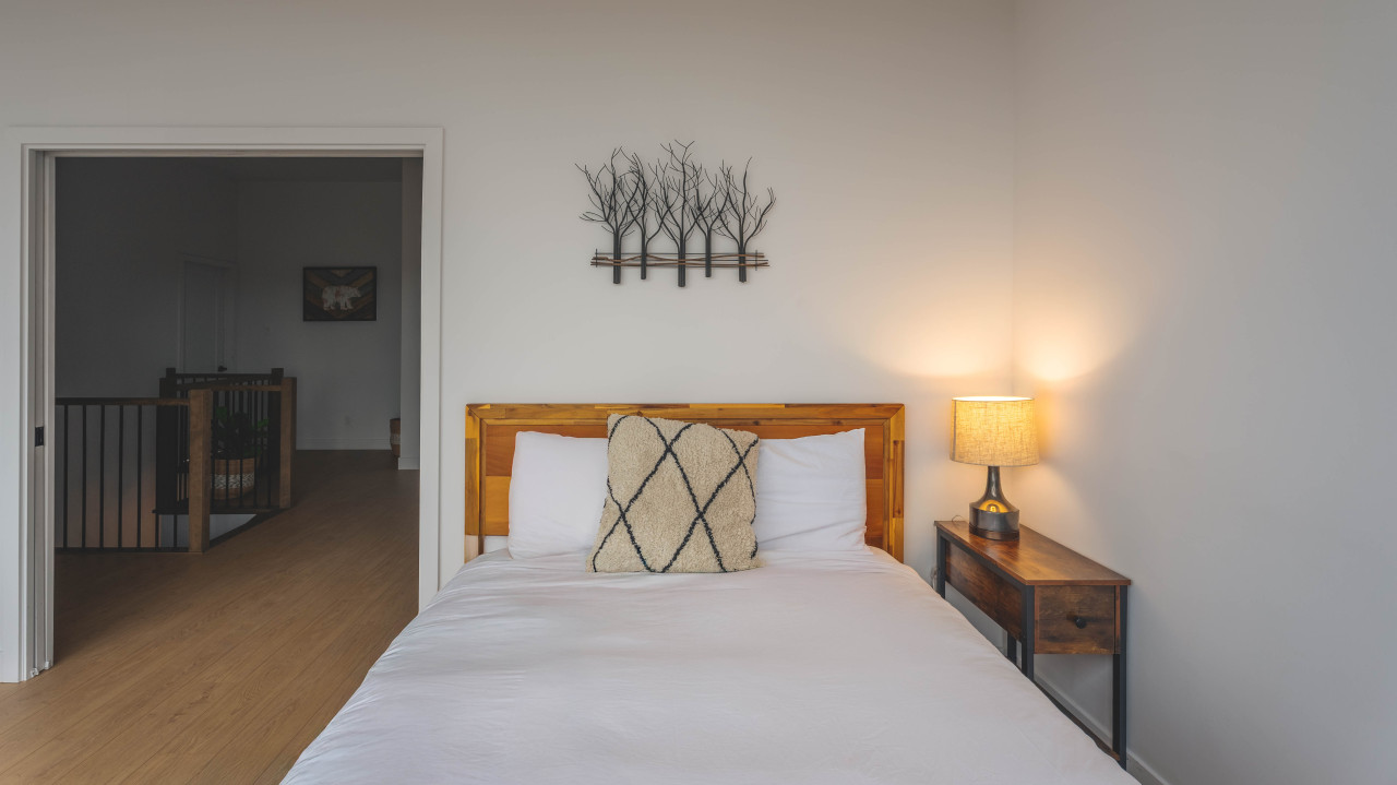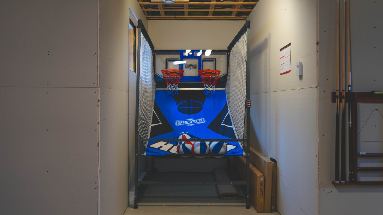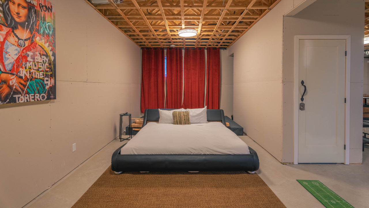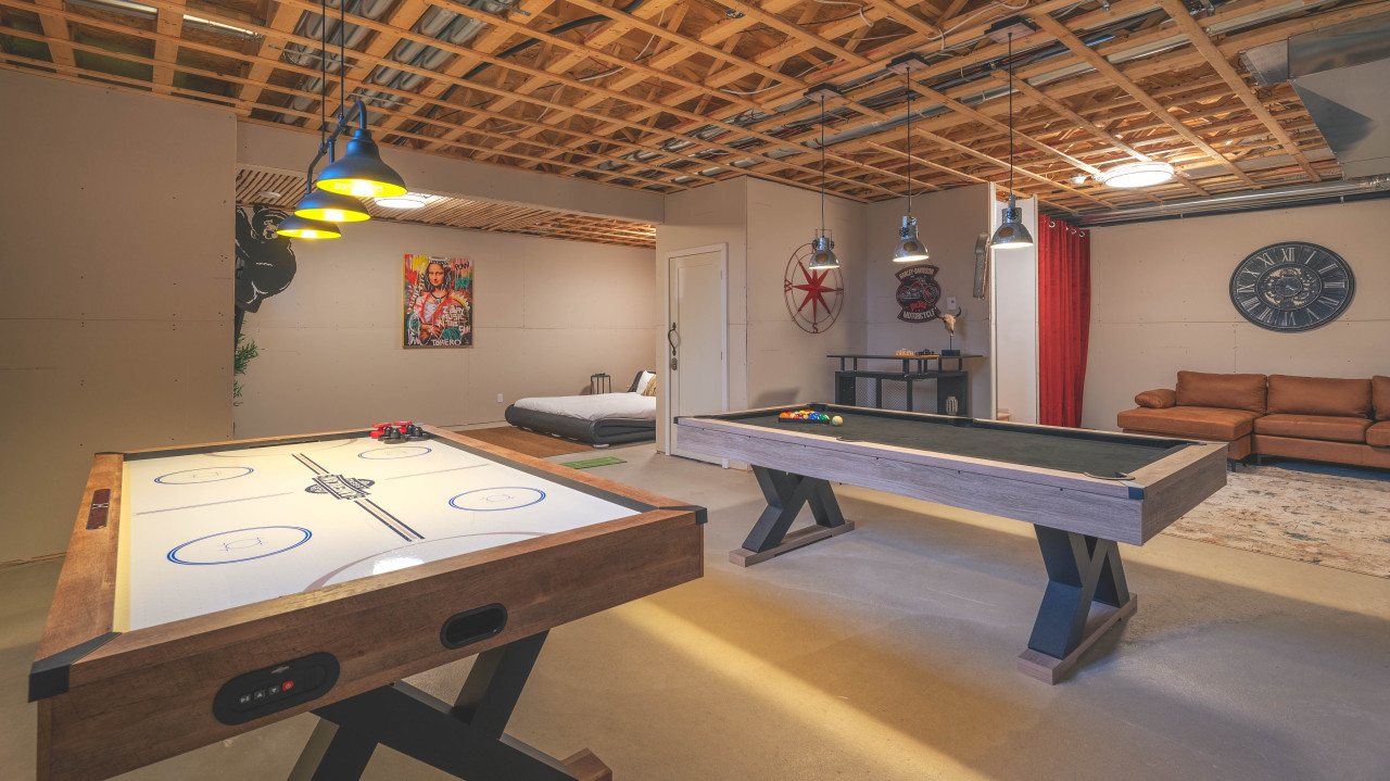 Head downstairs to enjoy the entertainment area with a pool table, air hockey, and an extra king bed.