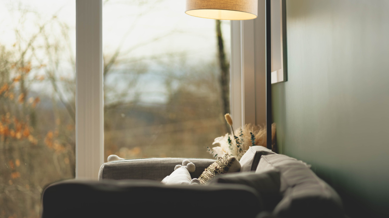 Relax in the bright open-concept living area with floor-to-ceiling windows, a cozy lounge, and a fully equipped kitchen.