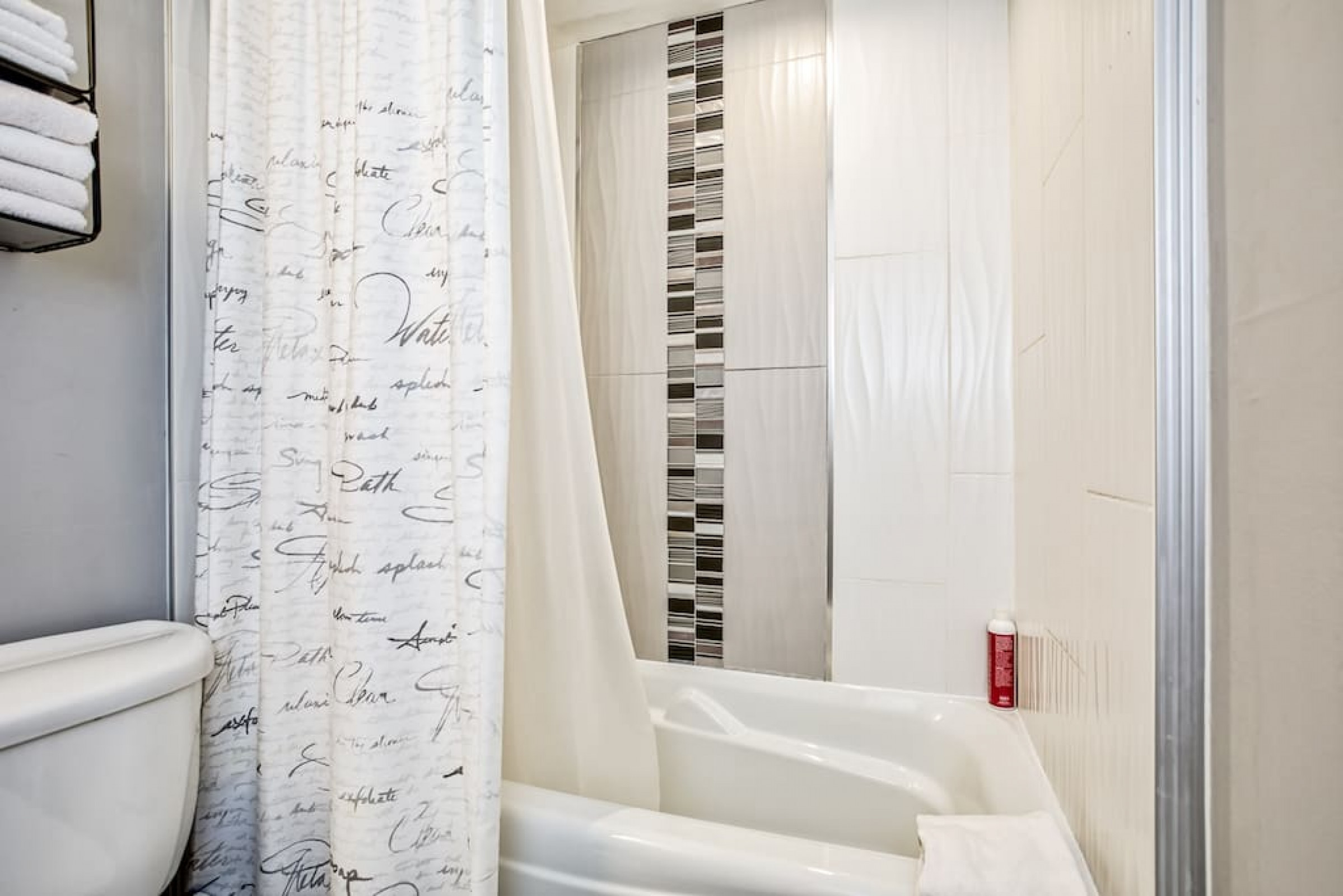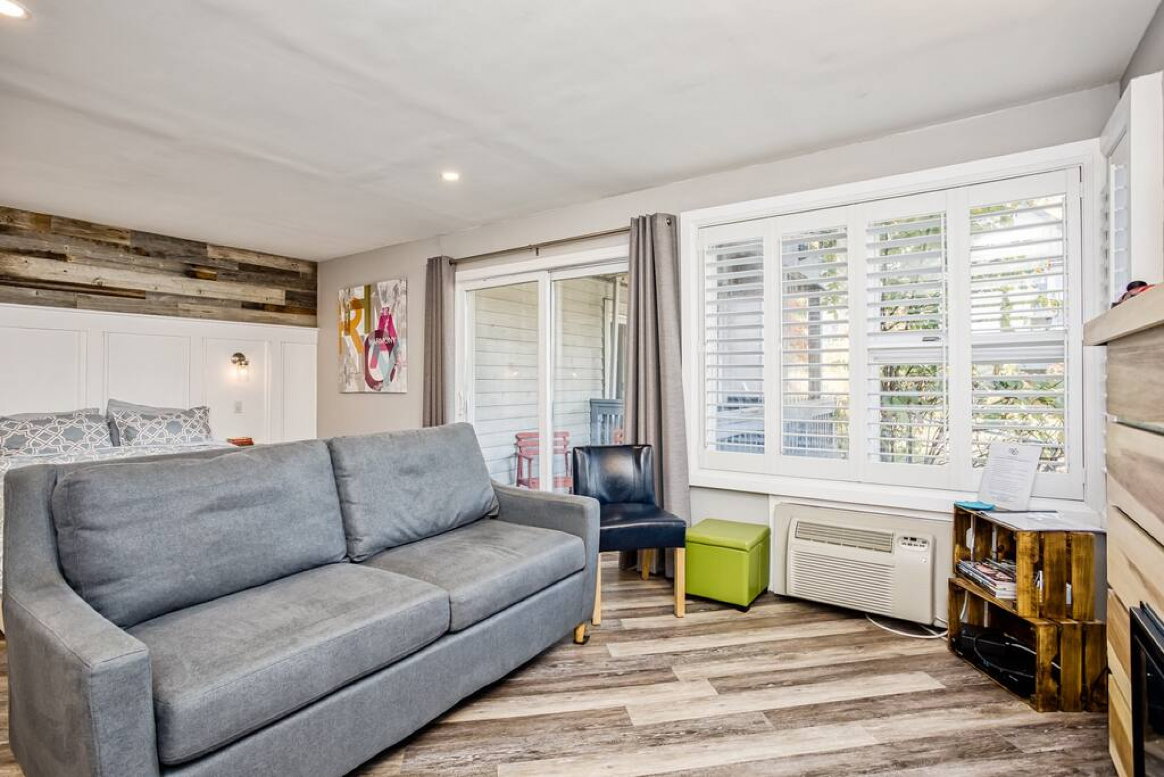 The main living area is adorned with a trendy sofa couch facing a custom-made hardwood fireplace mantle and electric fireplace. Above the fireplace you will find a HD LED Smart TV and Bluetooth Soundbar. The unit also comes equipped with complimentary Cable TV, Netflix, and unlimited Internet so when you are relaxing in the unit, you can still connect to the online world.