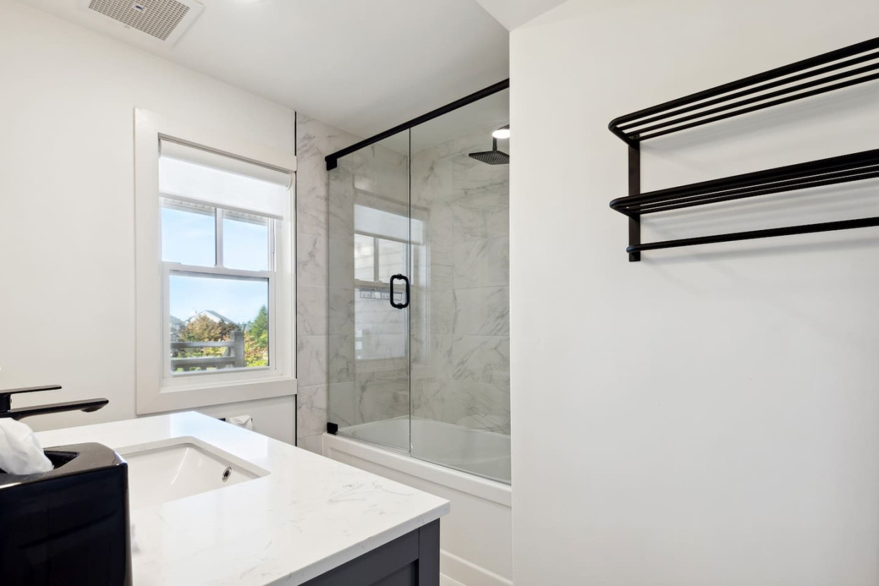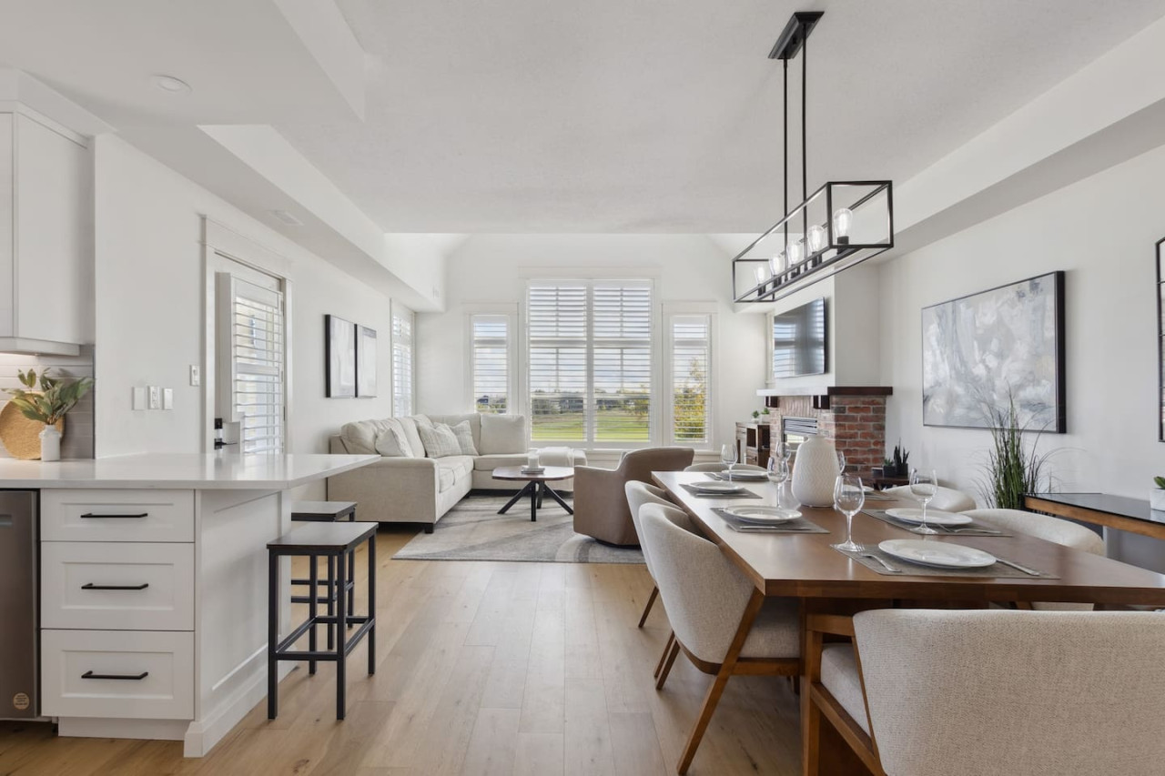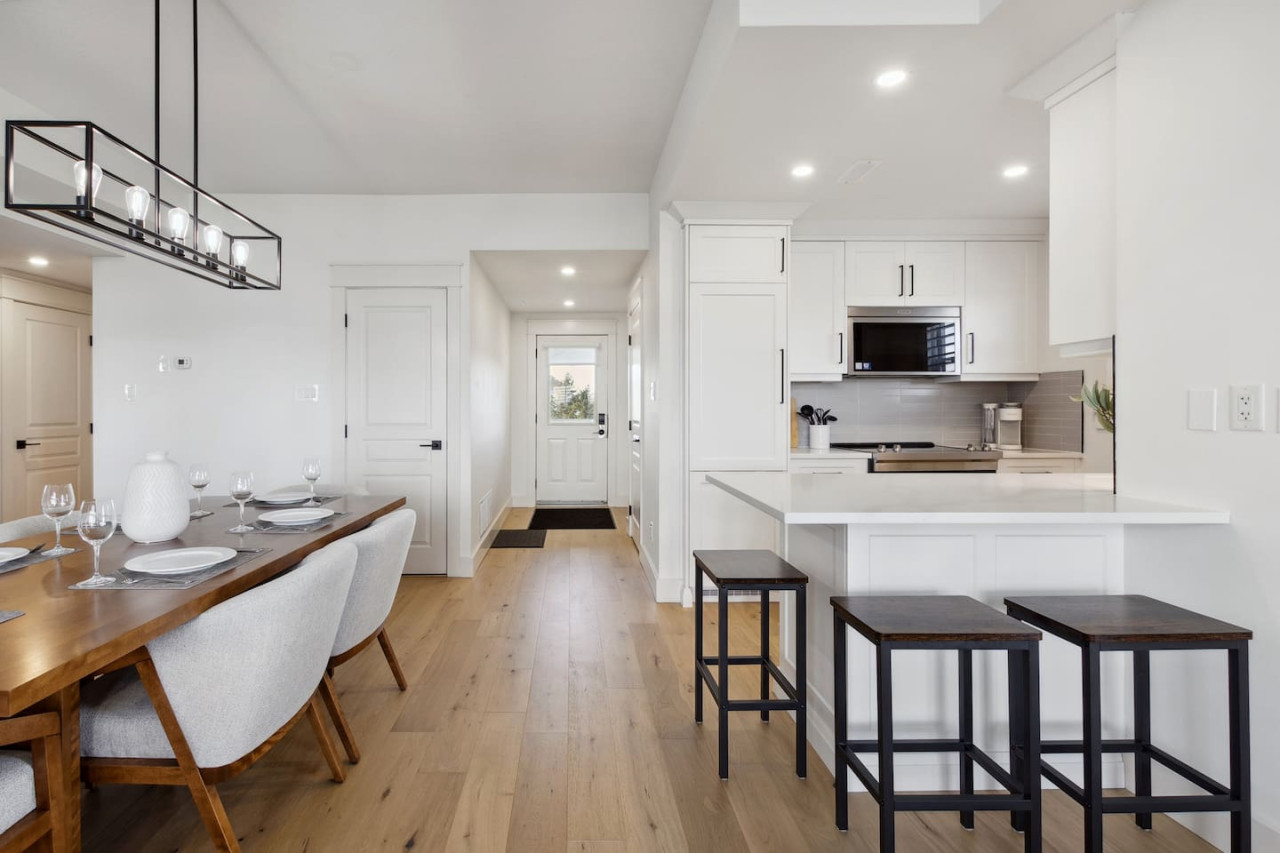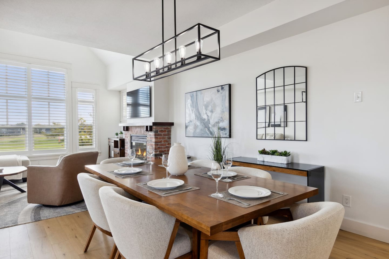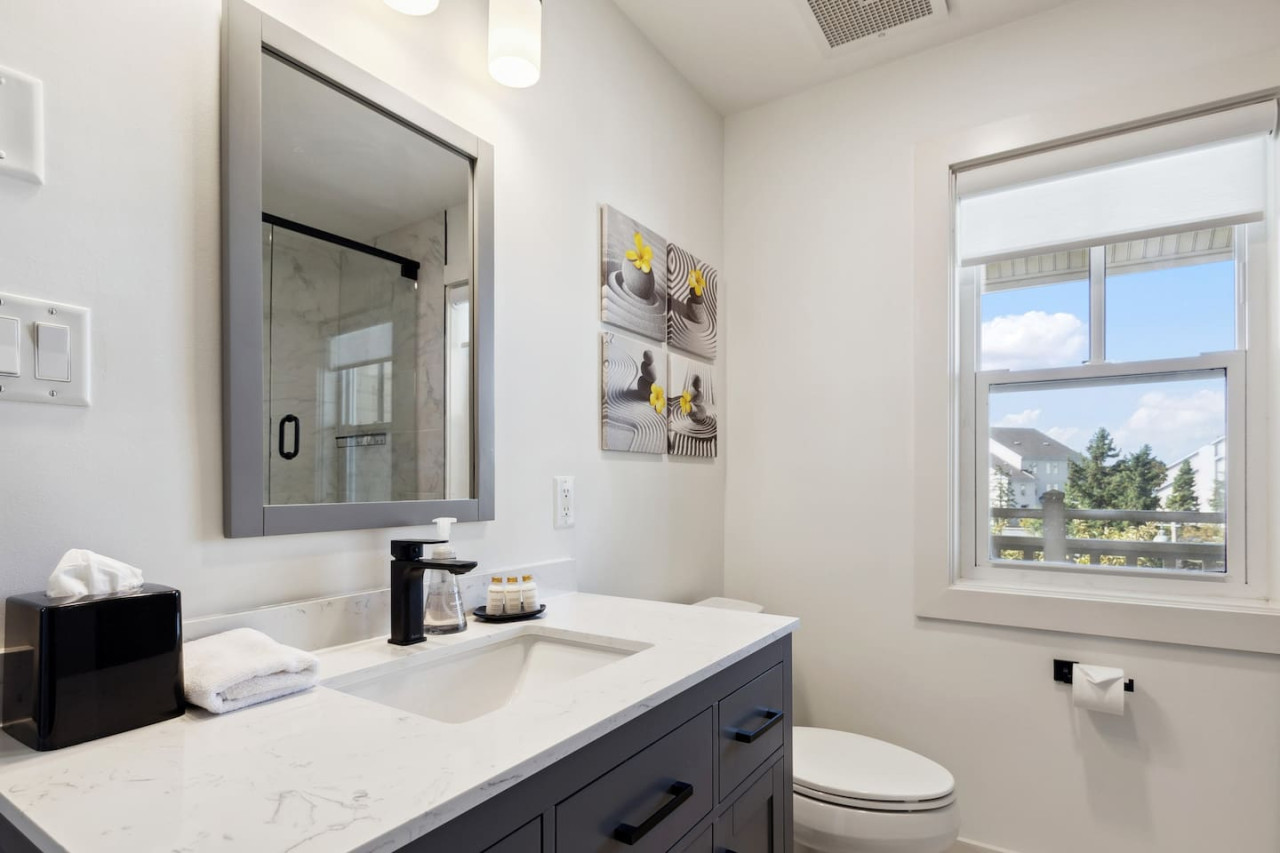This home is ideal for families and small groups in search of a quiet getaway. As you walk through the door, you’ll arrive in the open concept living area with comfortable seating facing the gas fireplace and Smart TV. The large windows open up to provide natural light and front row views of the Monterra Golf Course.