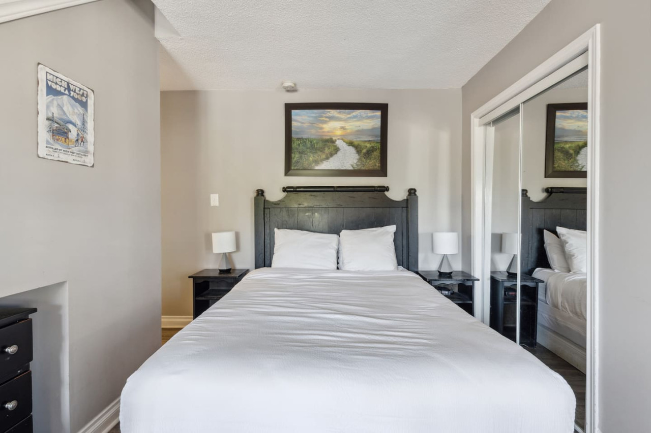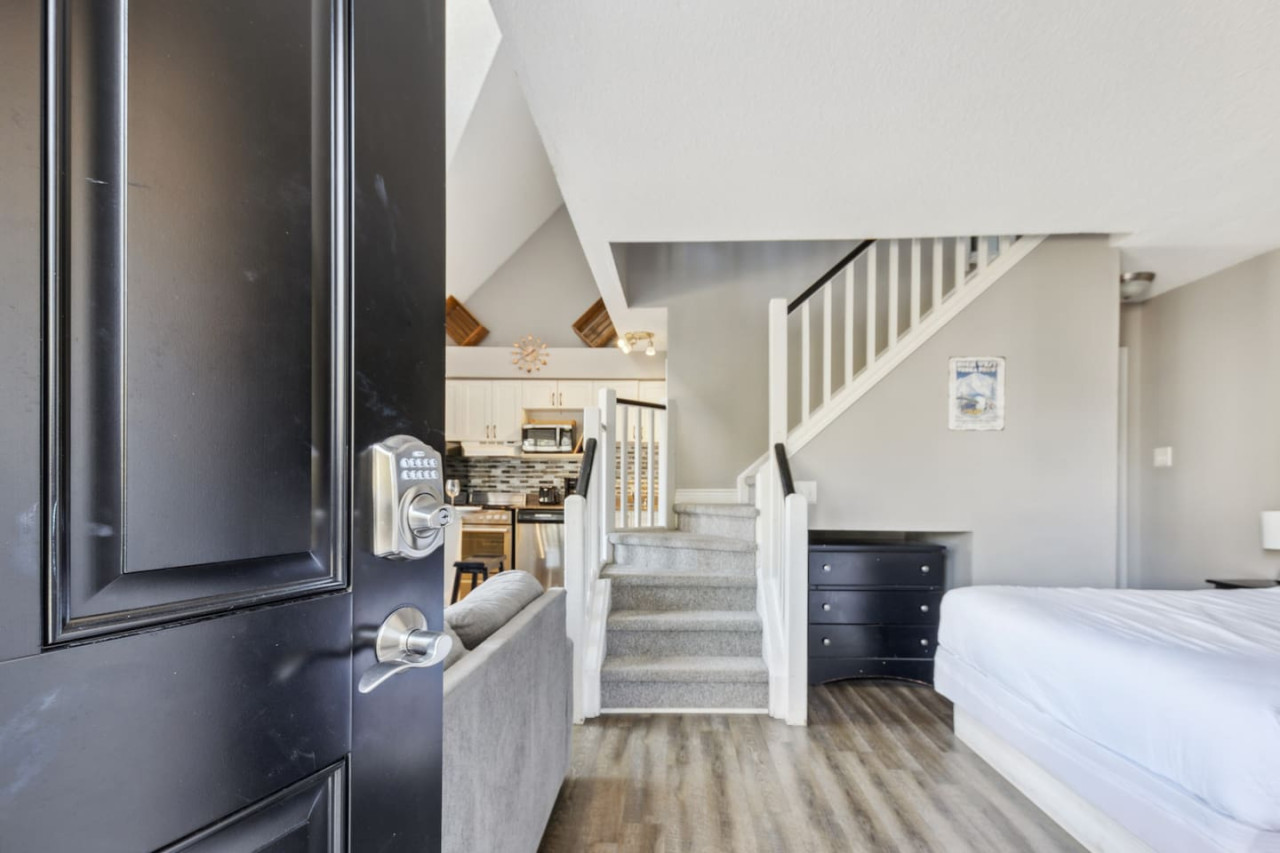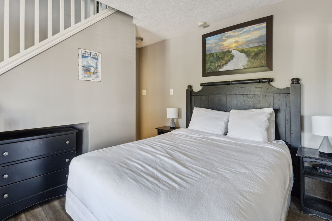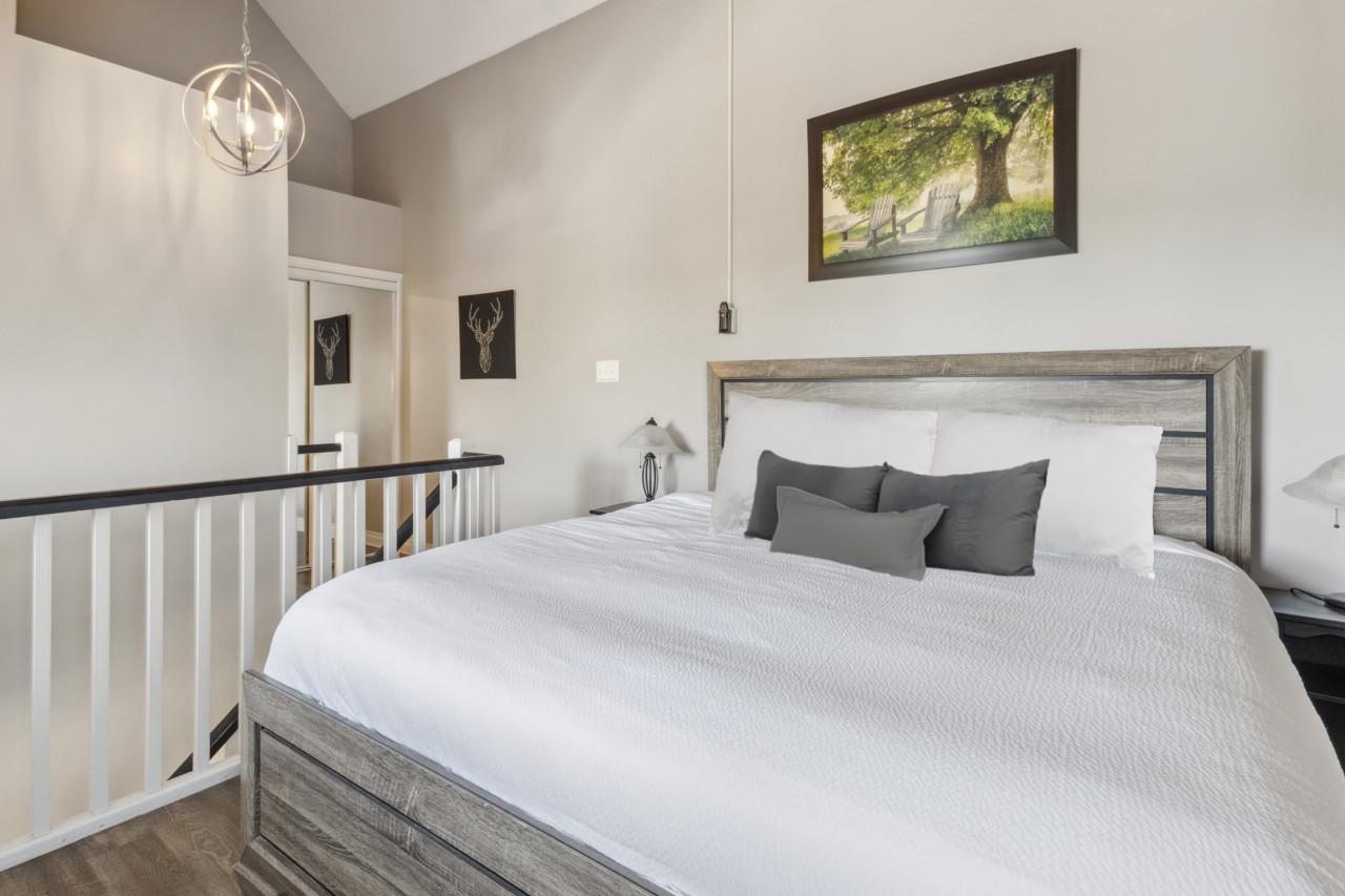 The first sleeping area is on the main floor, where a queen bed is tucked behind the living room. This is not a closed bedroom. The living room couch can transform into a queen size sofa bed for additional sleeping space. There is also a loft-style room on the second floor with a King bed, half wall and ensuite bathroom. The second bathroom in this unit is located on the main floor.