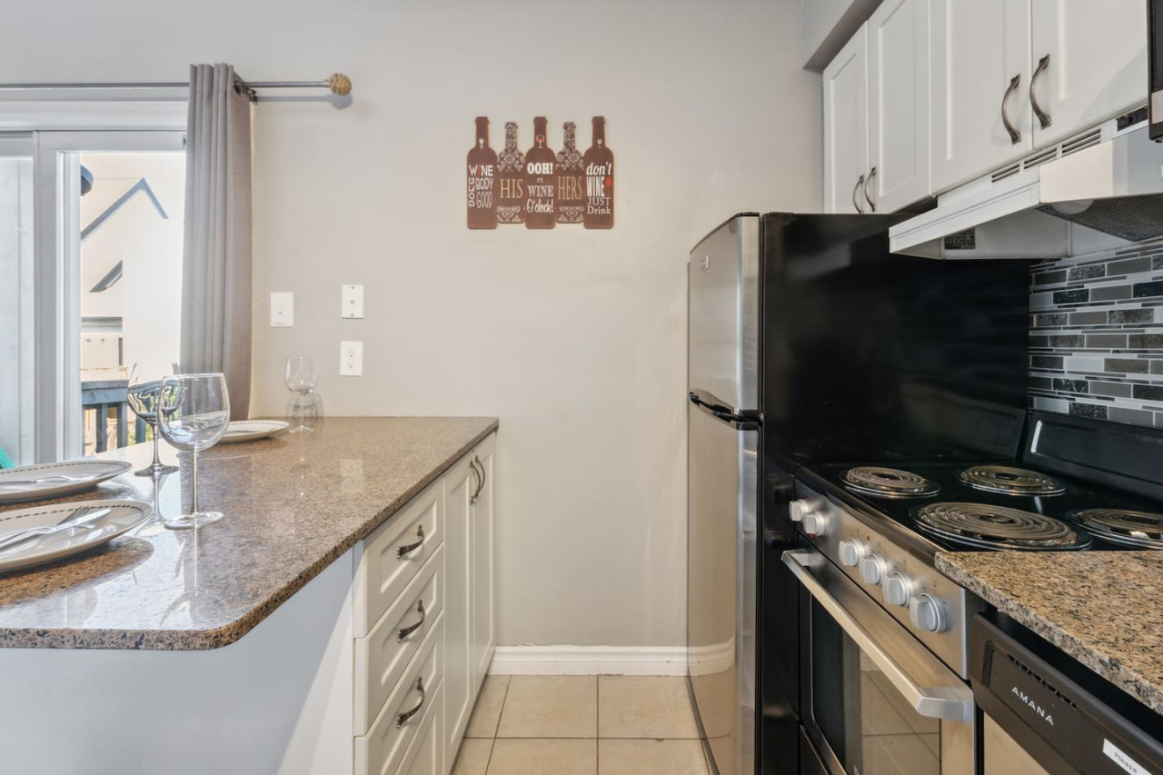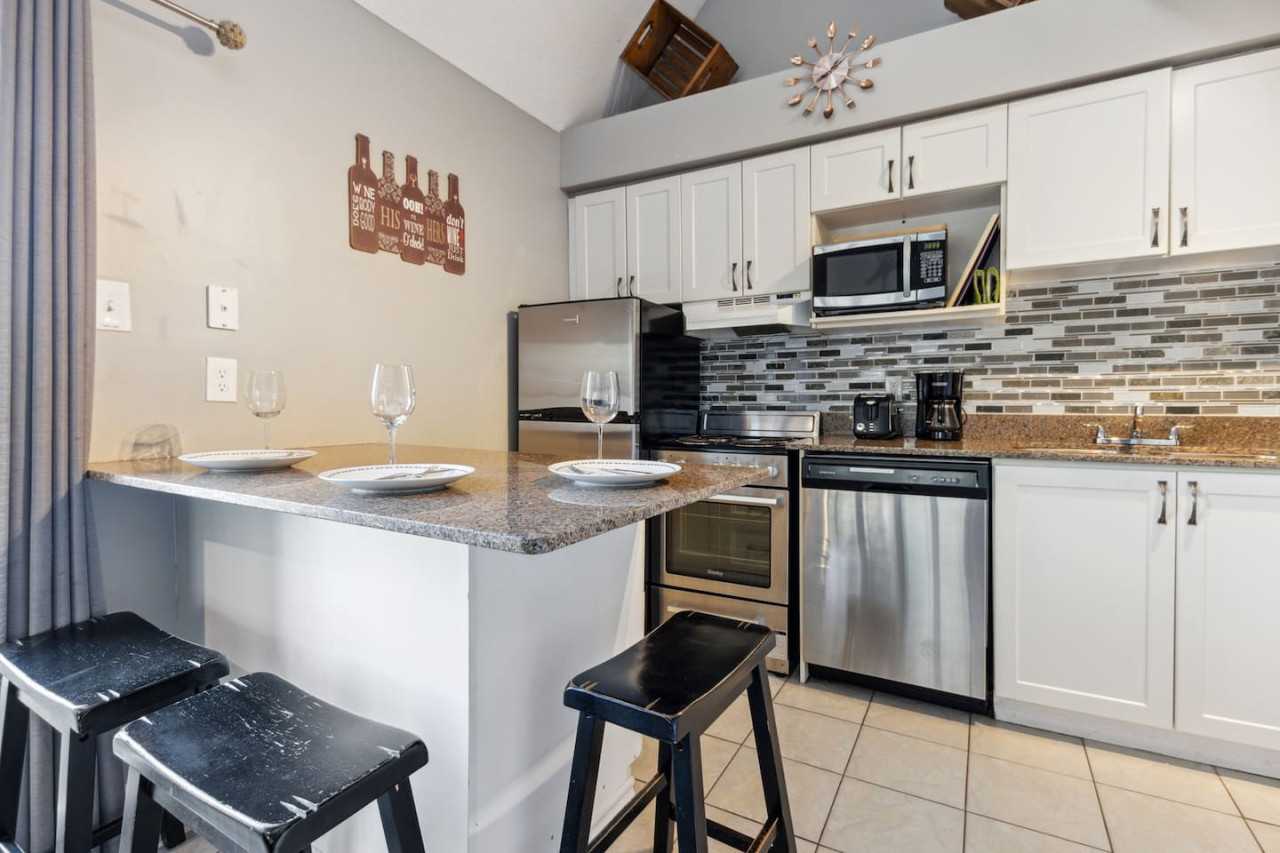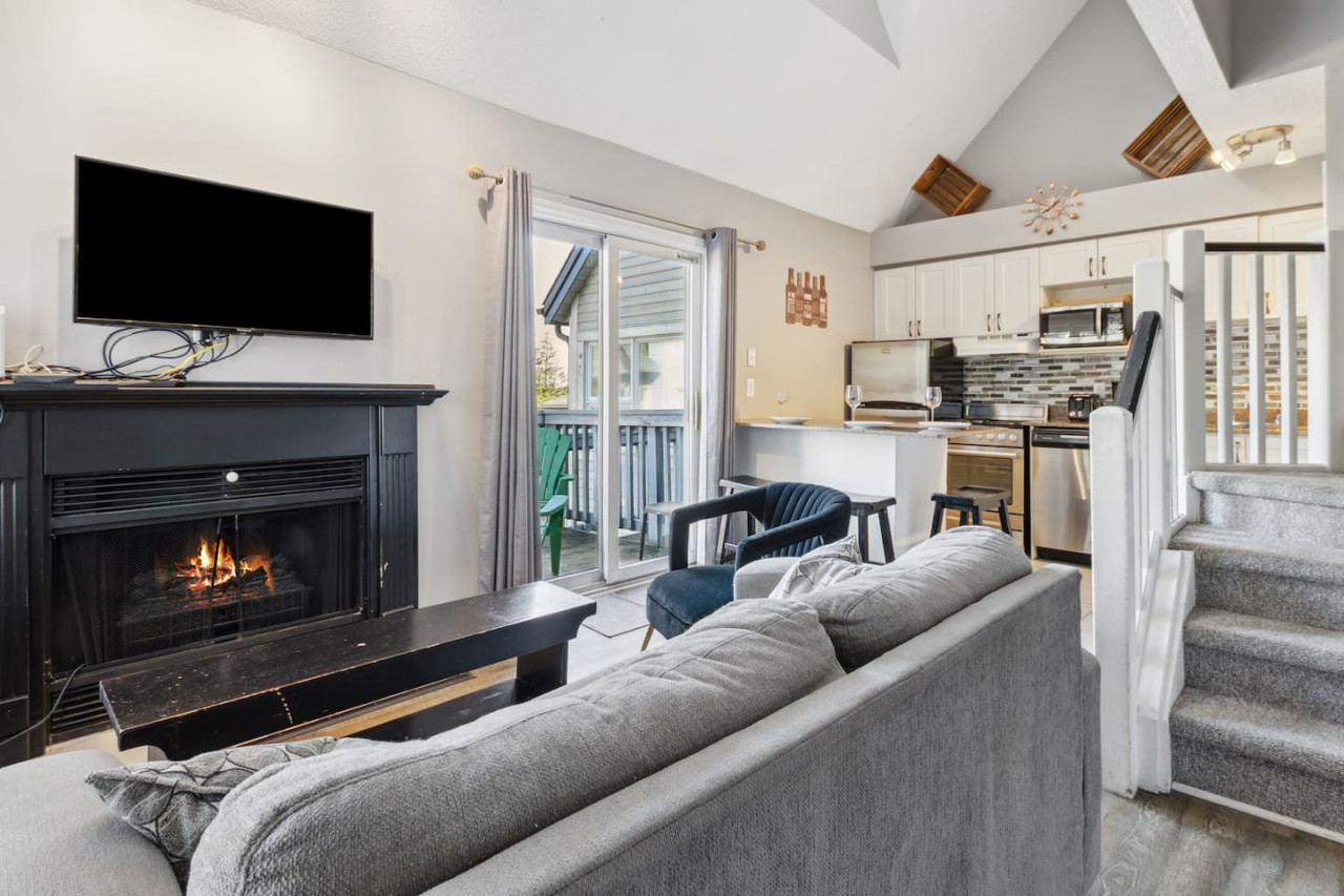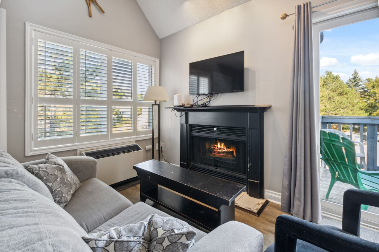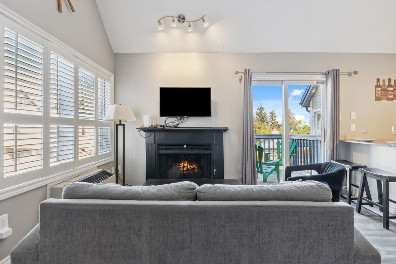 As you enter this home away from home, you’ll be greeted by the main living area with a couch facing the Smart TV with cable and electric fireplace. Relax and take in the natural light as you enjoy some après-ski relaxation. Sliding glass doors lead out to the private balcony.