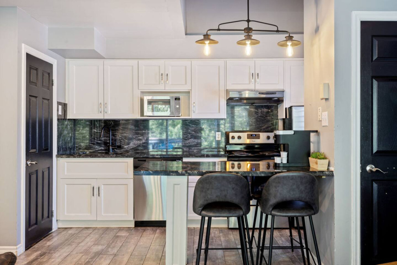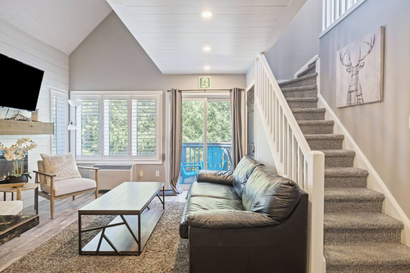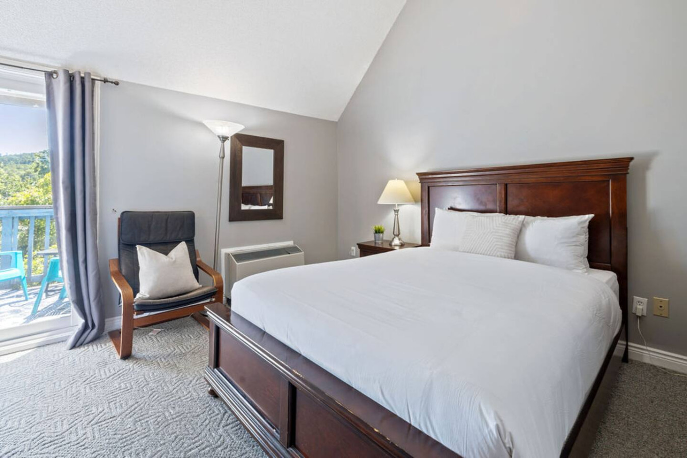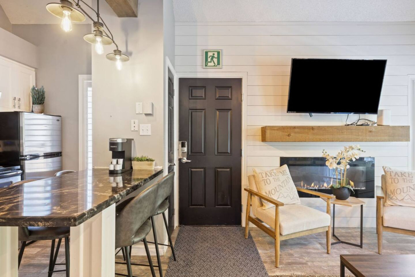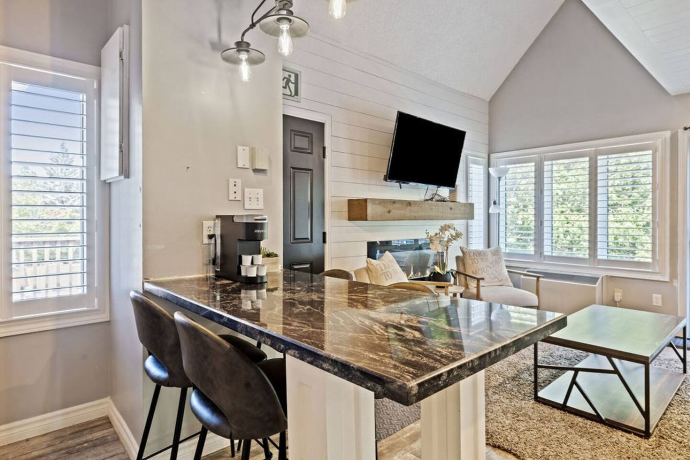 As you arrive at our slopeside retreat, you’ll be greeted by the main living area with a couch facing the Smart TV with cable and electric fireplace. Relax and take in the natural light as you enjoy some après-ski relaxation. Sliding doors lead out to the private balcony overlooking the resort pool and hot tub.
