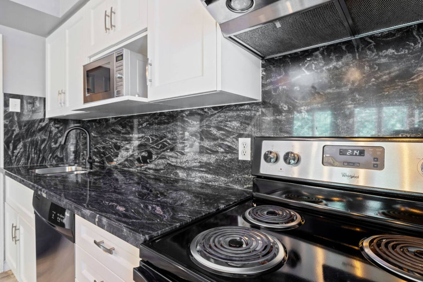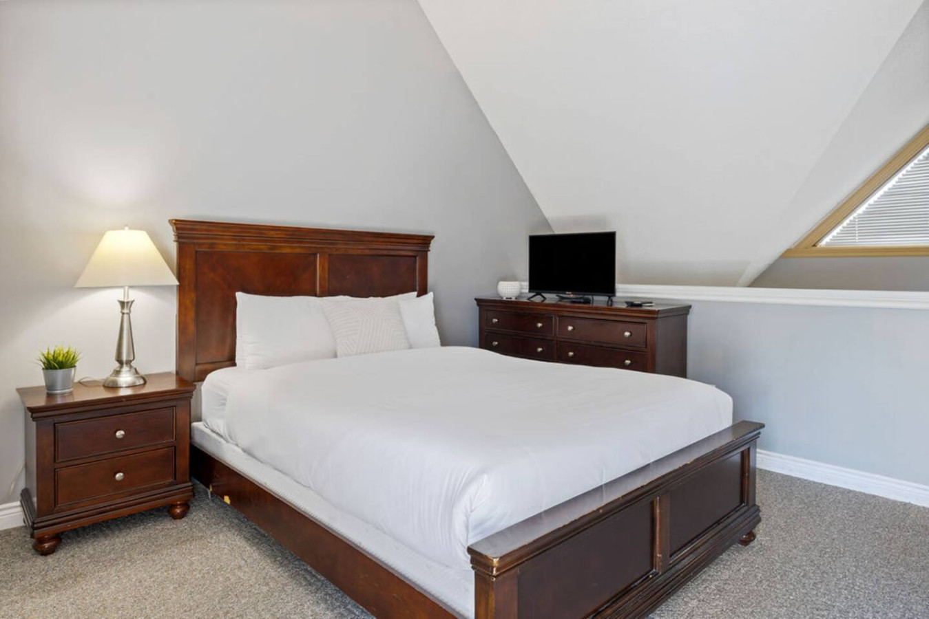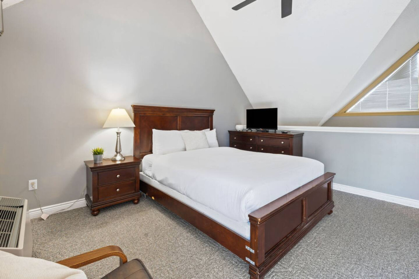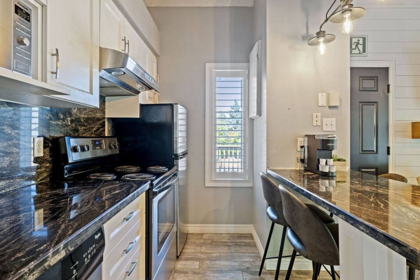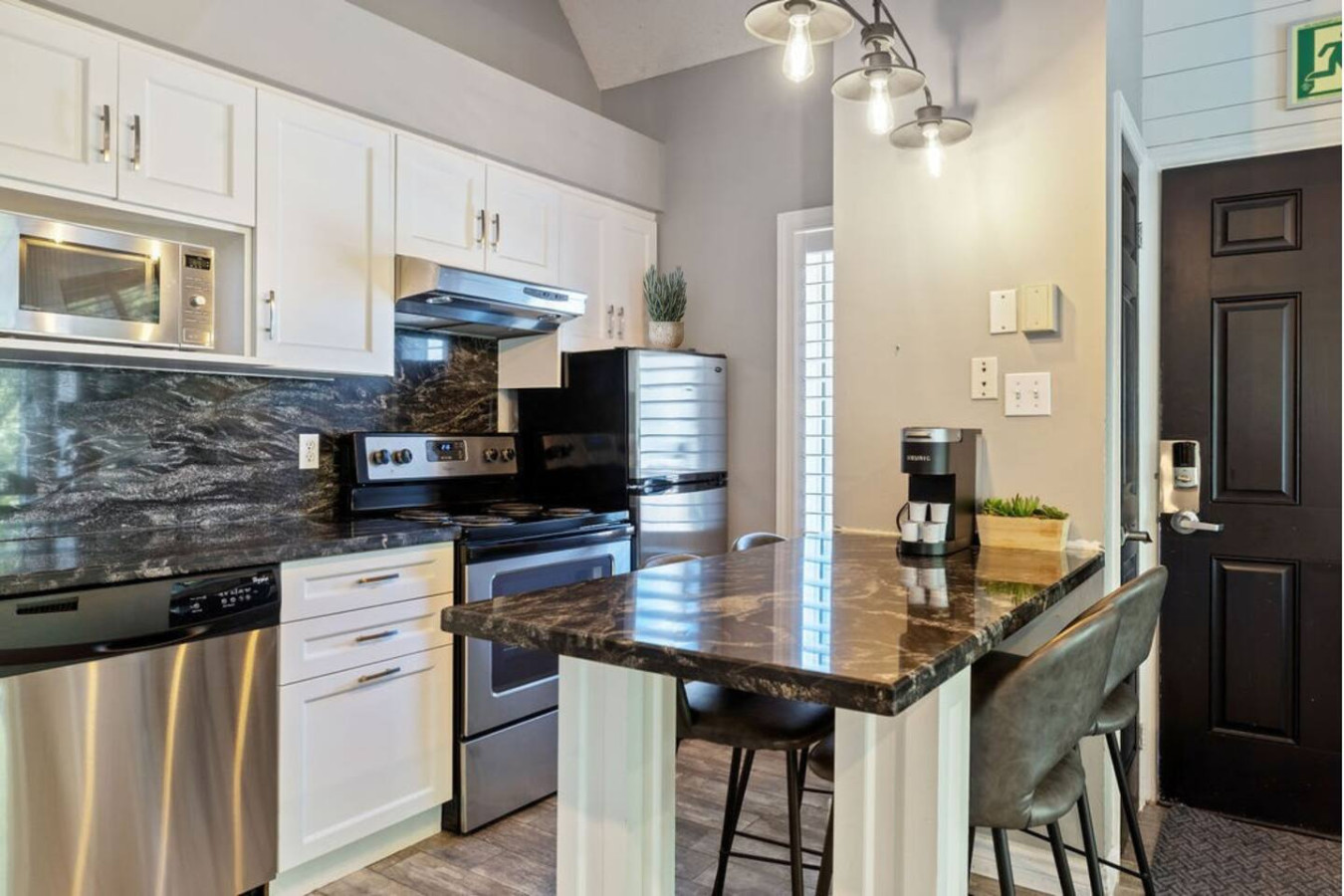 As you arrive at our slopeside retreat, you’ll be greeted by the main living area with a couch facing the Smart TV with cable and electric fireplace. Relax and take in the natural light as you enjoy some après-ski relaxation. Sliding doors lead out to the private balcony overlooking the resort pool and hot tub.