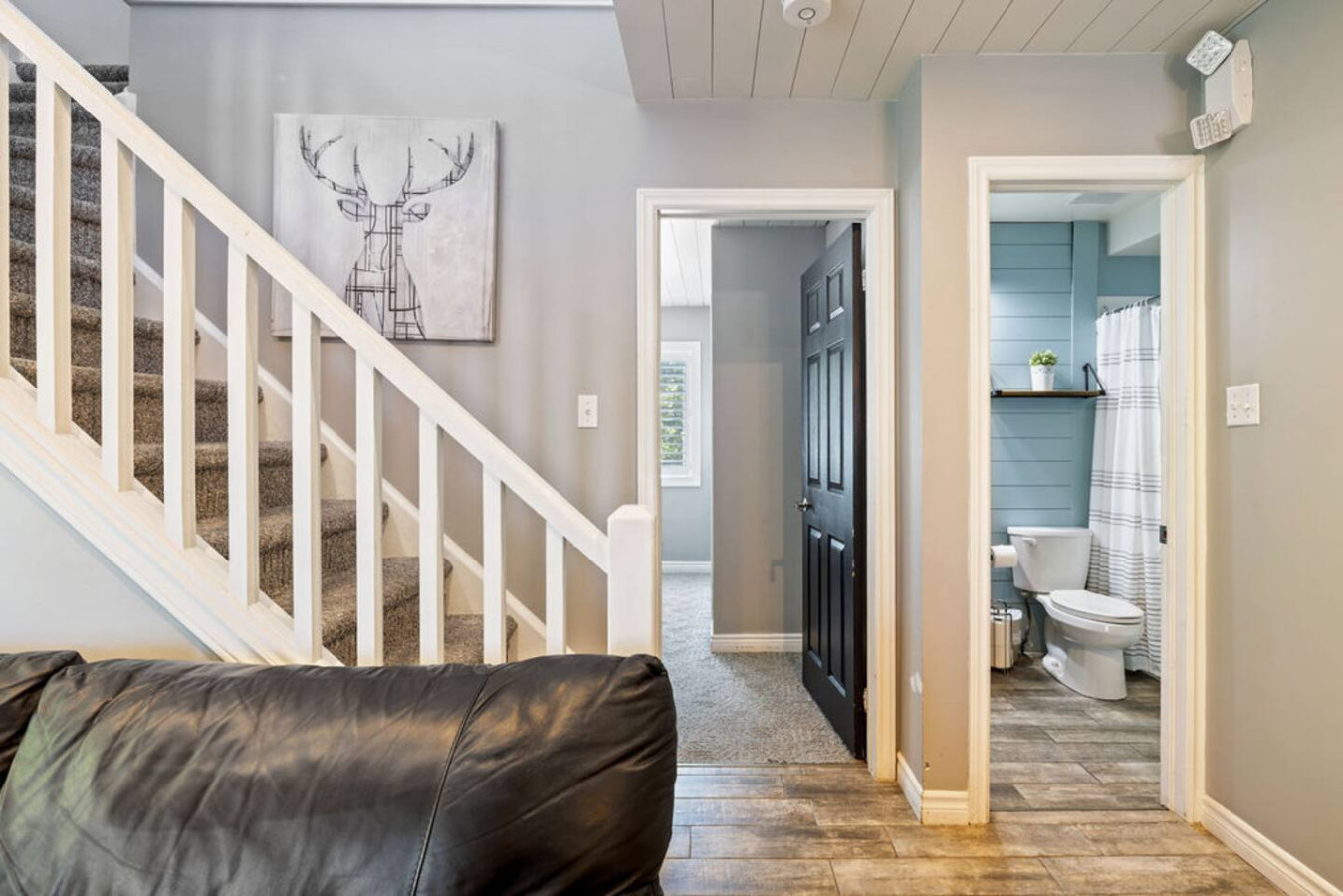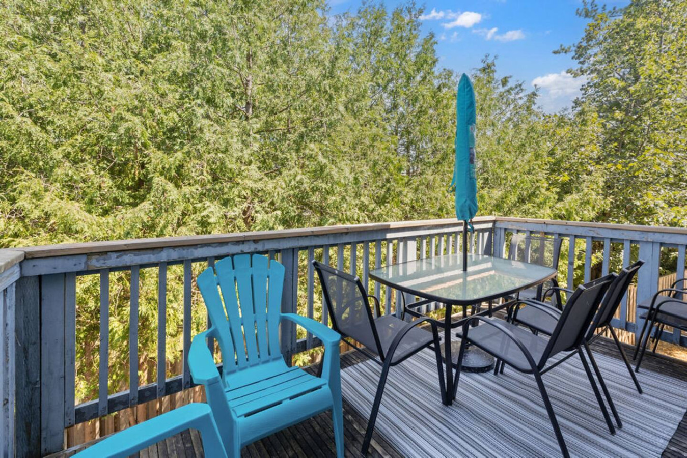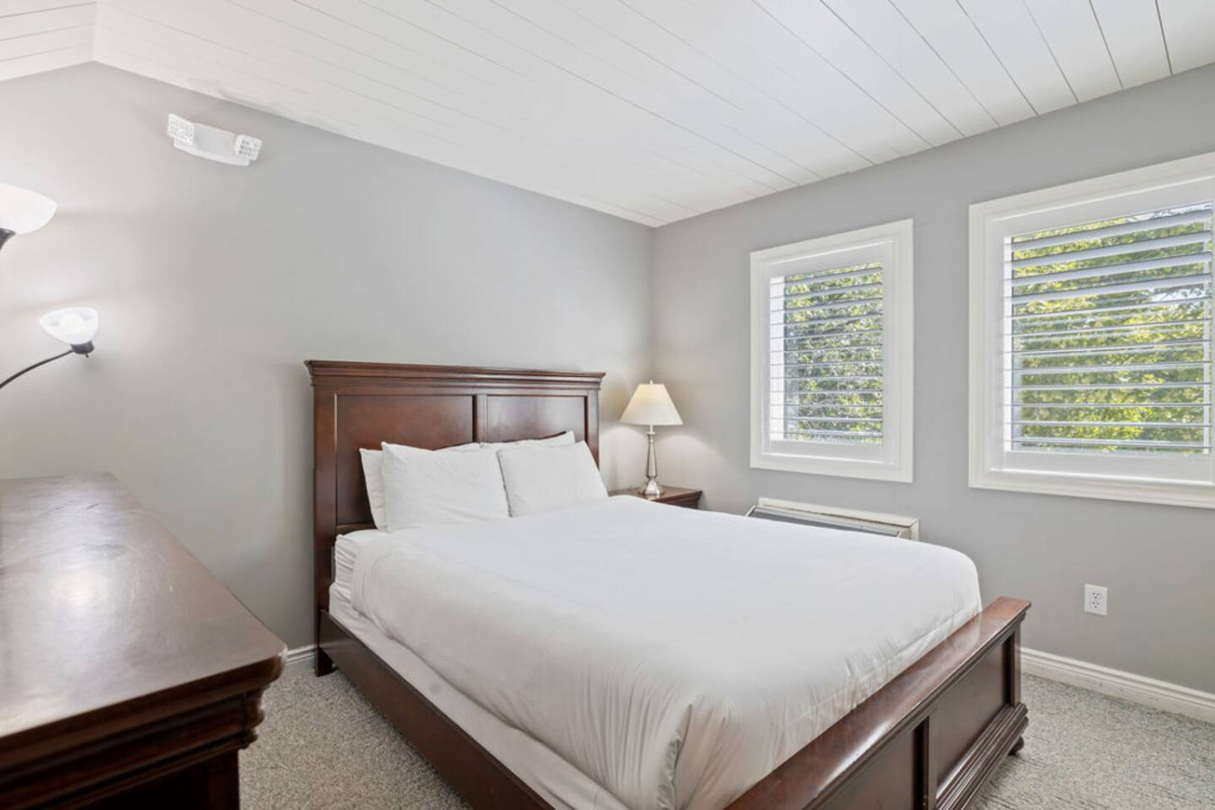 The first sleeping area is on the main floor, where a queen bed is tucked behind the living room. The living room couch can also transform into a double size sofa bed for additional sleeping space. There is also a loft-style room on the second floor with a queen bed, half wall, and ensuite bathroom. The second bathroom in this unit is located on the main floor.
