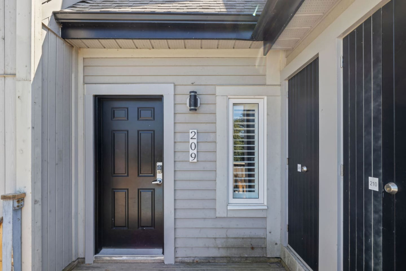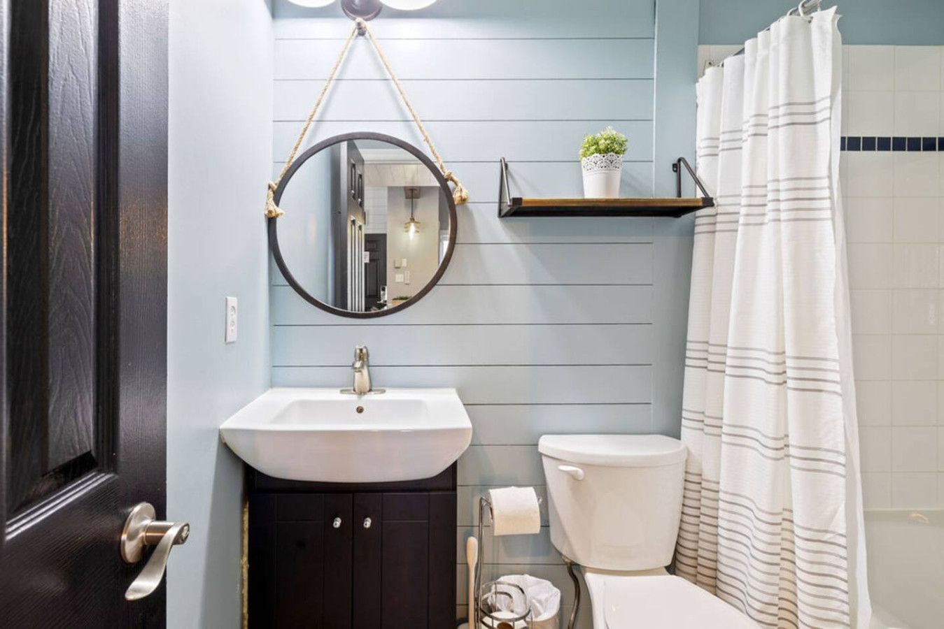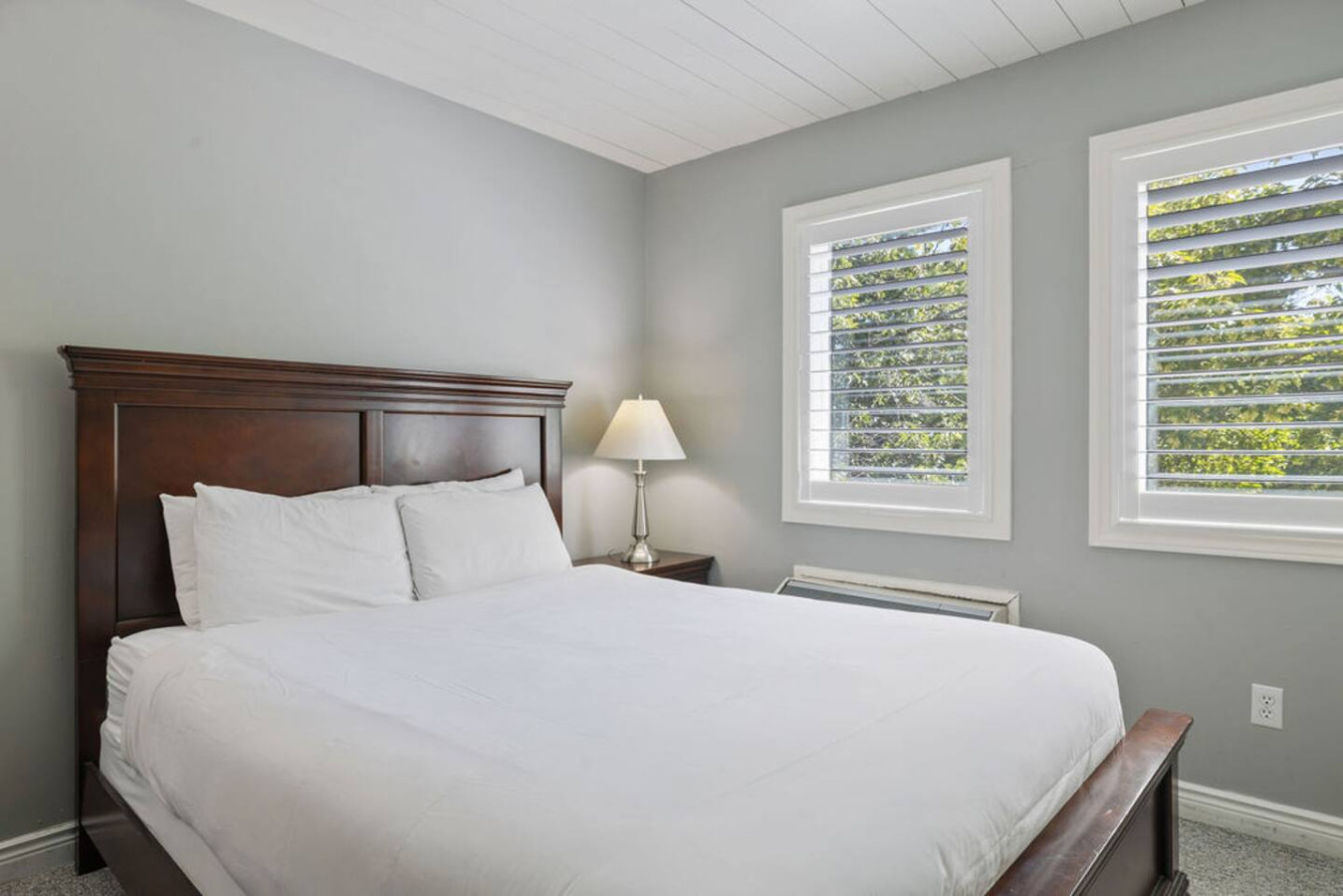 The first sleeping area is on the main floor, where a queen bed is tucked behind the living room. The living room couch can also transform into a double size sofa bed for additional sleeping space. There is also a loft-style room on the second floor with a queen bed, half wall, and ensuite bathroom. The second bathroom in this unit is located on the main floor.