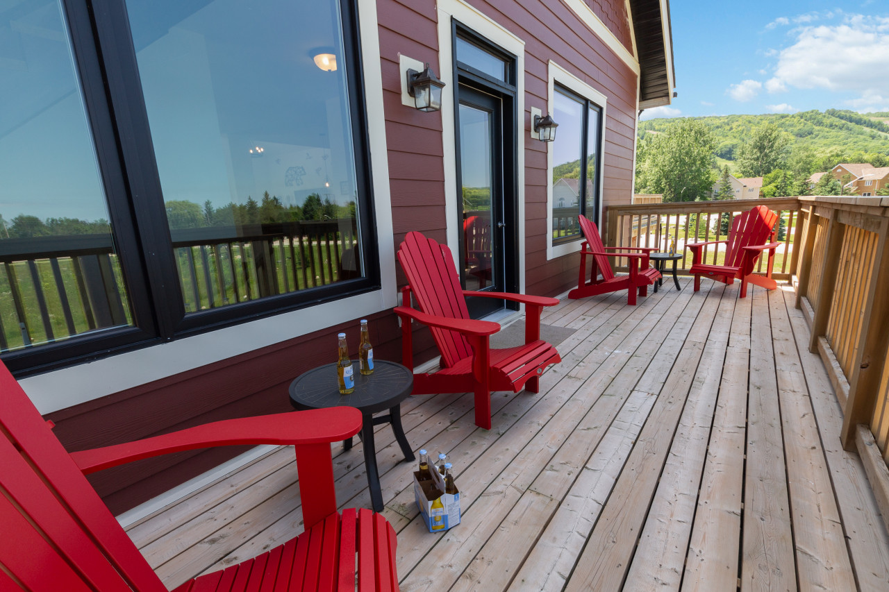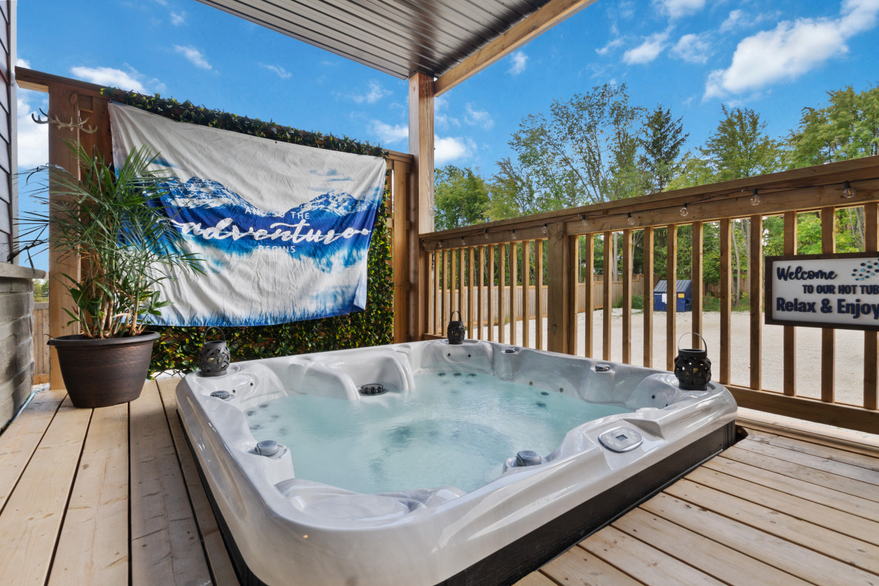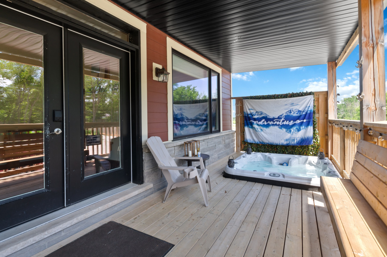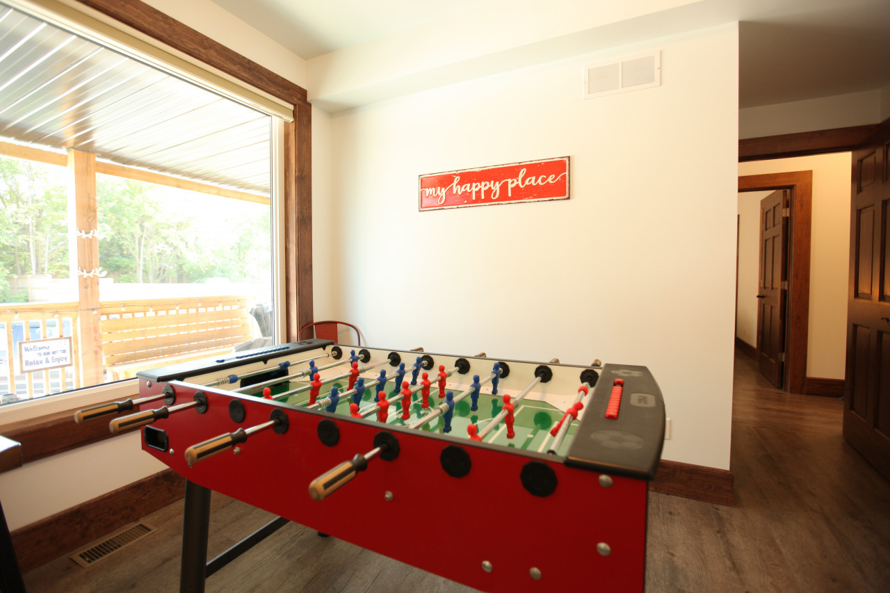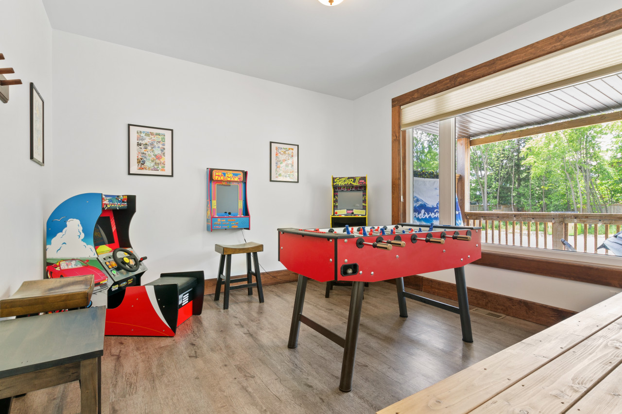 As you walk onto the main floor, you’re greeted with 3 bedrooms, all with ensuite privilege. Making your way to the back of the home, fun awaits with your own personal arcade, complete with Street Fighter, Miss Pacman and Foosball. Seating is provided throughout the arcade room for guests to enjoy, overlooking the sunken hot tub on the back deck.