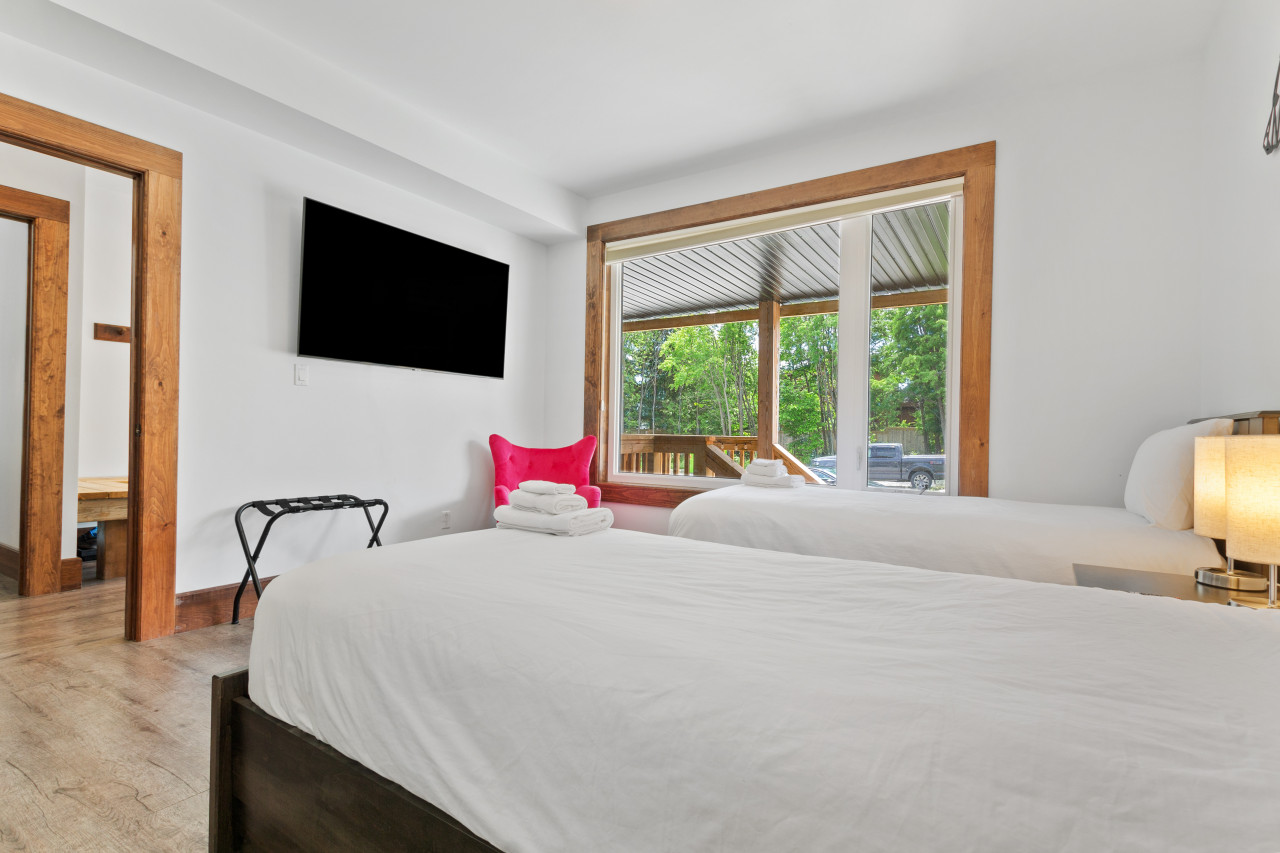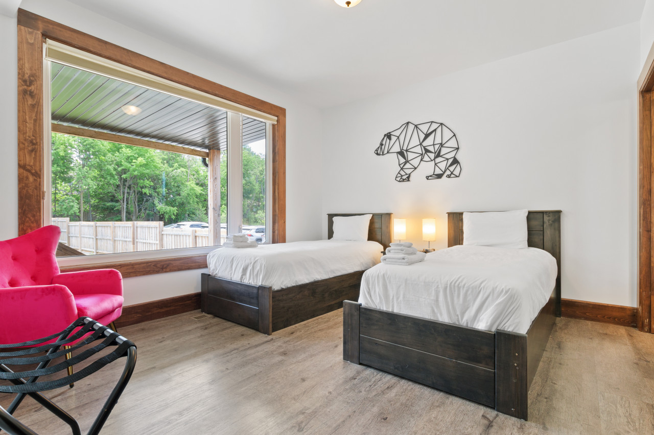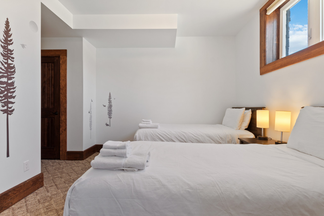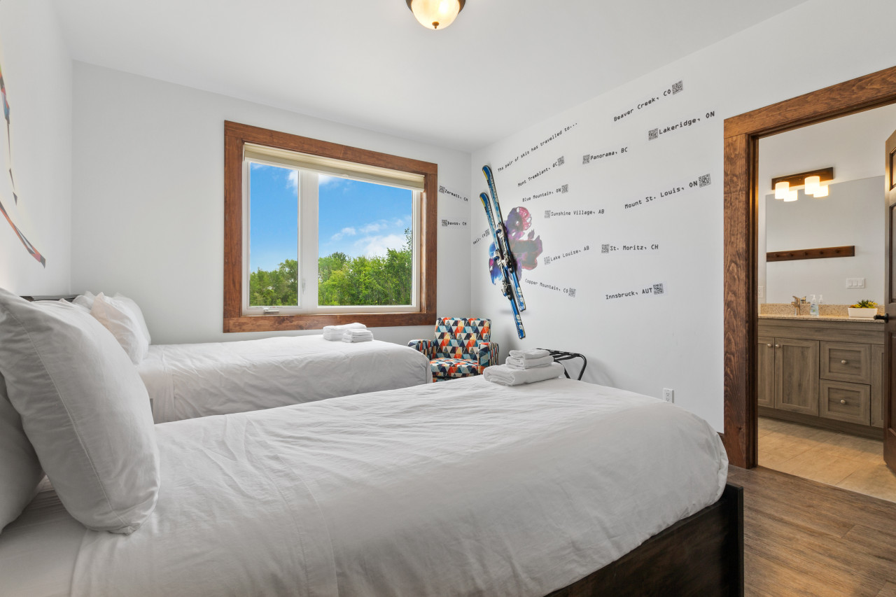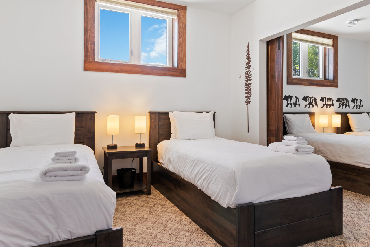 You’ll find 4 more bedrooms with light pouring in through the oversized windows on the lower level. The first hosts a double and single bed, leading to a 3 piece ensuite with a walk-in shower. The second lower bedroom offers 2 single beds, guiding you through barn doors to another bedroom with 2 single beds connecting to a 3 piece ensuite. The final bedroom contains 1 double and 1 single bed leading to a 3 pc ensuite.