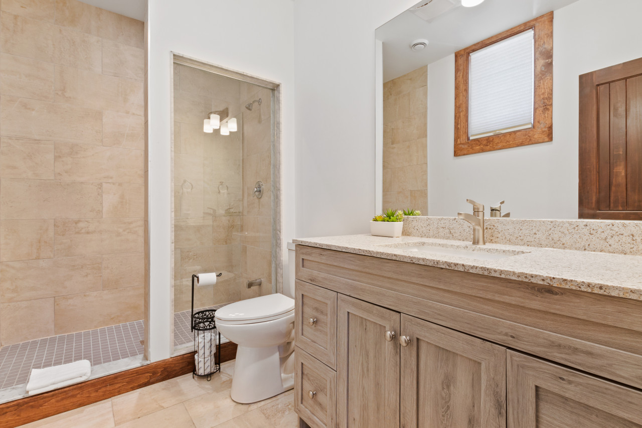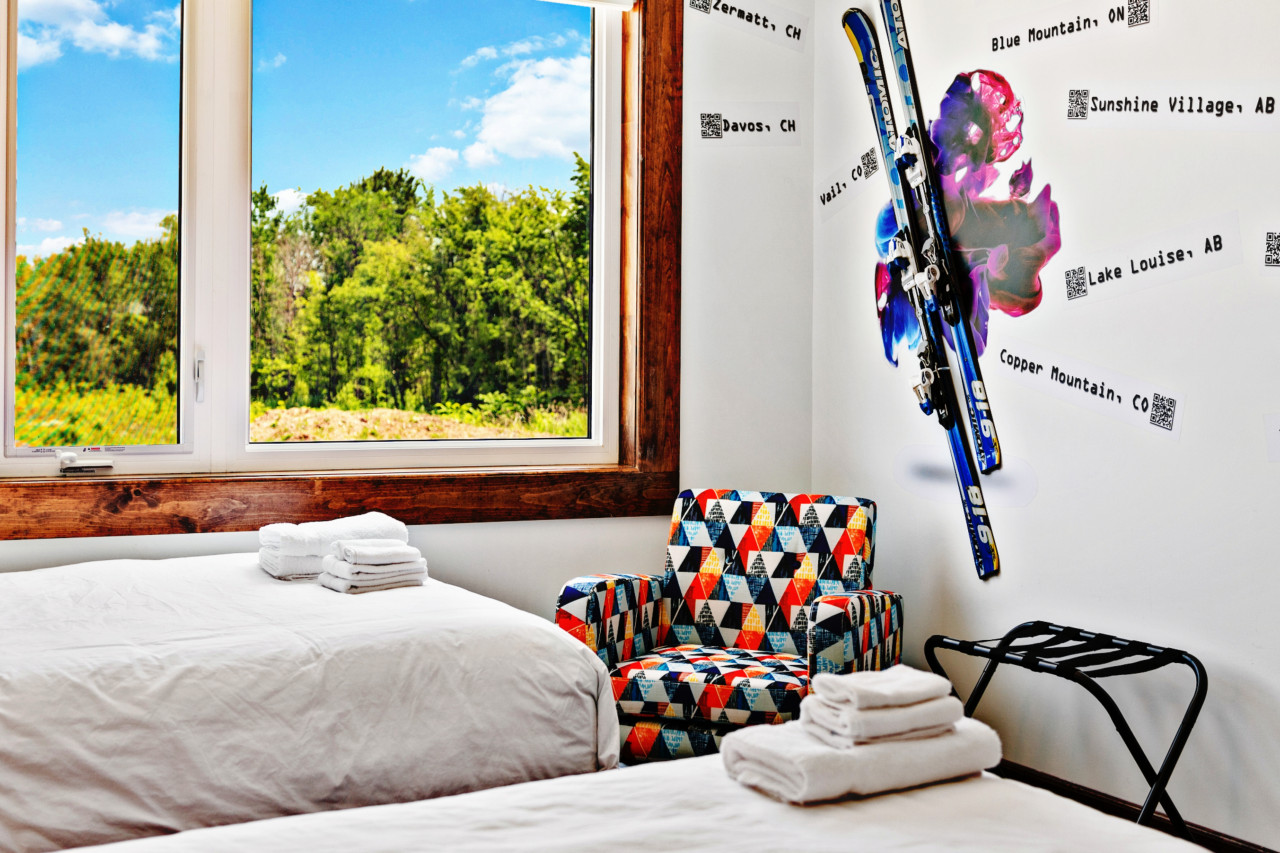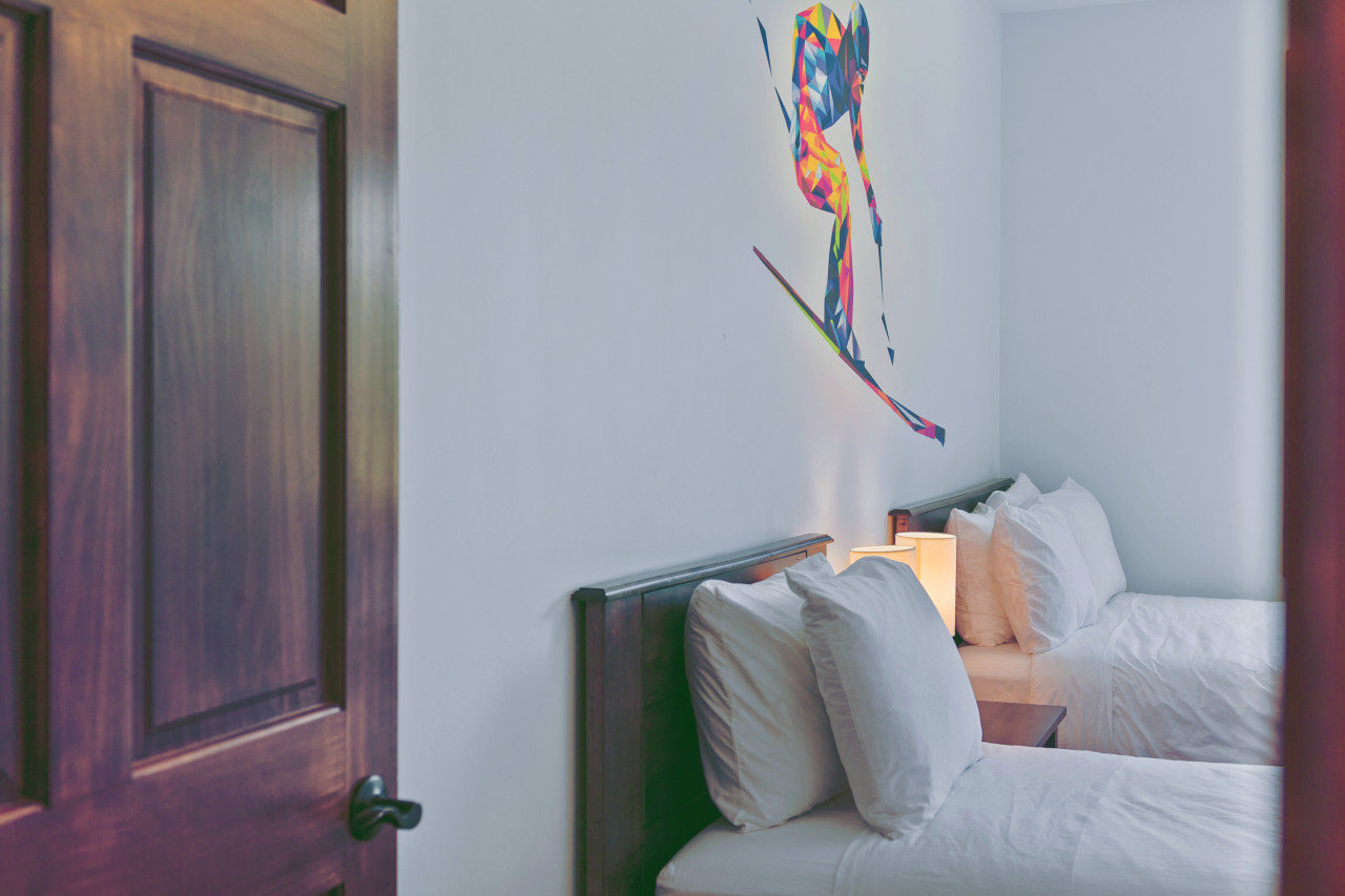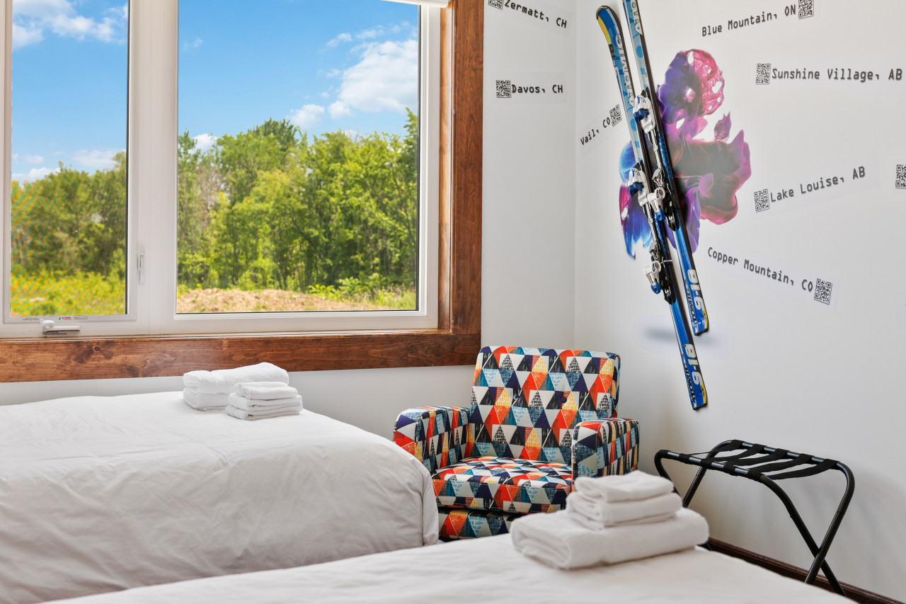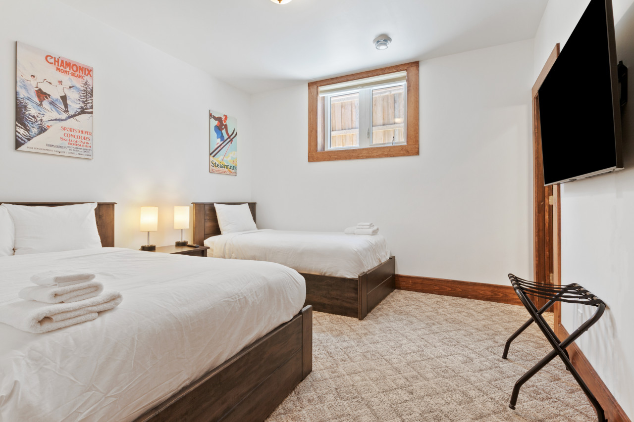 You’ll find 4 more bedrooms with light pouring in through the oversized windows on the lower level. The first hosts a double and single bed, leading to a 3 piece ensuite with a walk-in shower. The second lower bedroom offers 2 single beds, guiding you through barn doors to another bedroom with 2 single beds connecting to a 3 piece ensuite. The final bedroom contains 1 double and 1 single bed leading to a 3 pc ensuite.