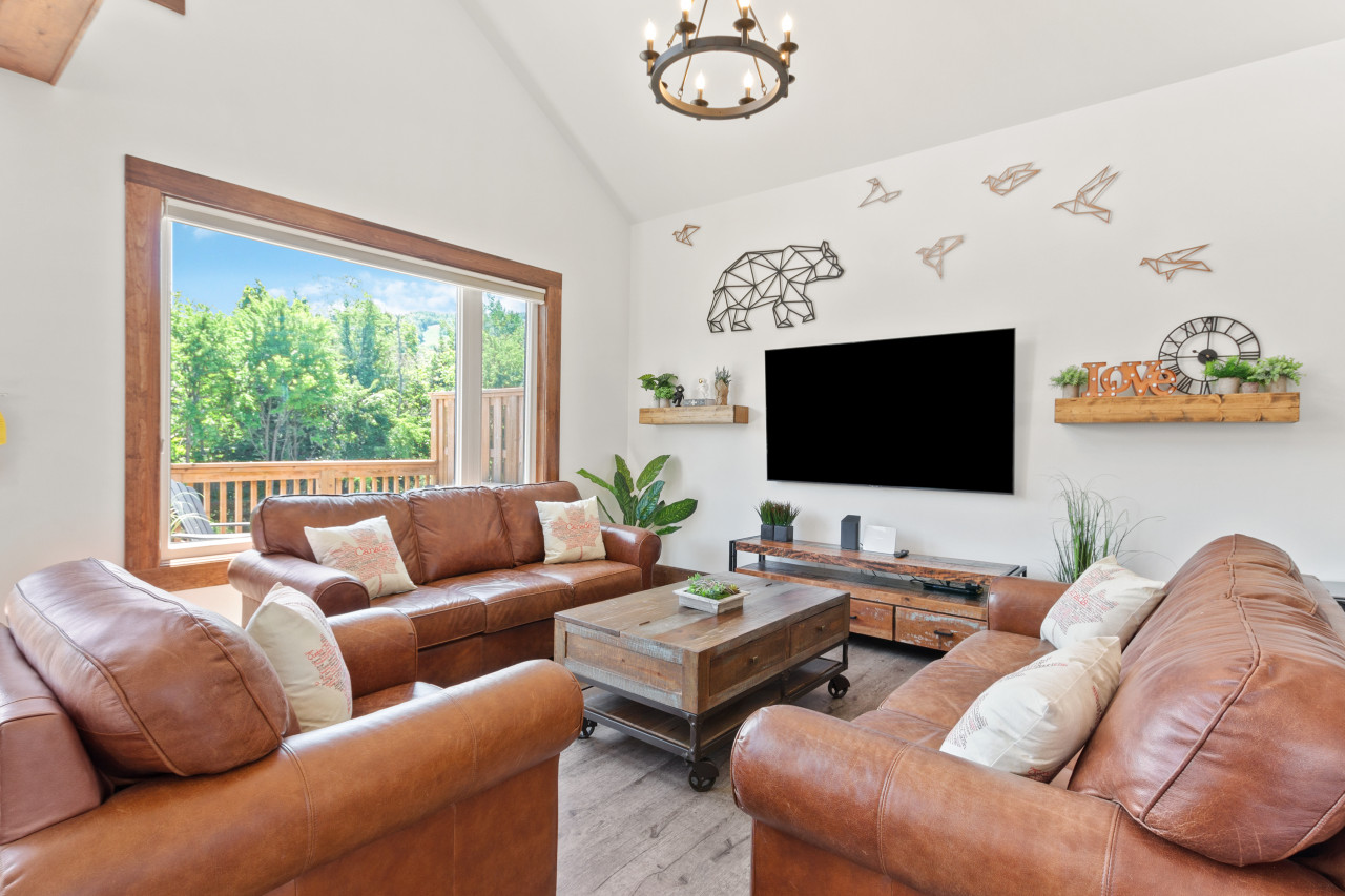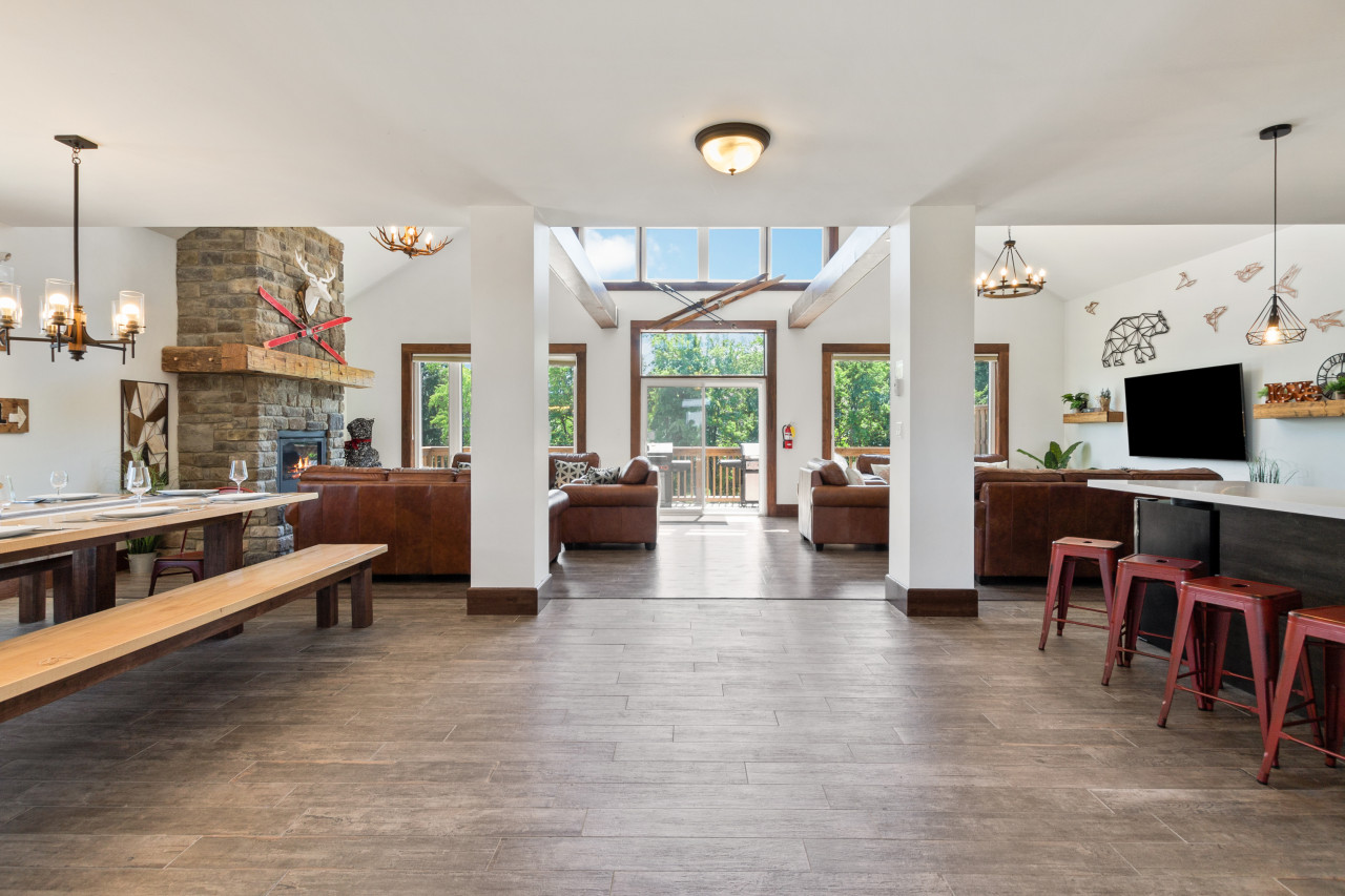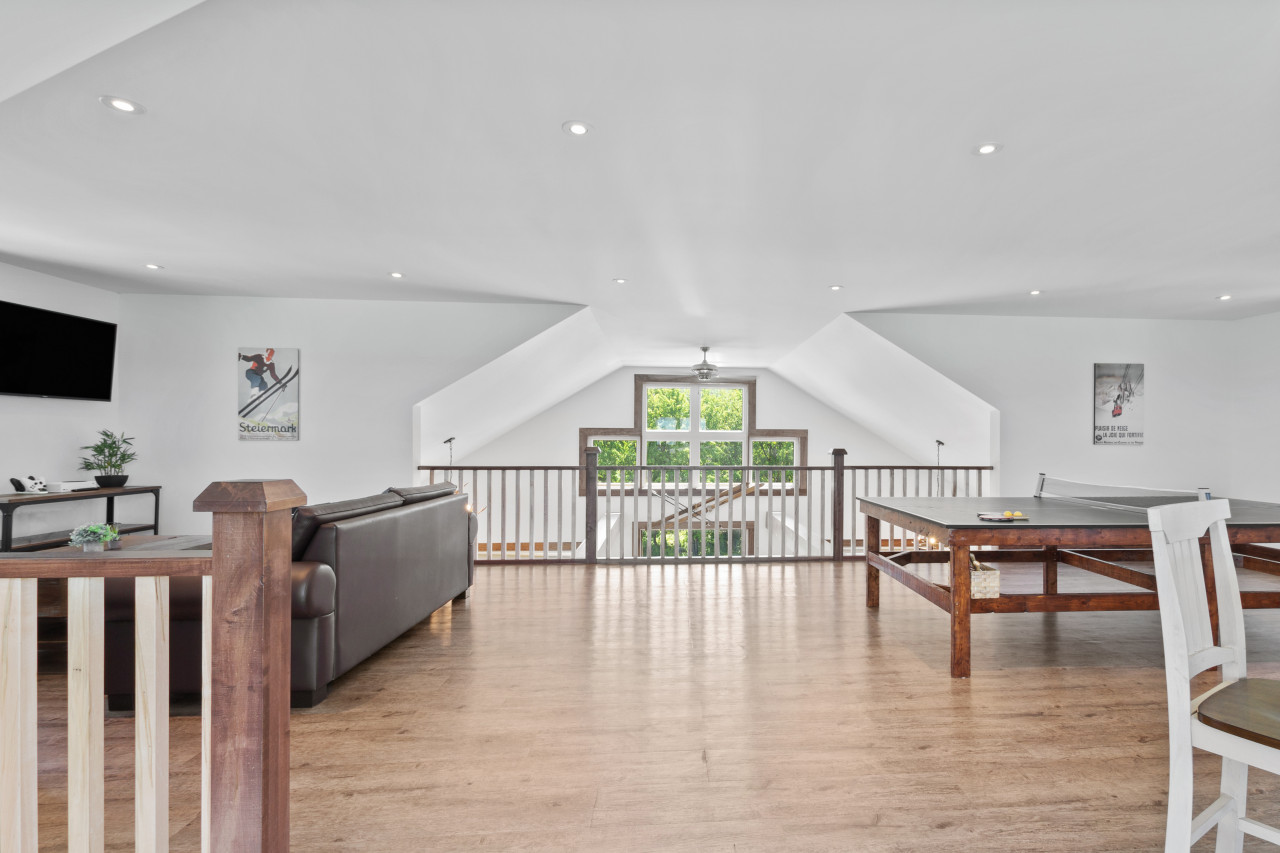 There are dual seating spaces for the Great Room on the second story, with an abundance of light through the floor-to-ceiling window design. Cozy up to an evening of conversation by the brick wall fireplace, designed with wood beams and an outdoorsy theme throughout. On the other side, you’ll find an entertainment space for an evening in or quiet mornings by the large TV under the stunning chandelier. You’ll feel surrounded by nature with views of mature trees from the windows, leading to the back deck with plenty of seating. On the third story, you’ll find an additional loft/living space with a TV, Ping-Pong table and seating throughout.
