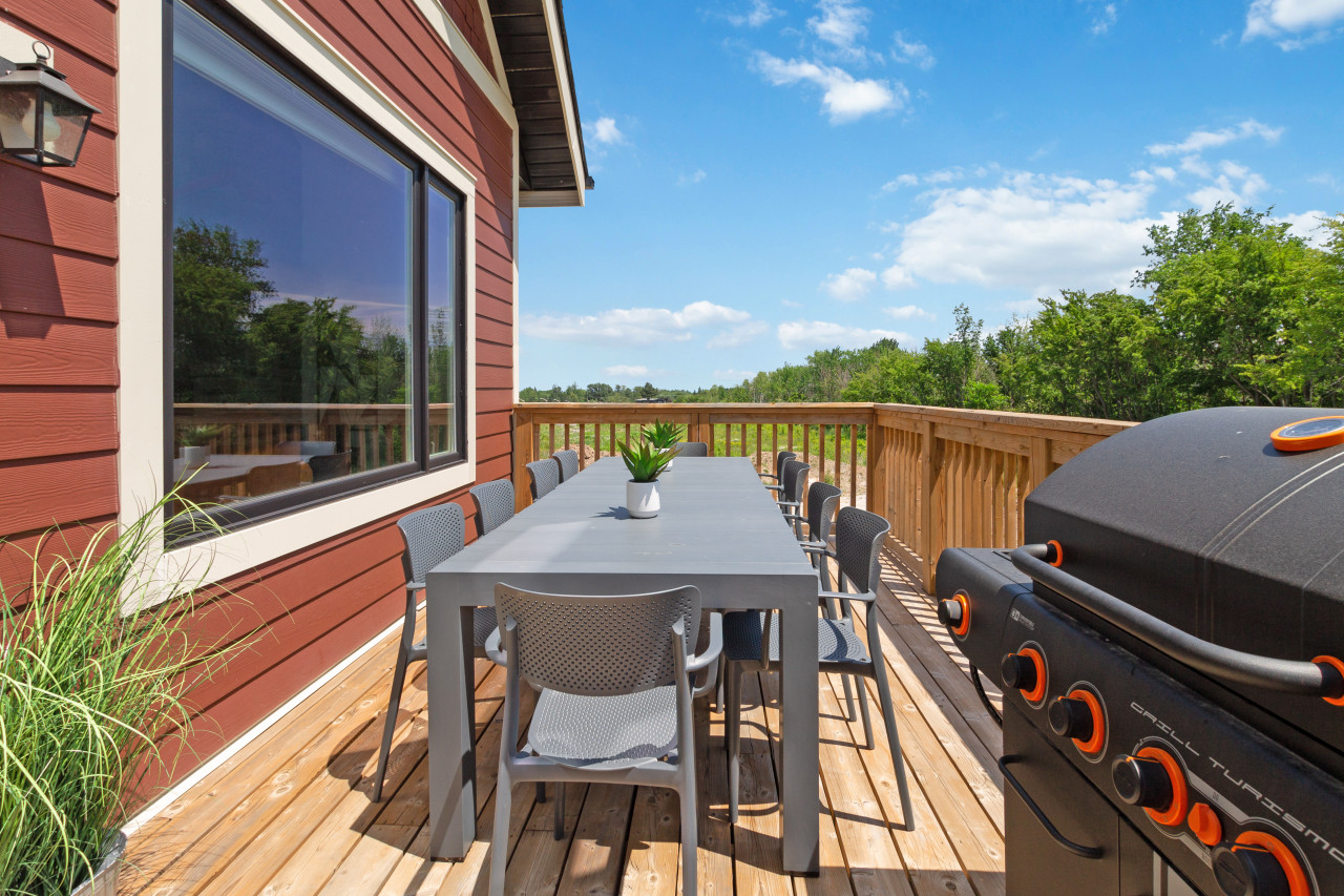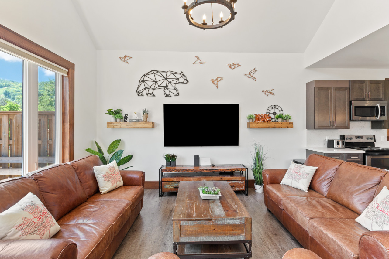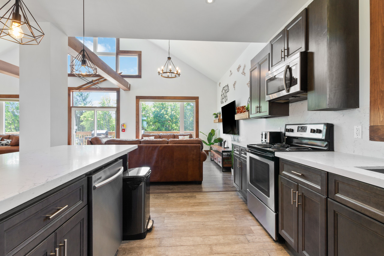 There are dual seating spaces for the Great Room on the second story, with an abundance of light through the floor-to-ceiling window design. Cozy up to an evening of conversation by the brick wall fireplace, designed with wood beams and an outdoorsy theme throughout. On the other side, you’ll find an entertainment space for an evening in or quiet mornings by the large TV under the stunning chandelier. You’ll feel surrounded by nature with views of mature trees from the windows, leading to the back deck with plenty of seating. On the third story, you’ll find an additional loft/living space with a TV, Ping-Pong table and seating throughout.