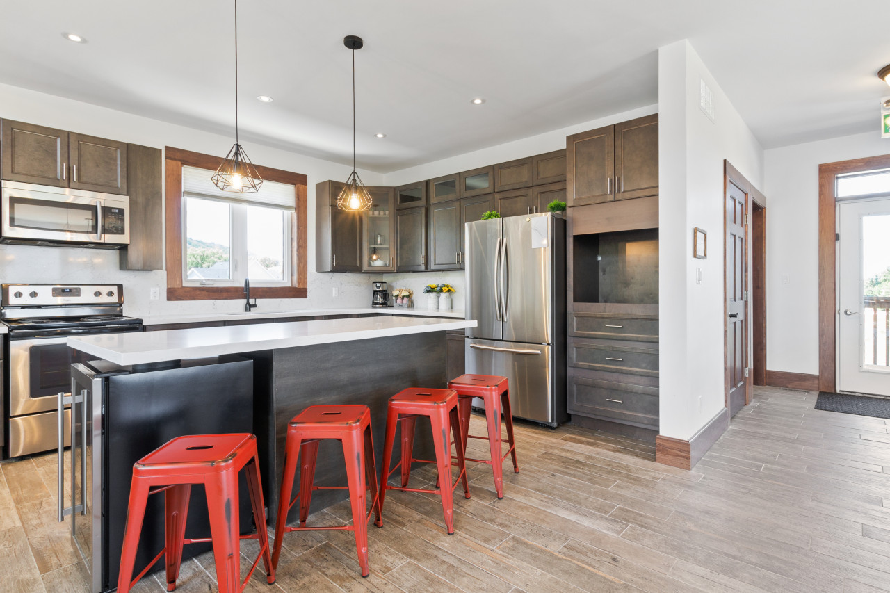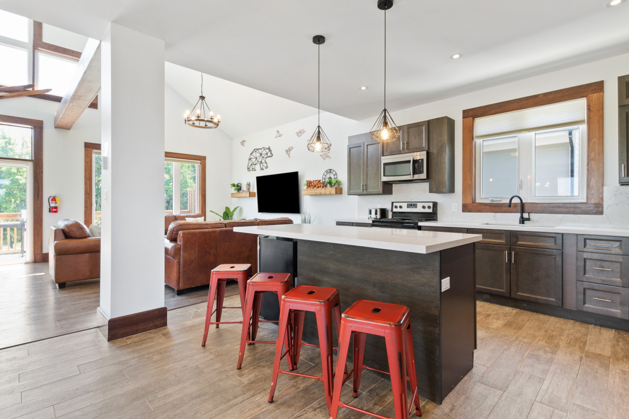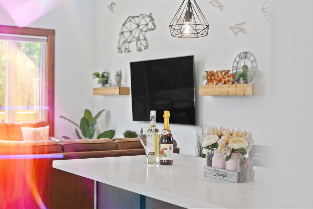 The kitchen isn’t the only show-stopper in this home, and the designer lighting adds to its charm. Enjoy the ease of breakfast at the counter with barstools while cooking with stainless steel appliances. A large fridge complete with an oversized freezer and a smaller beverage fridge allows guests to pack with an appetite. Floor to ceiling cupboards offer plenty of storage for all your dietary needs but leave the basics at home. We have you covered! Aside from spices and coffee, this kitchen is fully equipped, containing everything you need, from cookware, bakeware, cutlery, utensils, to even BBQ tools.