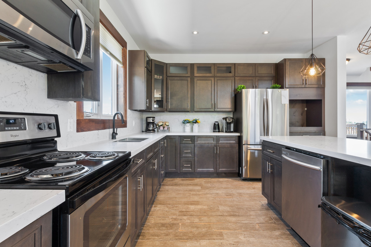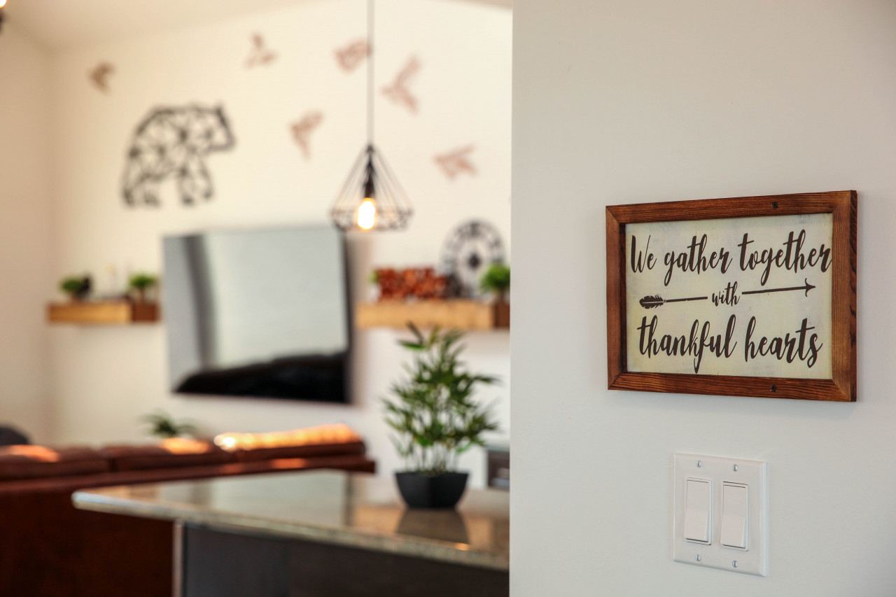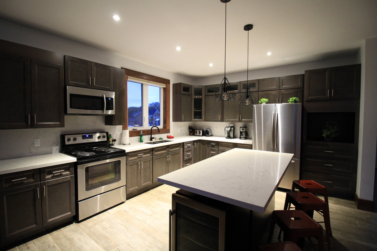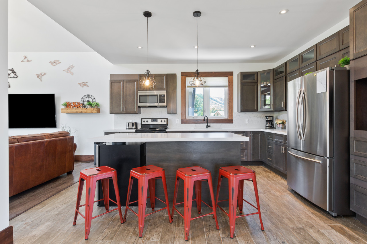 The kitchen isn’t the only show-stopper in this home, and the designer lighting adds to its charm. Enjoy the ease of breakfast at the counter with barstools while cooking with stainless steel appliances. A large fridge complete with an oversized freezer and a smaller beverage fridge allows guests to pack with an appetite. Floor to ceiling cupboards offer plenty of storage for all your dietary needs but leave the basics at home. We have you covered! Aside from spices and coffee, this kitchen is fully equipped, containing everything you need, from cookware, bakeware, cutlery, utensils, to even BBQ tools.