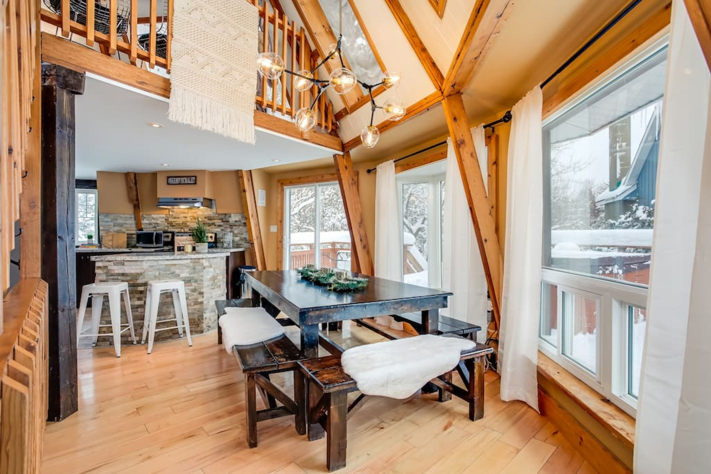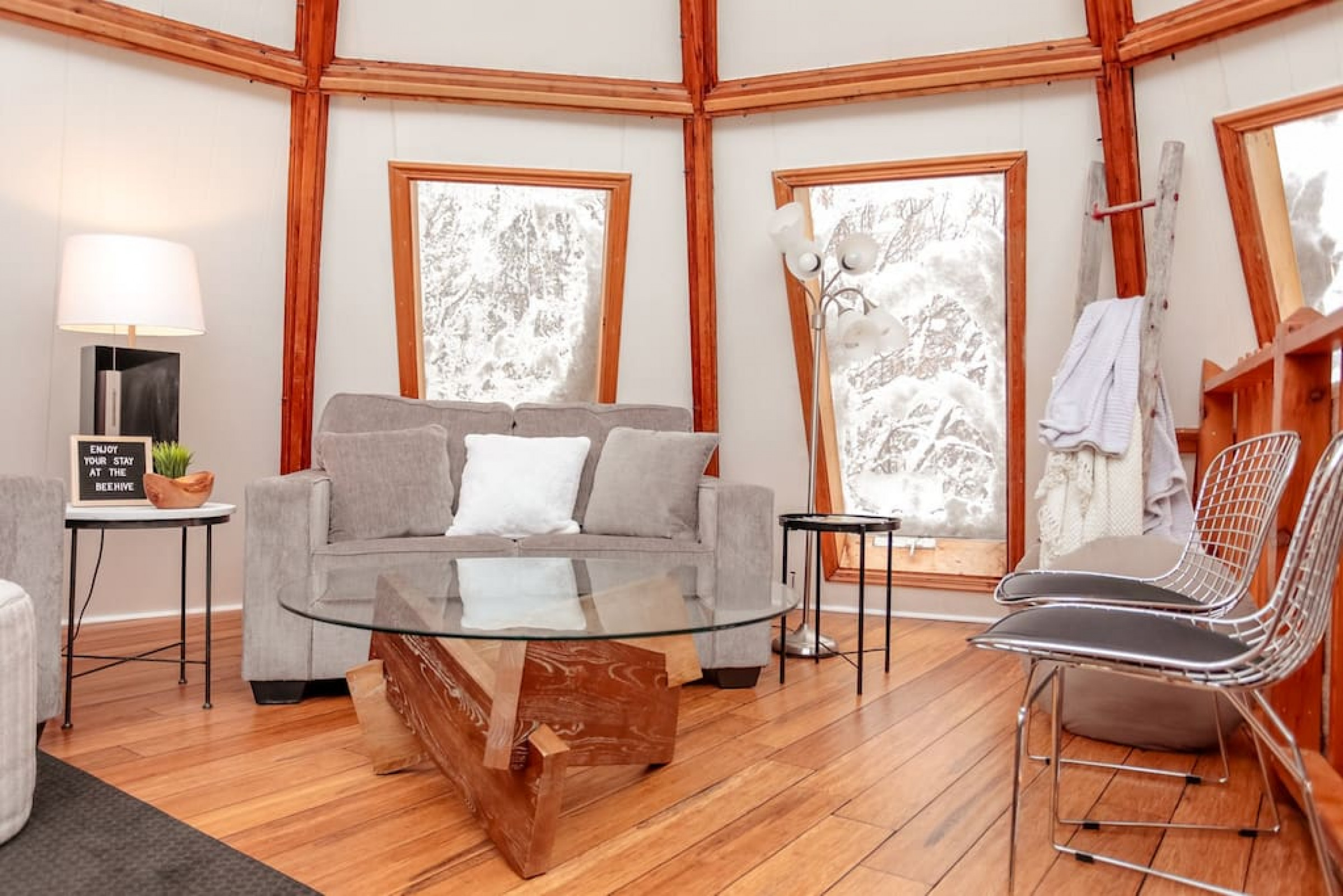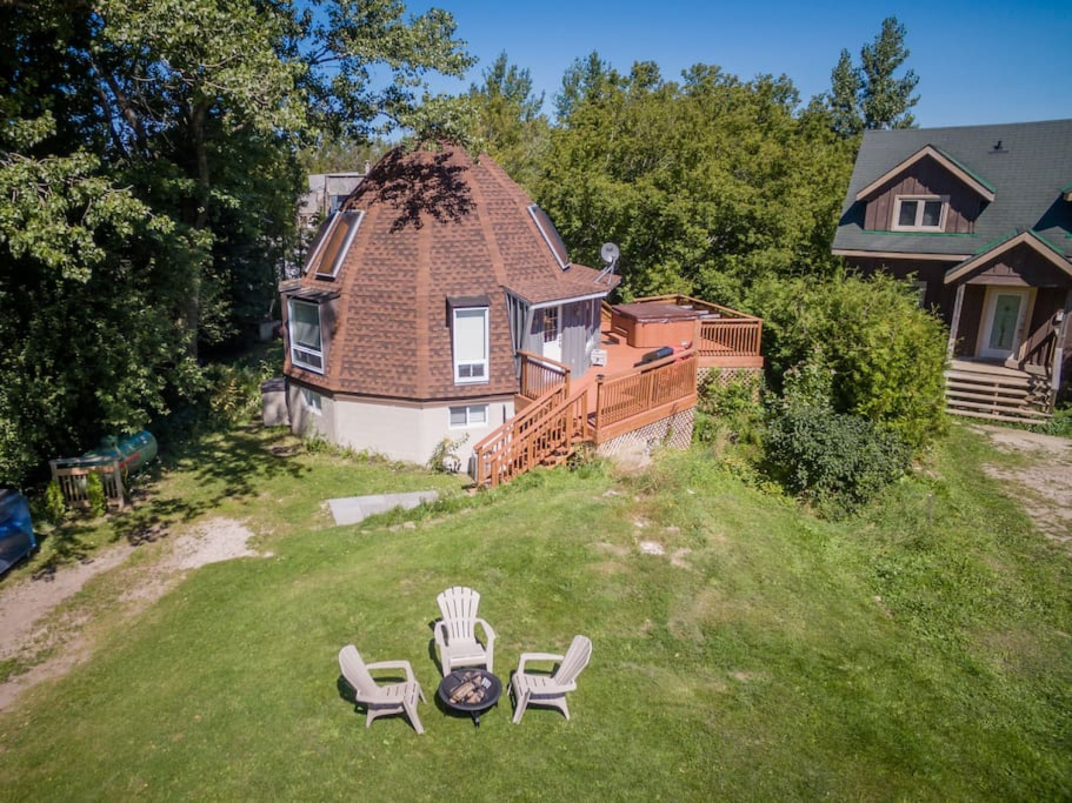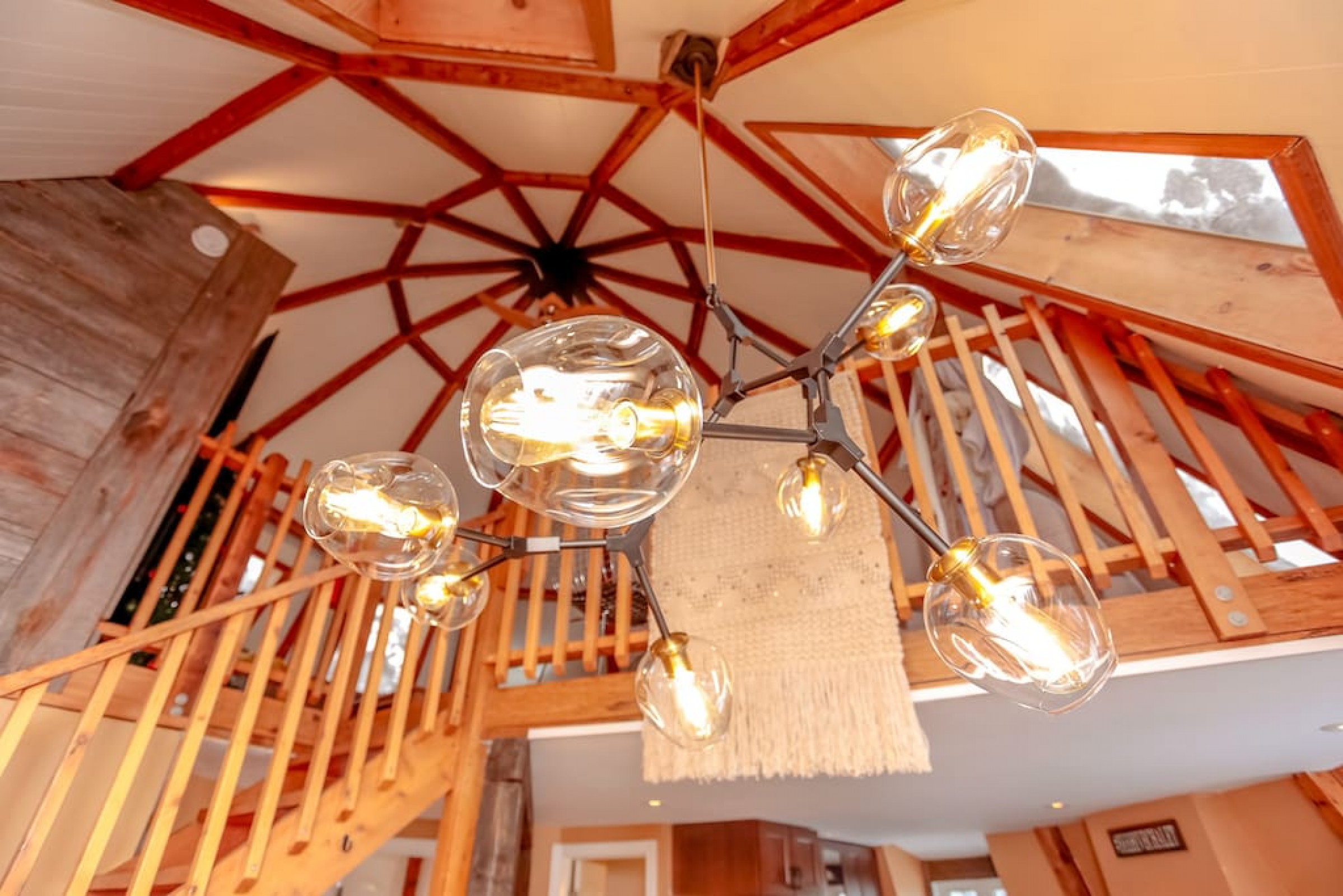 The Beehive is best known for its unique curb appeal, but wait until you see the inside. It is lovingly styled with a Boho-Scandi inspired vibe. The vaulted circular ceilings are stunning and let in tons of natural light. All six bedrooms have rounded walls- no two are alike. There are two full washrooms each with an upright shower. The living room is located in the upper loft and features a flat screen tv, fireplace insert and skylights that let in tons of natural light! The open concept kitchen & dining area is a great place to host an intimate dinner party or brunch. The breakfast bar makes entertaining easy and social. There is a wrap around deck with a small dining set, hot tub and BBQ . The firepit on the front lawn is yours to enjoy (BYO firewood in fall/winter) and there is plenty of outdoor space for lawn games in the summer!