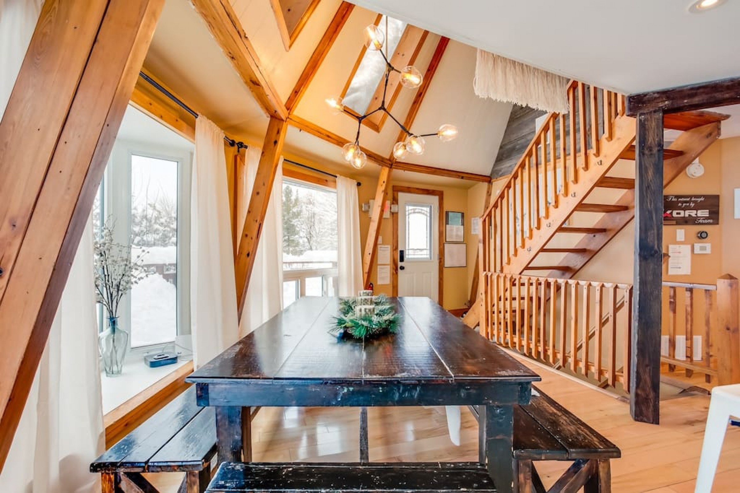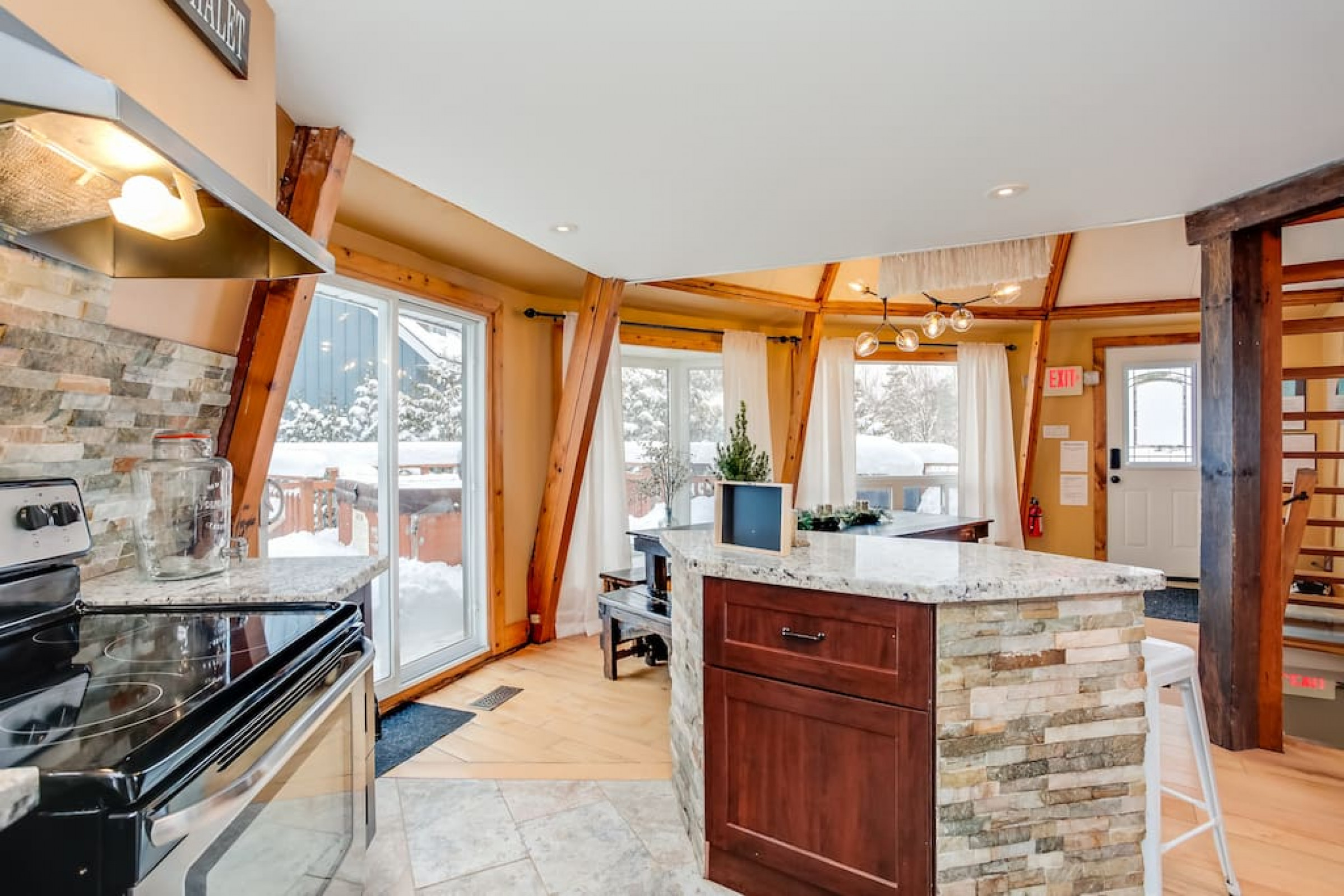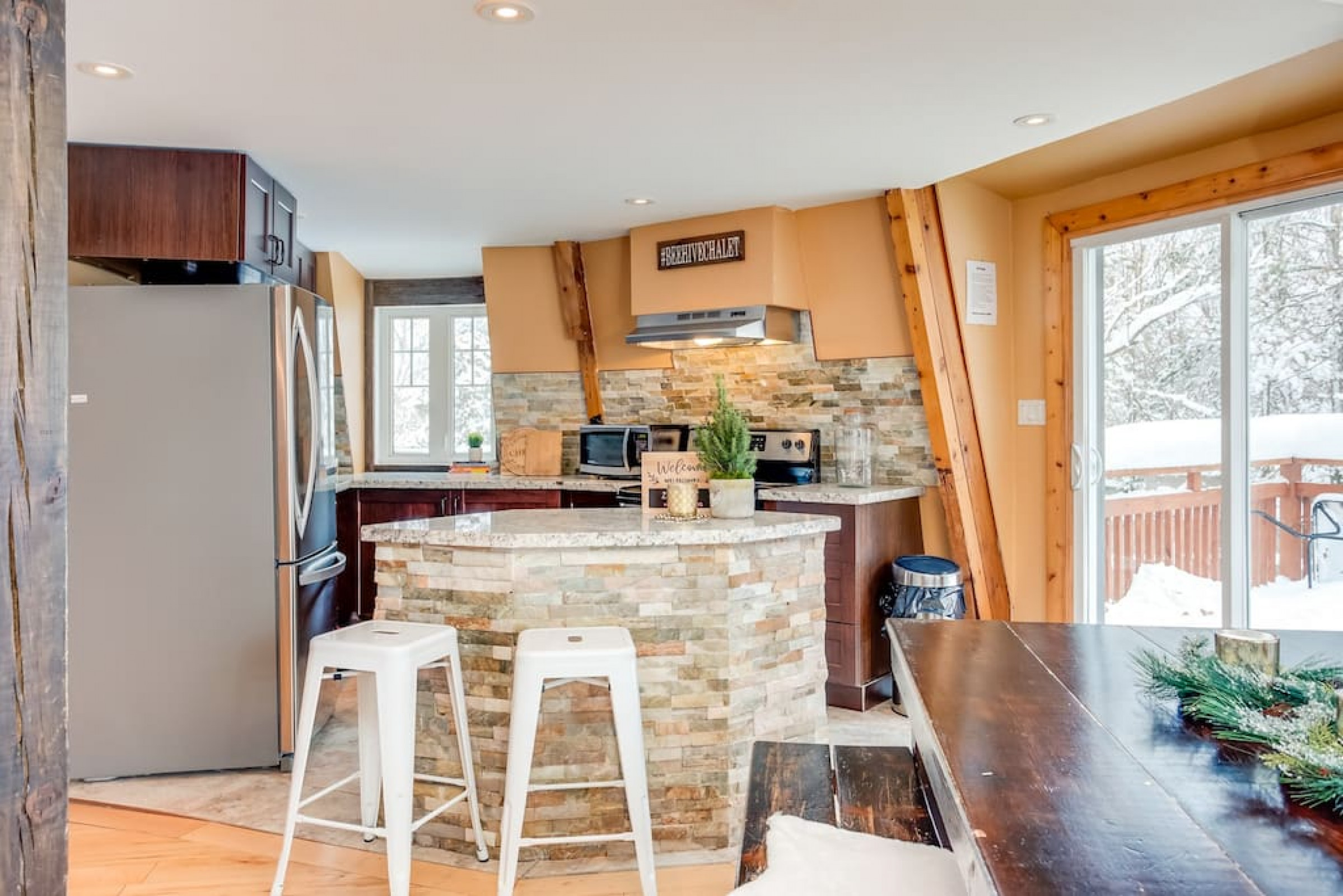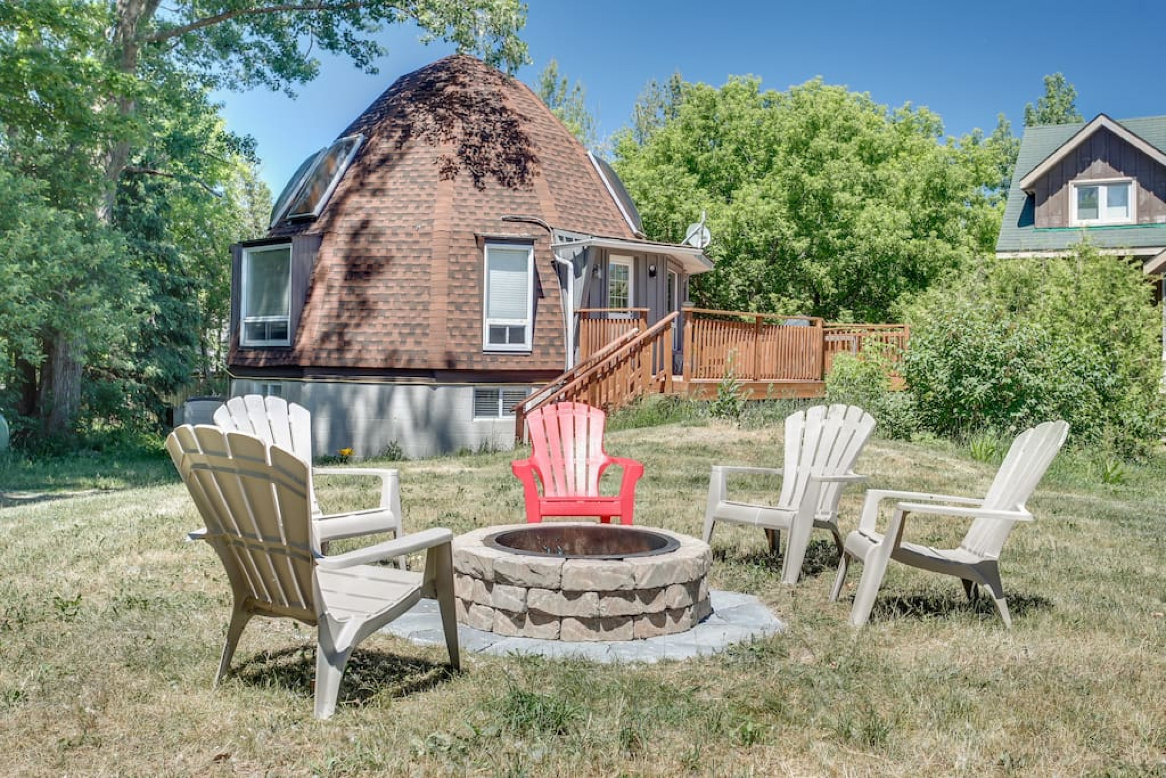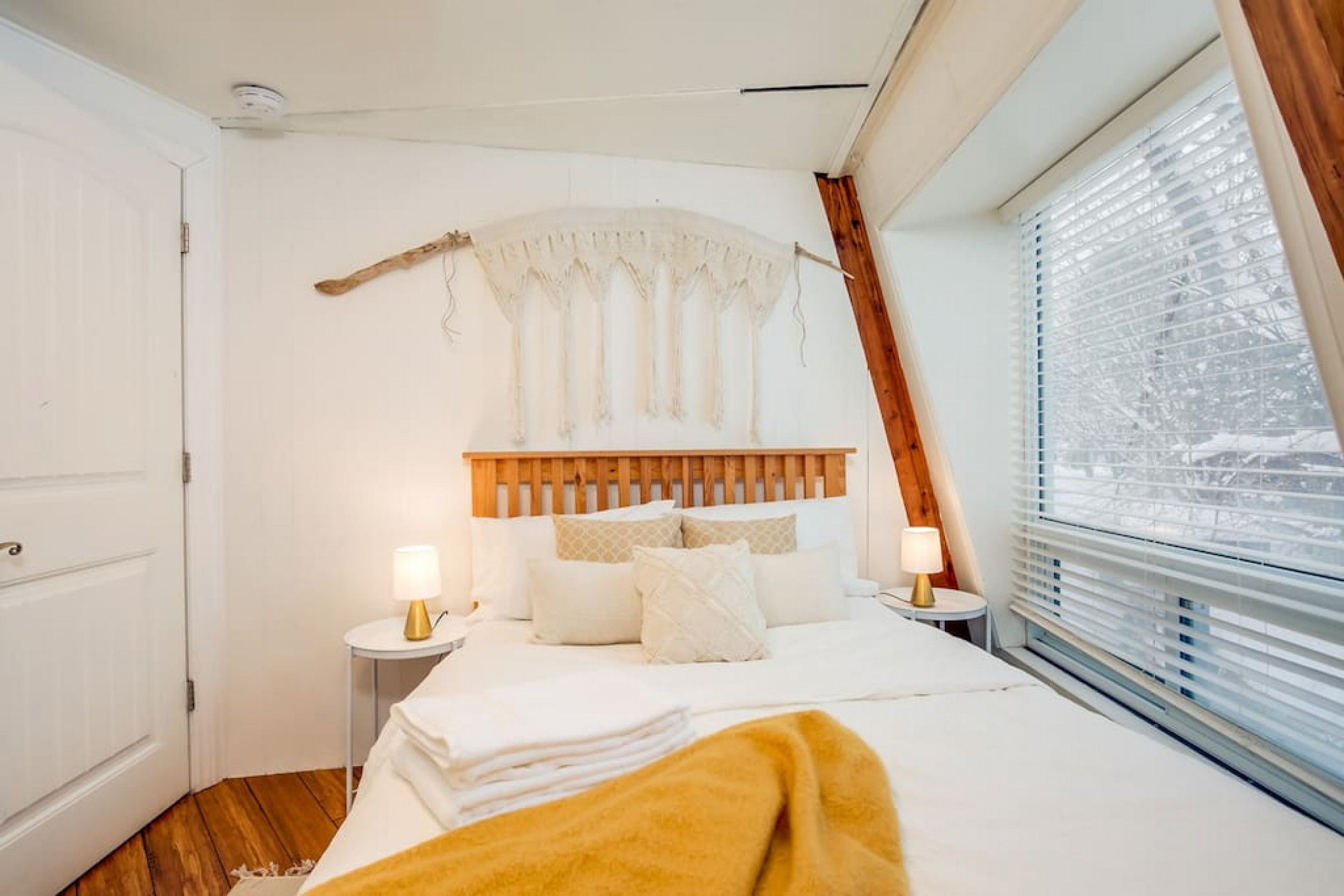 The Beehive is best known for its unique curb appeal, but wait until you see the inside. It is lovingly styled with a Boho-Scandi inspired vibe. The vaulted circular ceilings are stunning and let in tons of natural light. All six bedrooms have rounded walls- no two are alike. There are two full washrooms each with an upright shower. The living room is located in the upper loft and features a flat screen tv, fireplace insert and skylights that let in tons of natural light! The open concept kitchen & dining area is a great place to host an intimate dinner party or brunch. The breakfast bar makes entertaining easy and social. There is a wrap around deck with a small dining set, hot tub and BBQ . The firepit on the front lawn is yours to enjoy (BYO firewood in fall/winter) and there is plenty of outdoor space for lawn games in the summer!