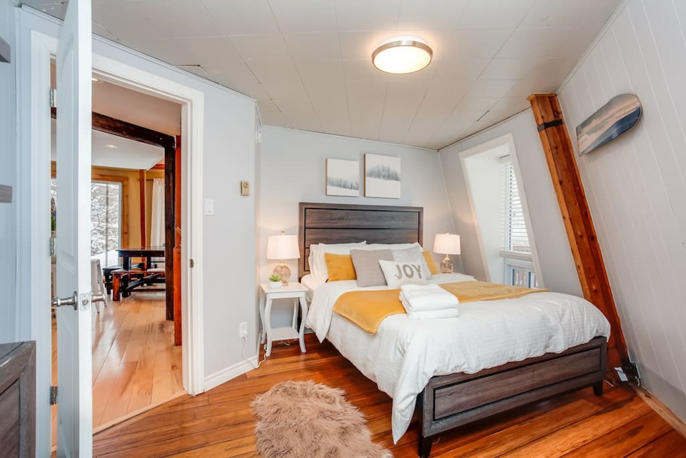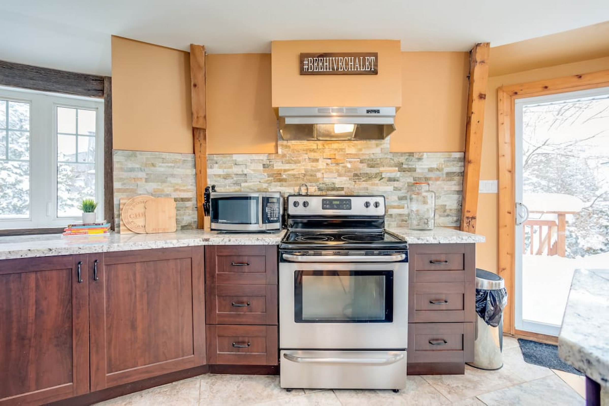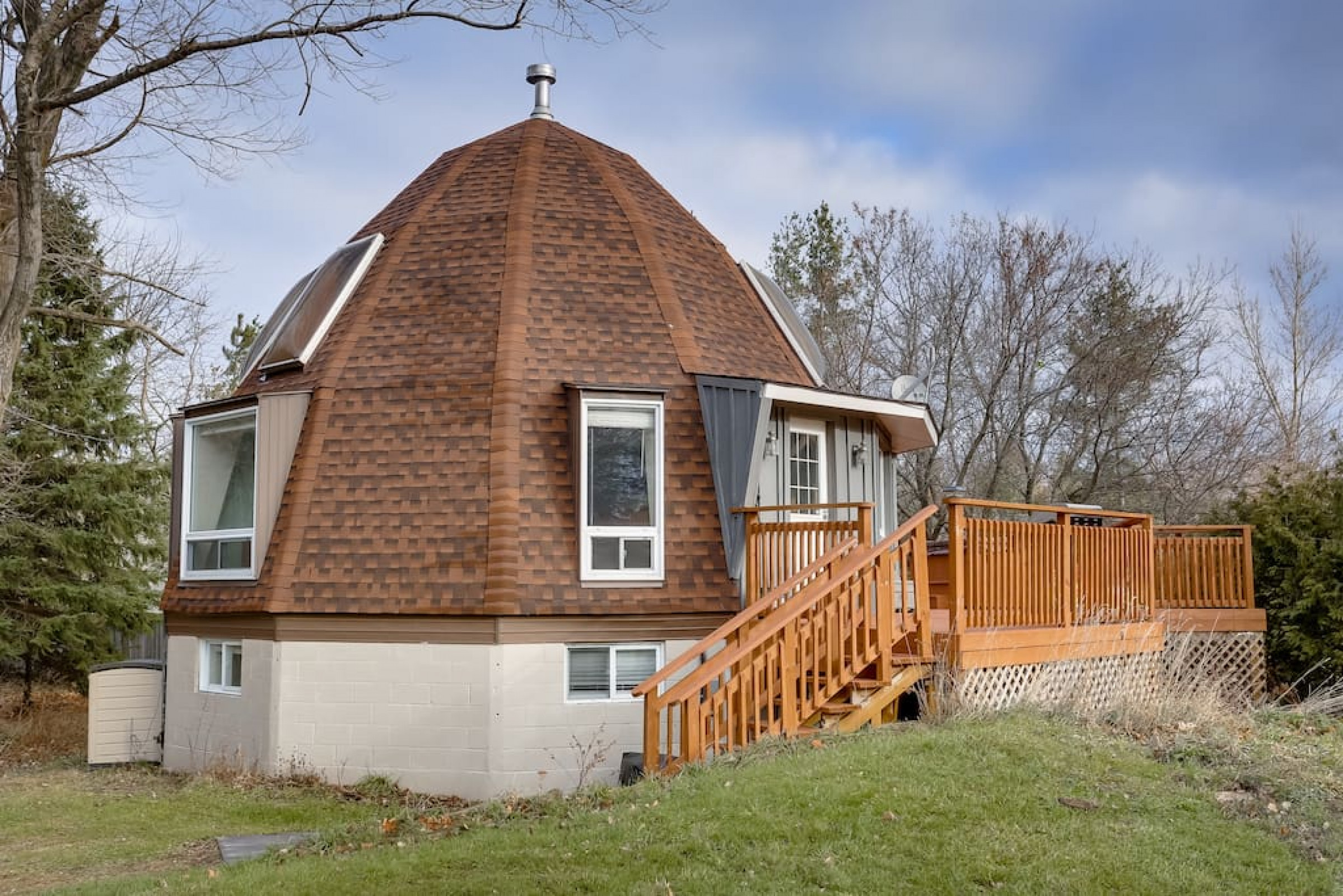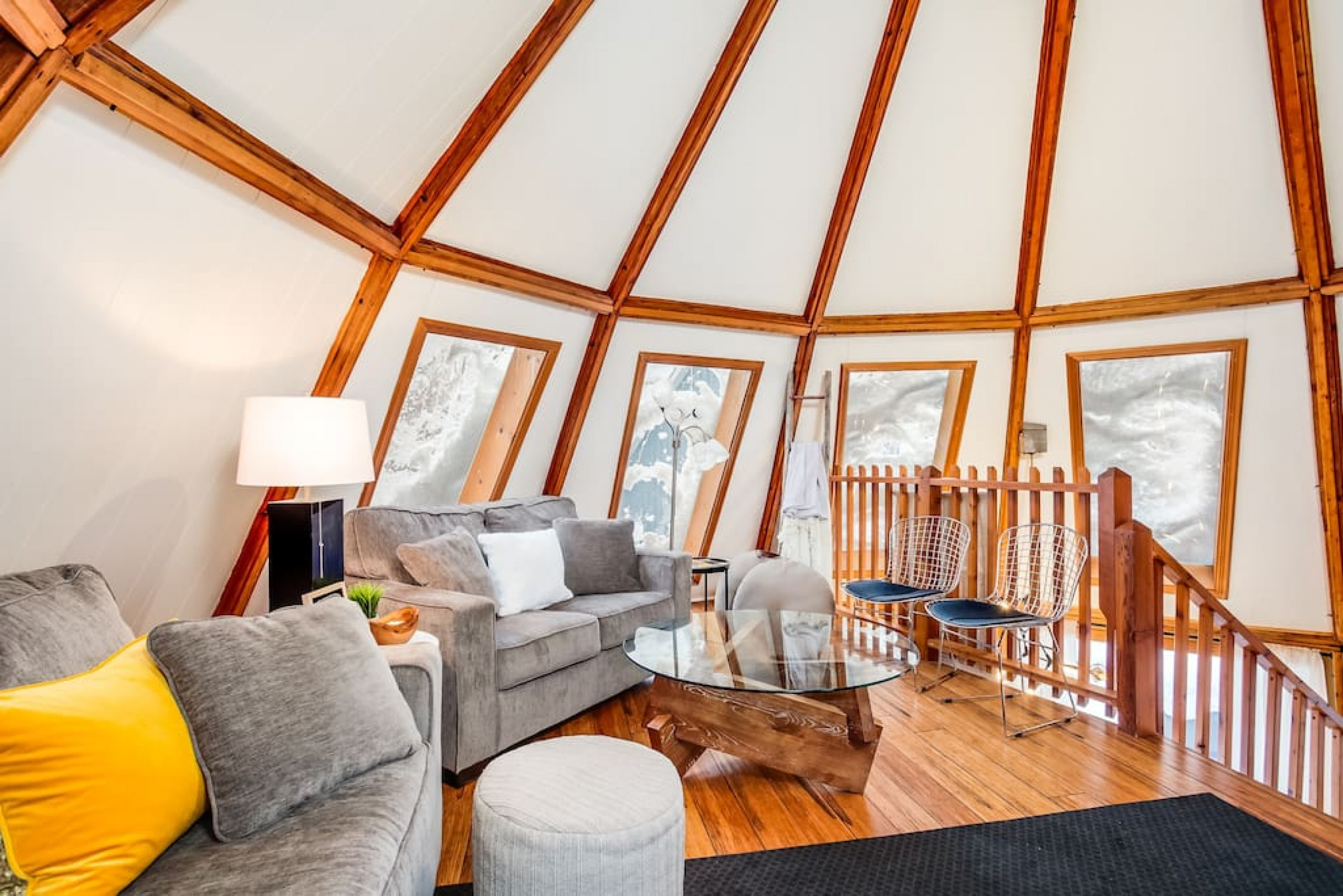 The Beehive is best known for its unique curb appeal, but wait until you see the inside. It is lovingly styled with a Boho-Scandi inspired vibe. The vaulted circular ceilings are stunning and let in tons of natural light. All six bedrooms have rounded walls- no two are alike. There are two full washrooms each with an upright shower. The living room is located in the upper loft and features a flat screen tv, fireplace insert and skylights that let in tons of natural light! The open concept kitchen & dining area is a great place to host an intimate dinner party or brunch. The breakfast bar makes entertaining easy and social. There is a wrap around deck with a small dining set, hot tub and BBQ . The firepit on the front lawn is yours to enjoy (BYO firewood in fall/winter) and there is plenty of outdoor space for lawn games in the summer!