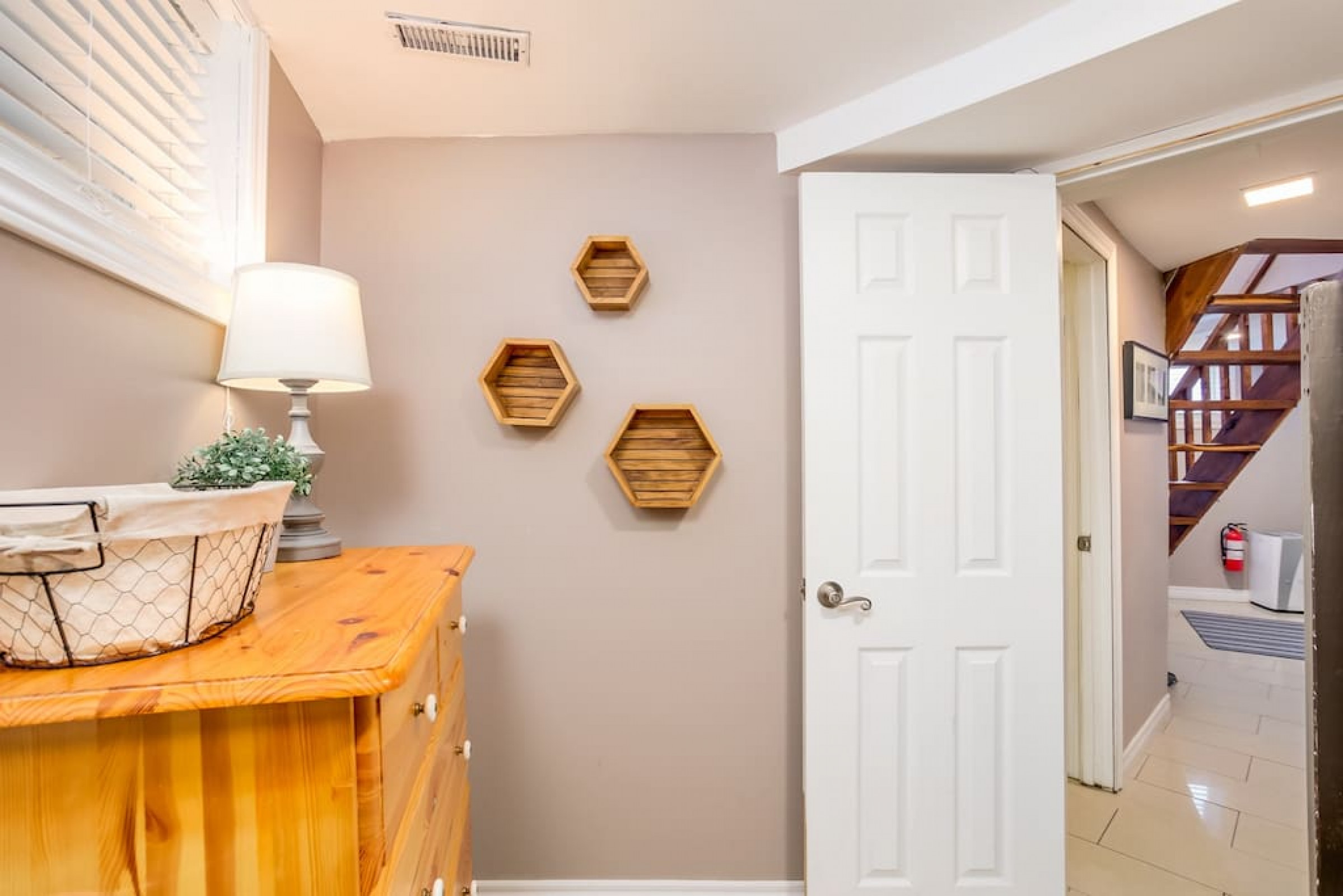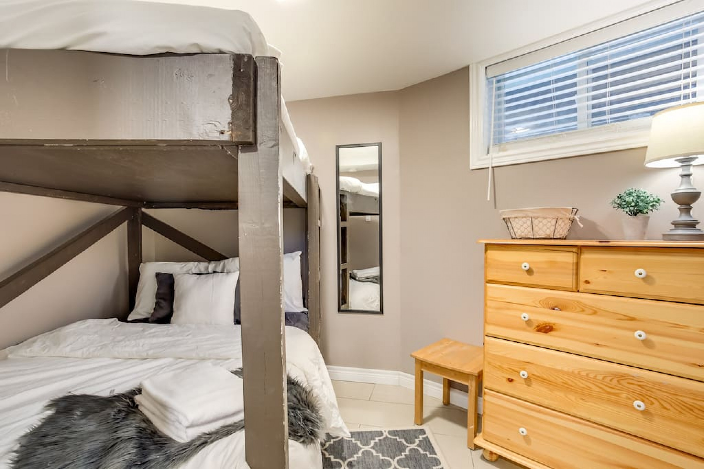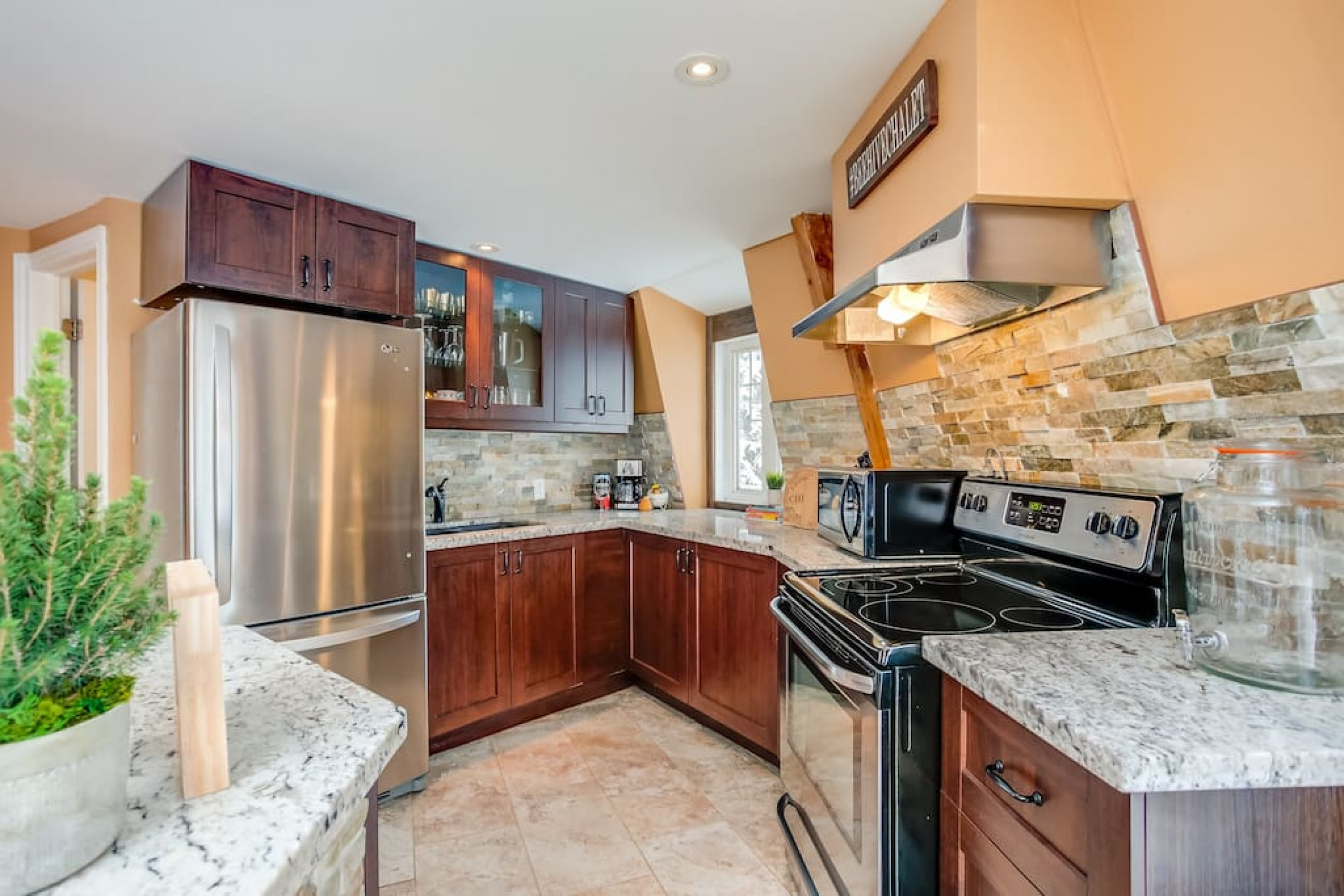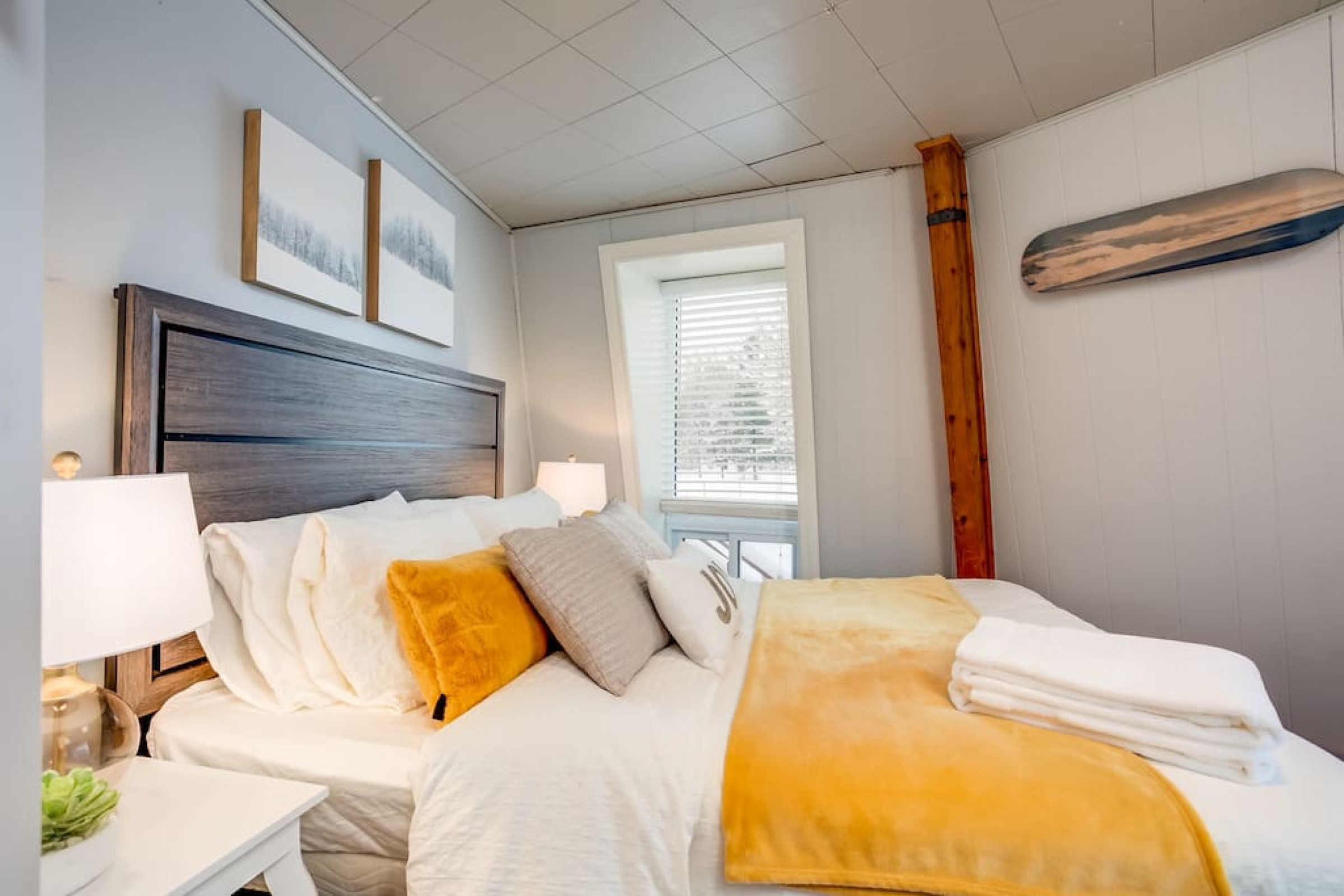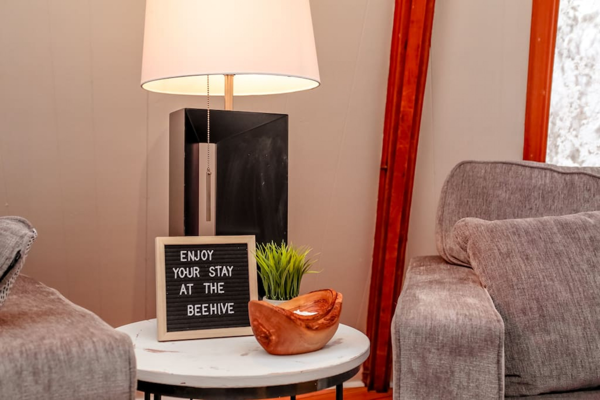 The Beehive is best known for its unique curb appeal, but wait until you see the inside. It is lovingly styled with a Boho-Scandi inspired vibe. The vaulted circular ceilings are stunning and let in tons of natural light. All six bedrooms have rounded walls- no two are alike. There are two full washrooms each with an upright shower. The living room is located in the upper loft and features a flat screen tv, fireplace insert and skylights that let in tons of natural light! The open concept kitchen & dining area is a great place to host an intimate dinner party or brunch. The breakfast bar makes entertaining easy and social. There is a wrap around deck with a small dining set, hot tub and BBQ . The firepit on the front lawn is yours to enjoy (BYO firewood in fall/winter) and there is plenty of outdoor space for lawn games in the summer!