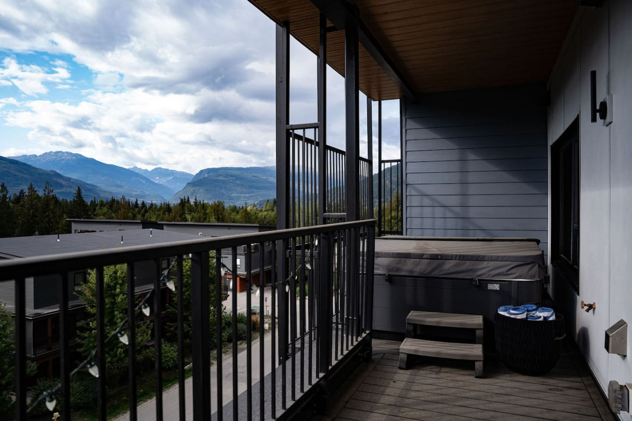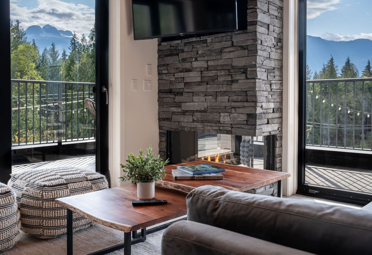 The interior is thoughtfully decorated with high-end local art, including a full living area where the cozy seating surrounds the smart TV with cable and gas fireplace. Glass doors lead out to the impressive private wraparound balcony with outdoor furniture and the BBQ, as well as the hot tub facing Mt. Begbie and various other mountainscapes.