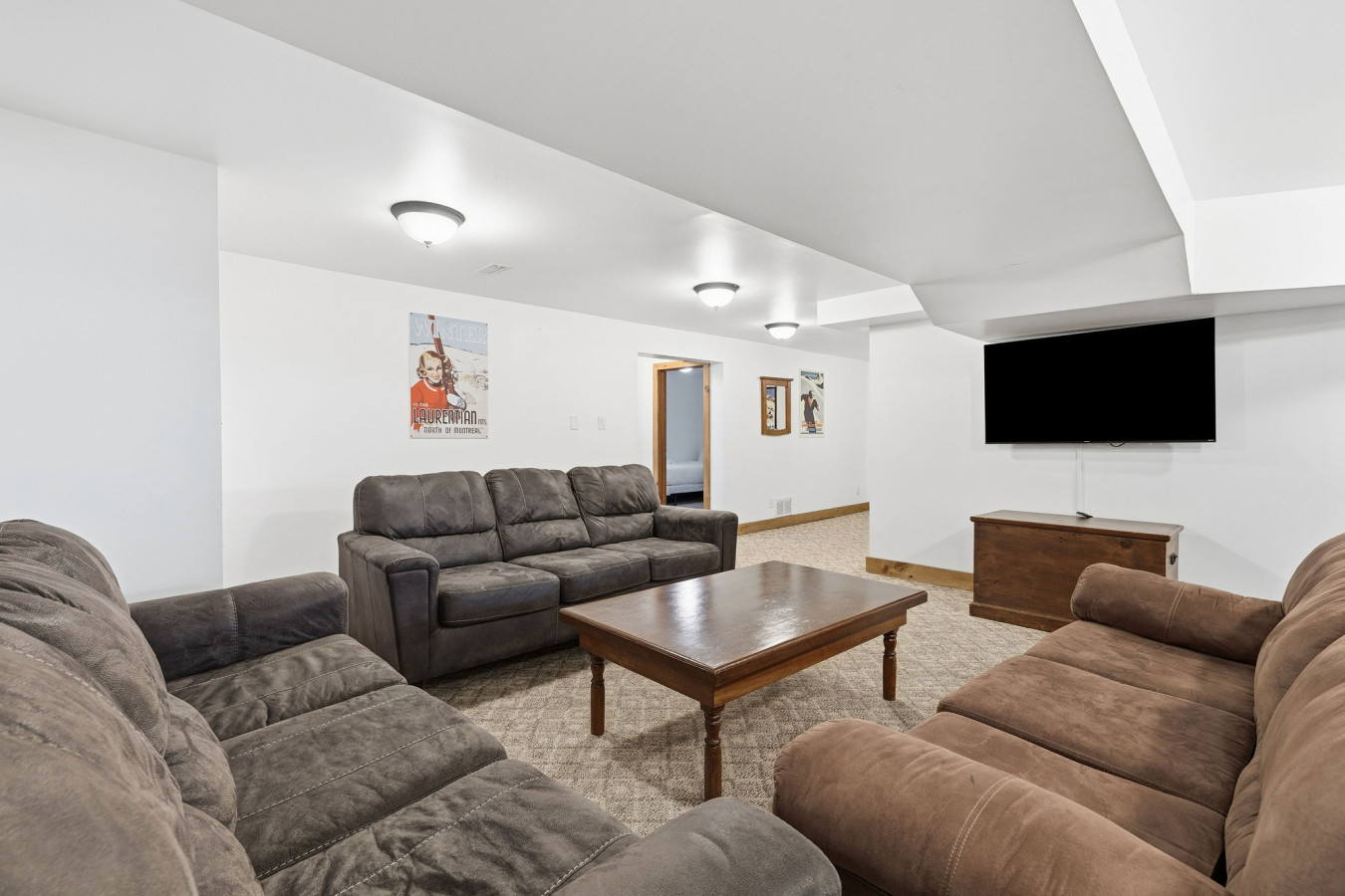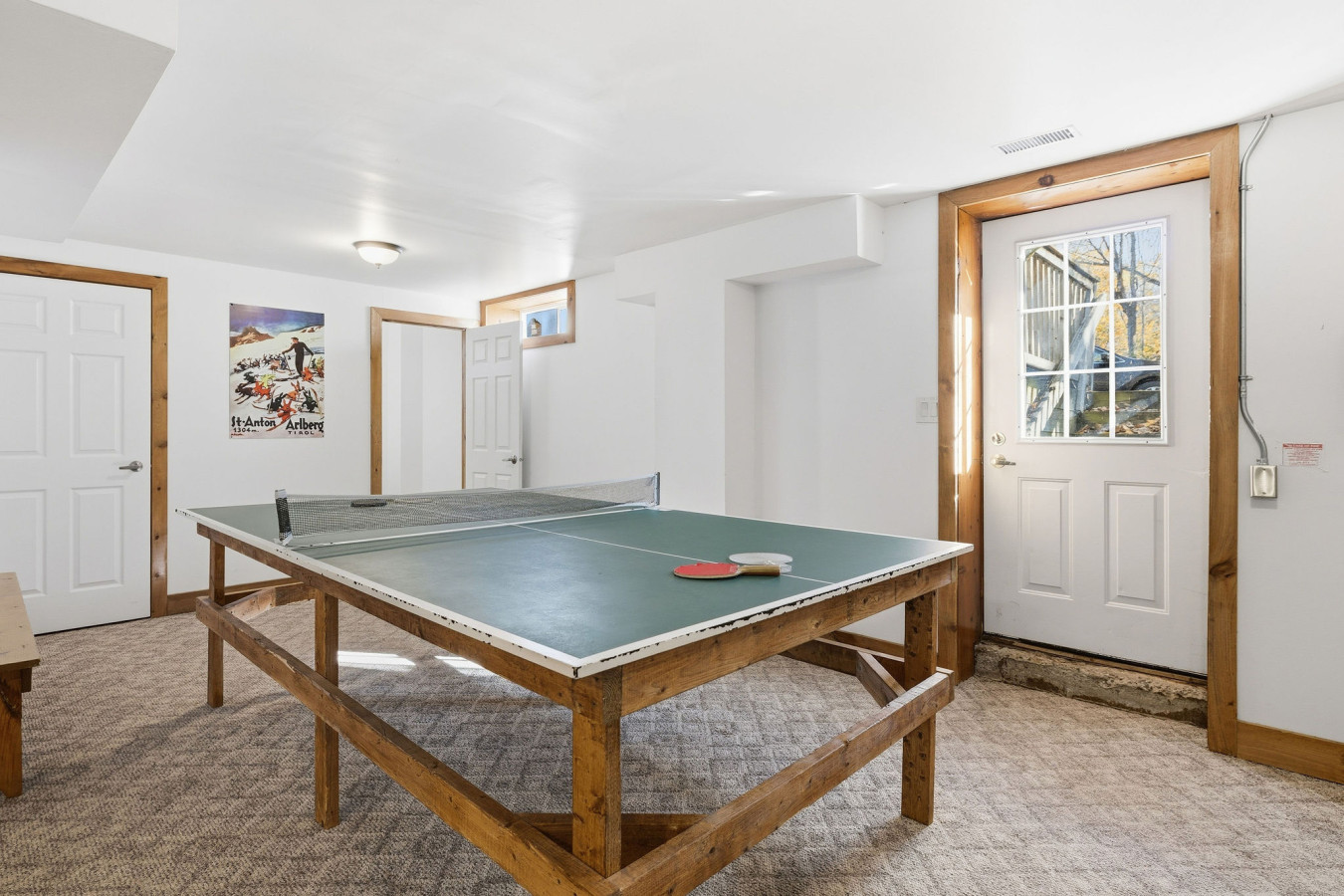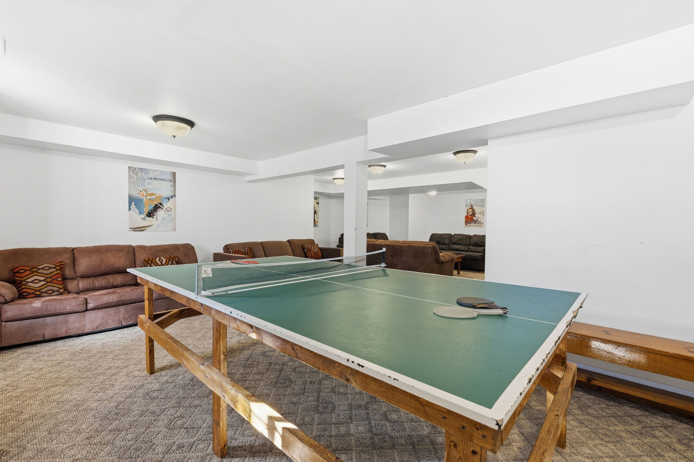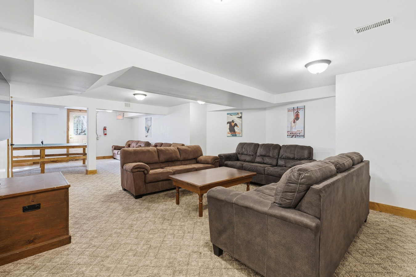 On the Lower Level, you will find 2 bedrooms, a half bathroom, and an entertainment area with comfortable sofa seating, smart TV, ping pong table, and laundry machines for your convenience.