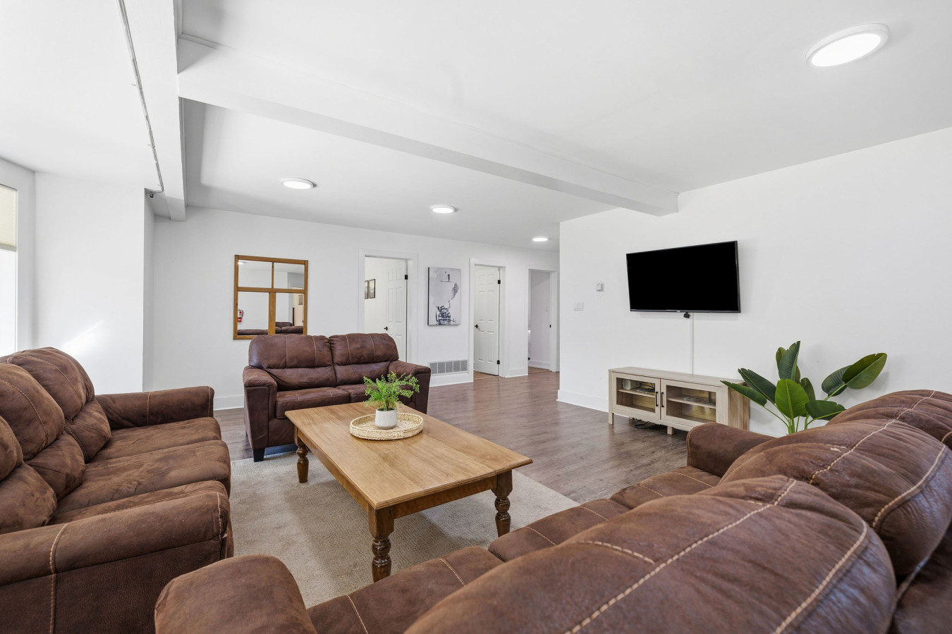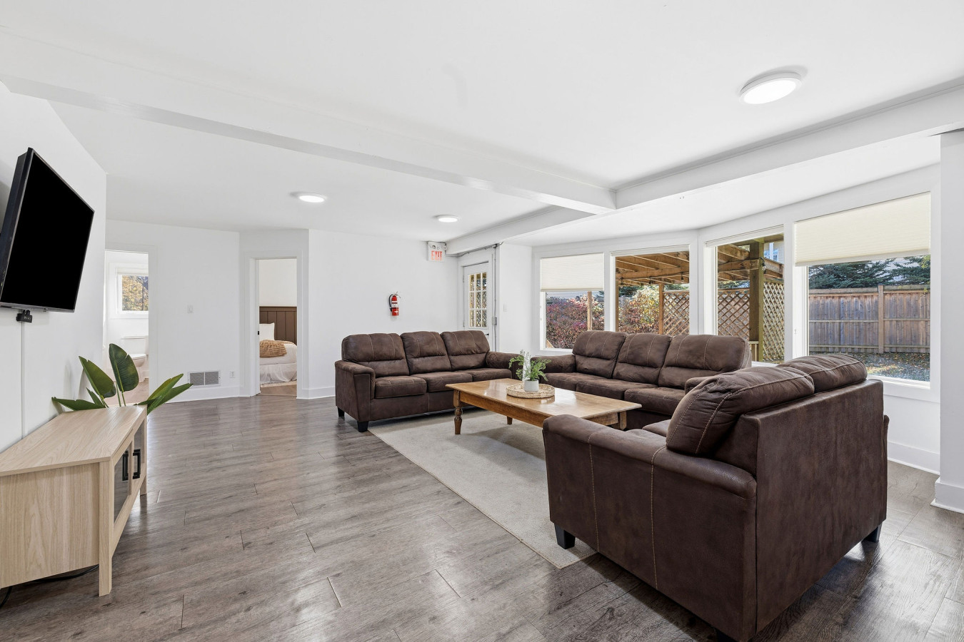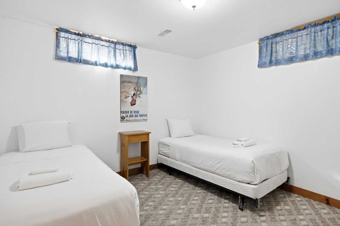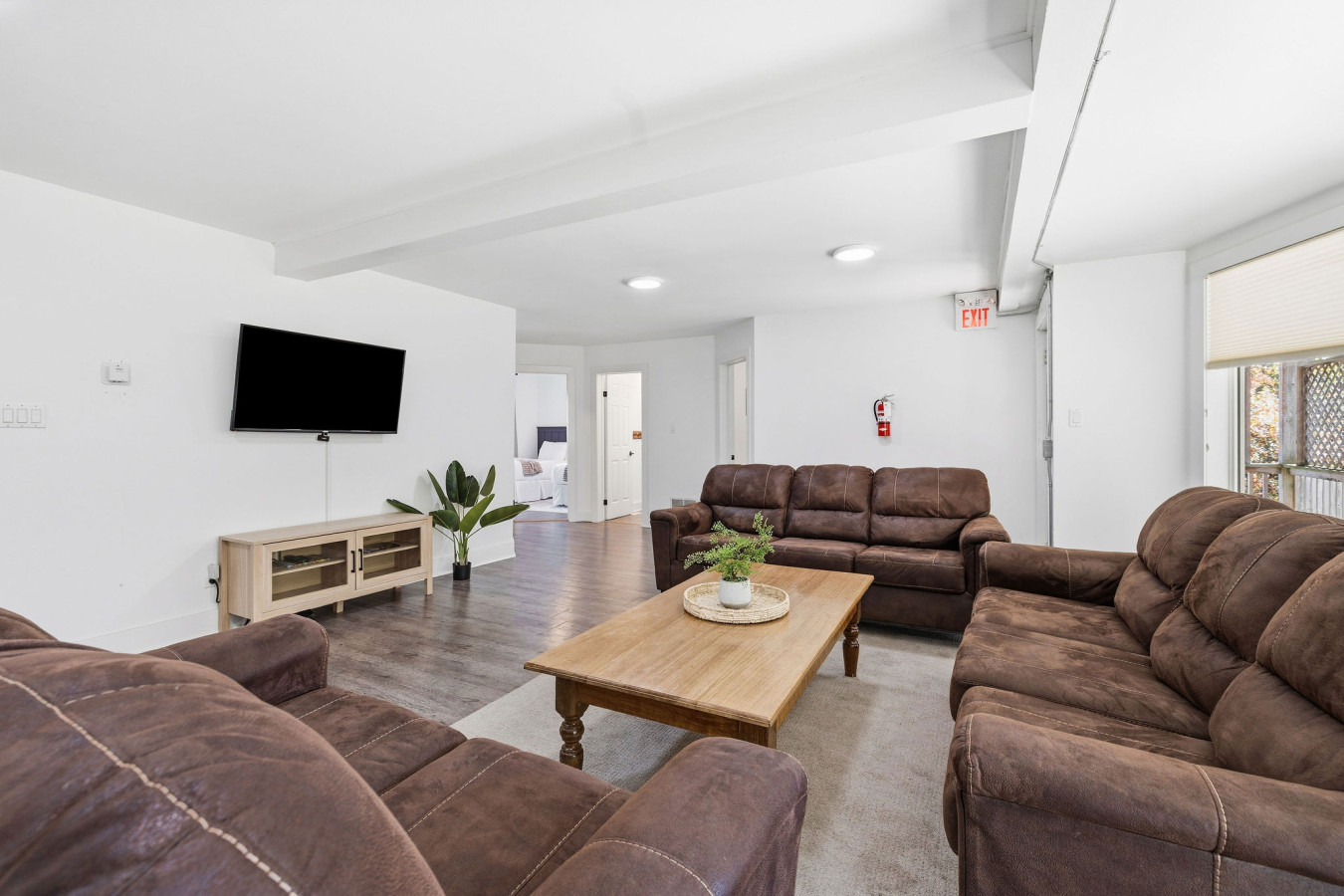 On the Lower Level, you will find 2 bedrooms, a half bathroom, and an entertainment area with comfortable sofa seating, smart TV, ping pong table, and laundry machines for your convenience.