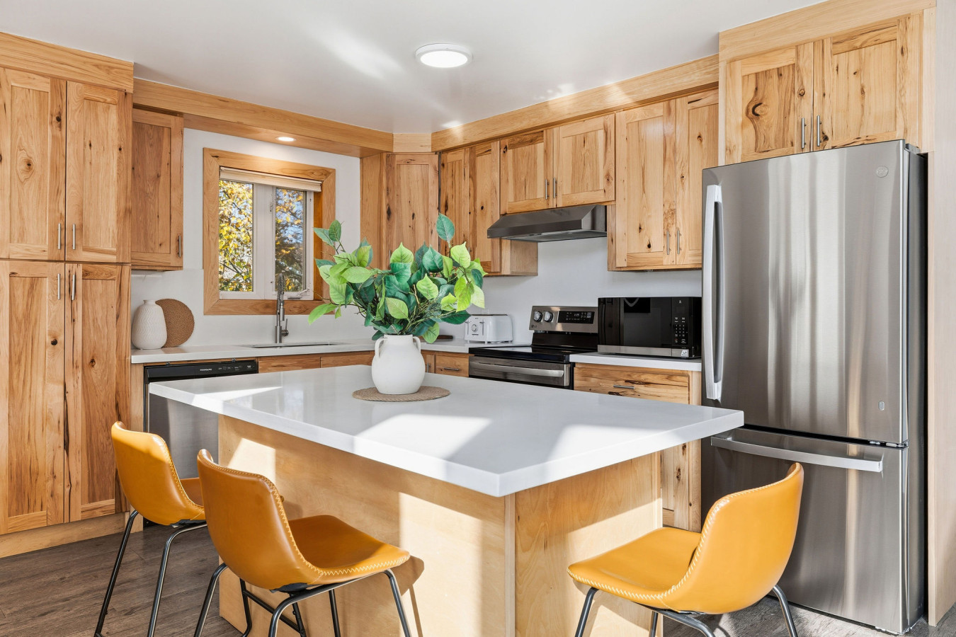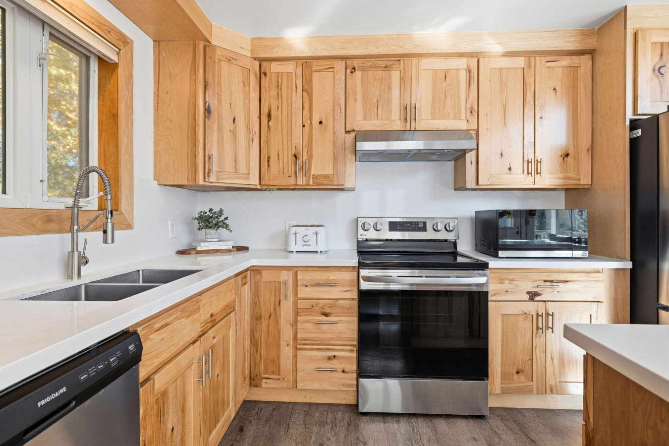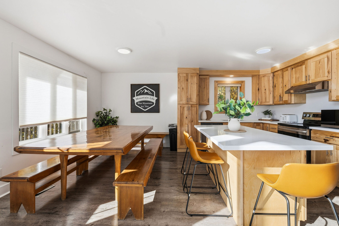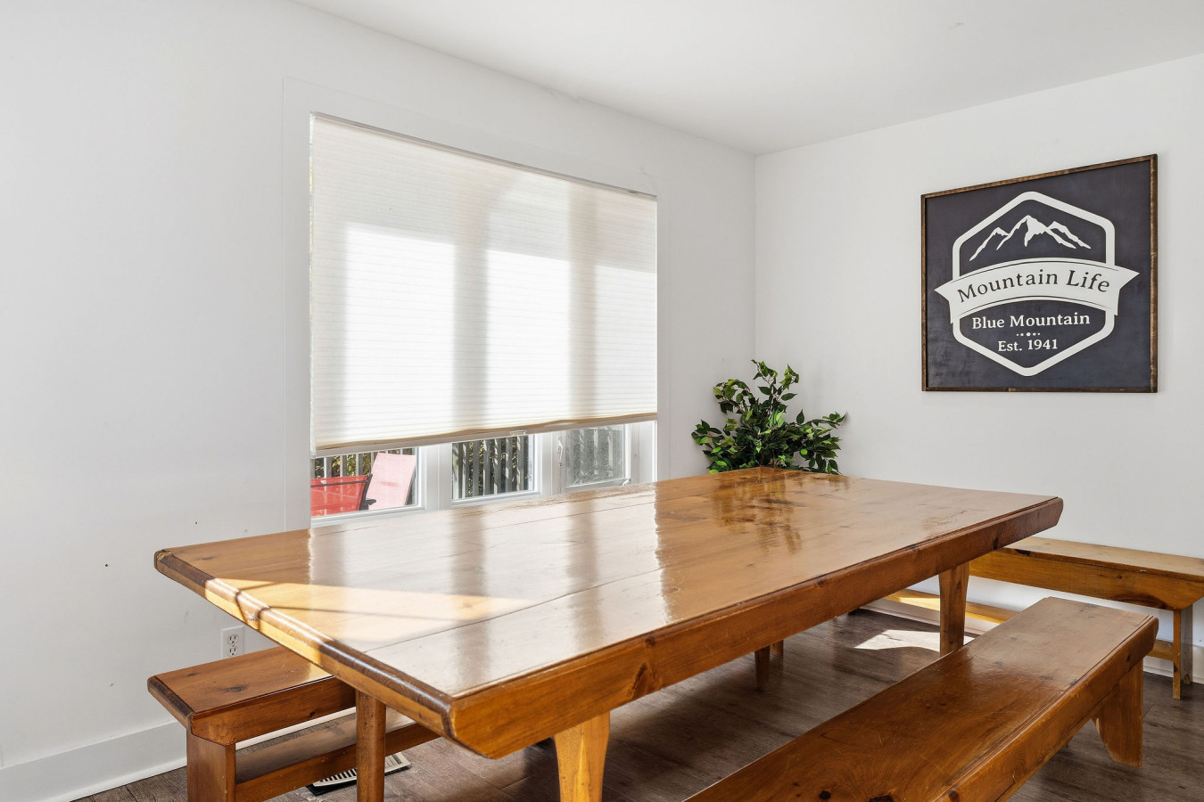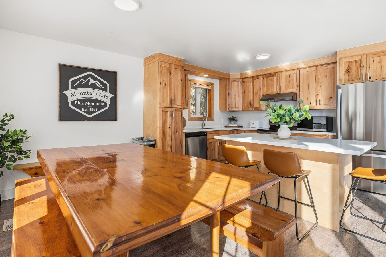 The Upper Level features three bedrooms and two washrooms, complete with a large Jacuzzi tub. The Great Room (kitchen, dining area, living room) is complete with a gas fireplace which opens up to the raised deck -an ideal place for families and friends to dine and enjoy quality time together. Plus it’s the perfect place to watch the sun set over Blue Mountain. The kitchen is fully equipped with all the necessities needed to cook including all cutlery and utensils. All you need to bring is your food and seasonings!