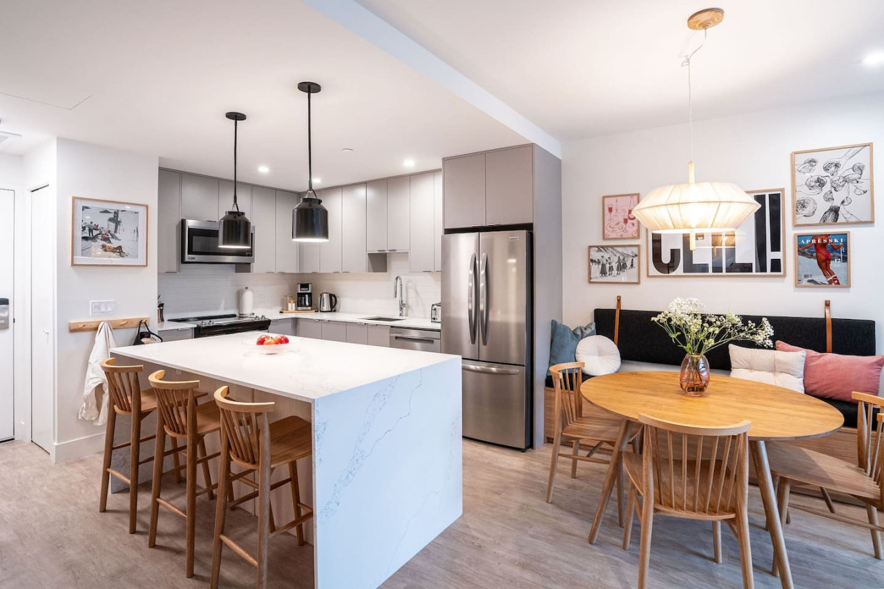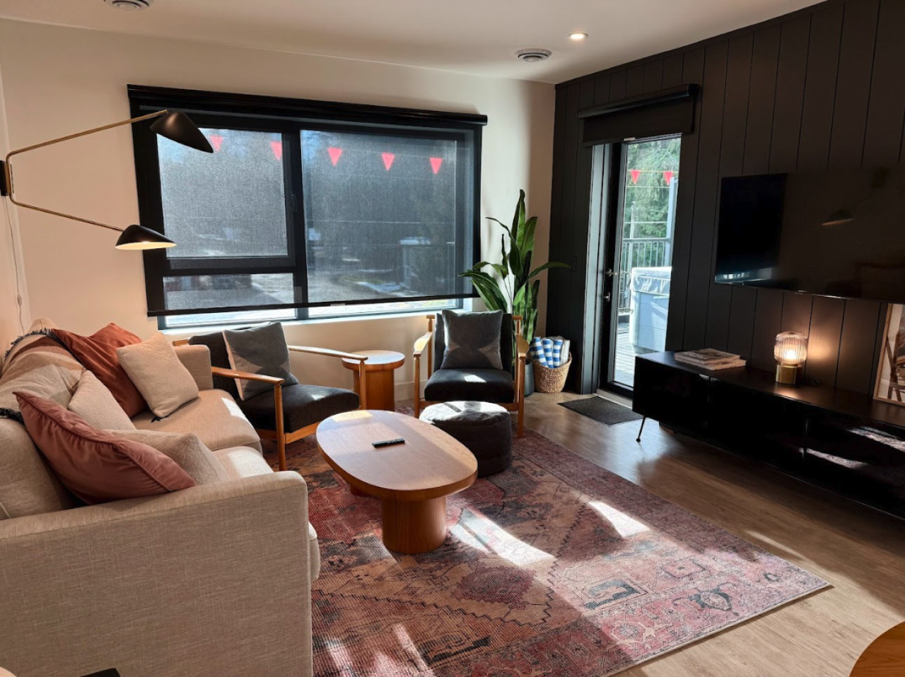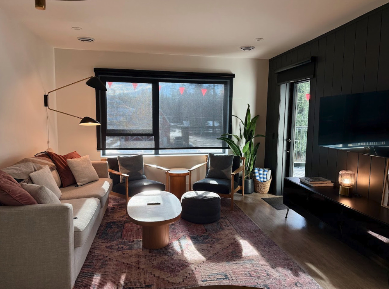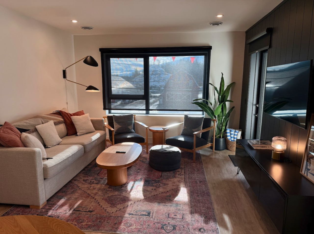 Designed by Spruce and Arrow Design Studio, the living room offers cozy seating around the Smart TV, perfect for relaxing after a day of skiing, golfing, hiking, biking, or exploring the village. It extends to a private balcony equipped with a hot tub, BBQ, and stunning mountain views.