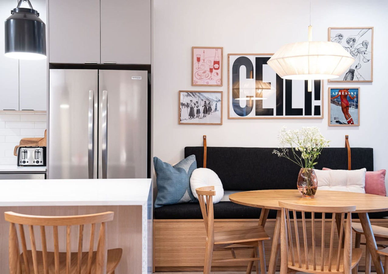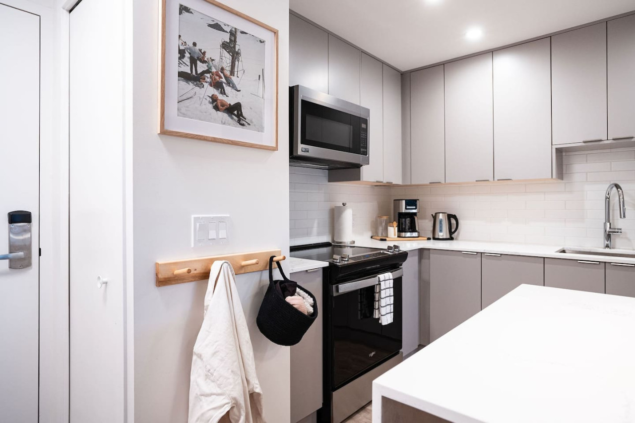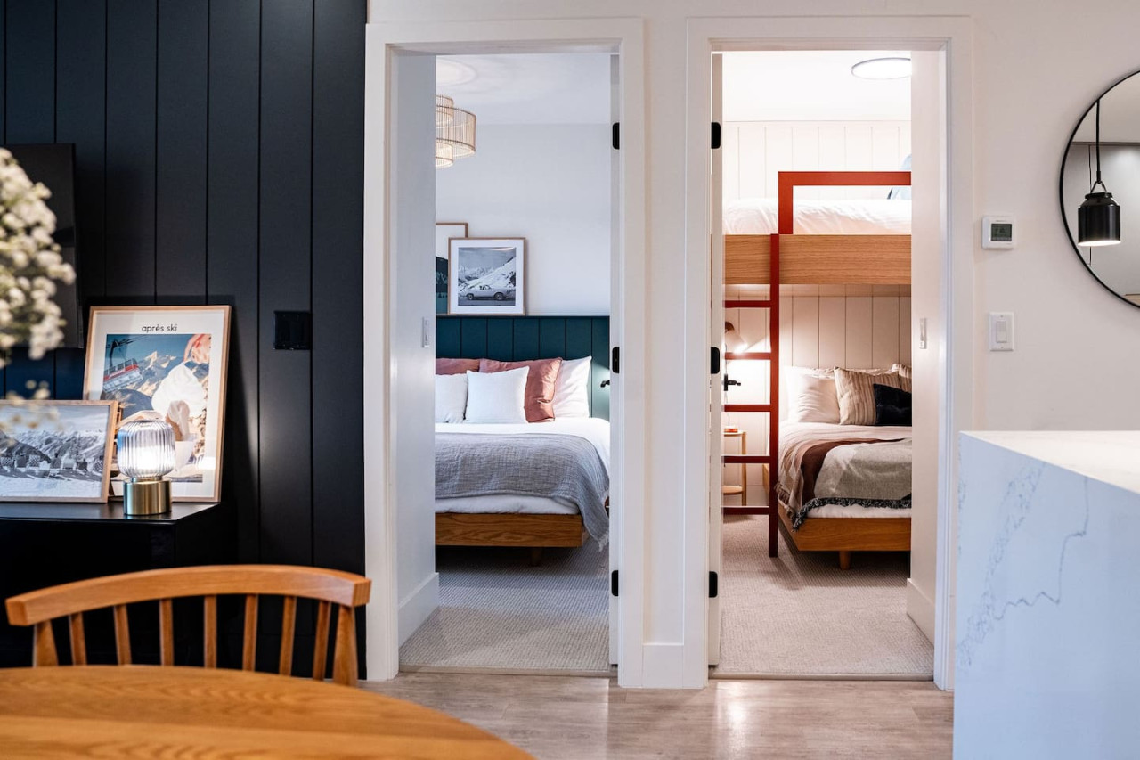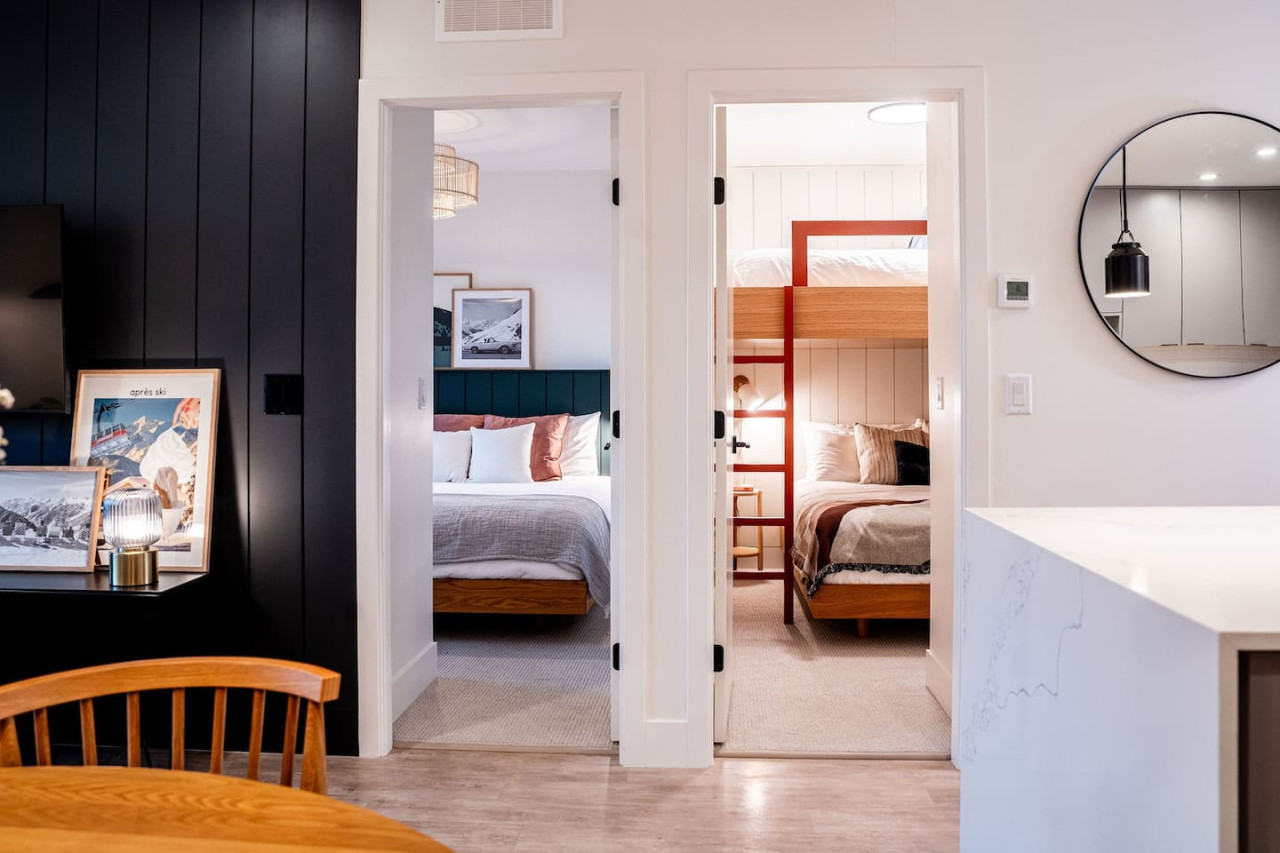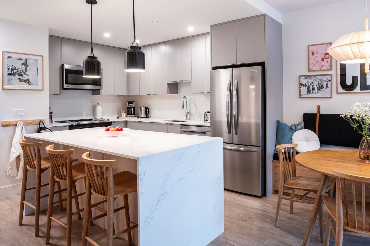 Designed by Spruce and Arrow Design Studio, the living room offers cozy seating around the Smart TV, perfect for relaxing after a day of skiing, golfing, hiking, biking, or exploring the village. It extends to a private balcony equipped with a hot tub, BBQ, and stunning mountain views.