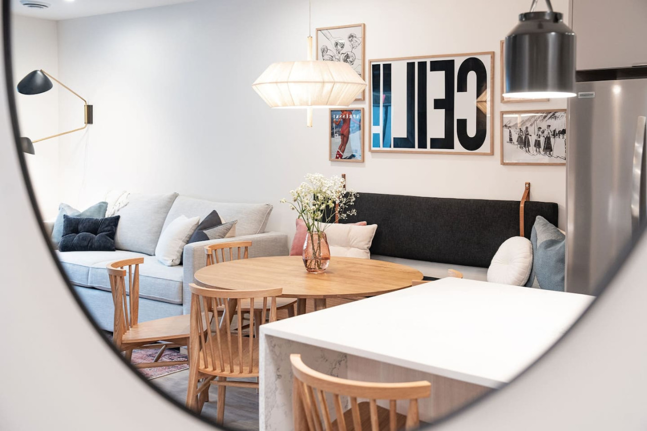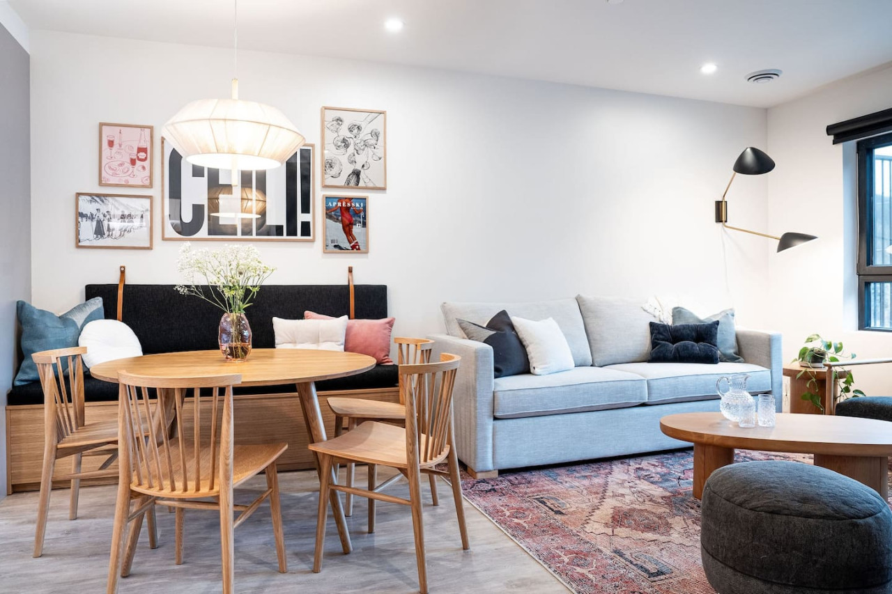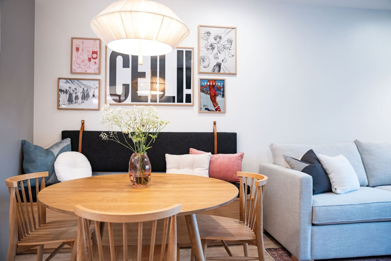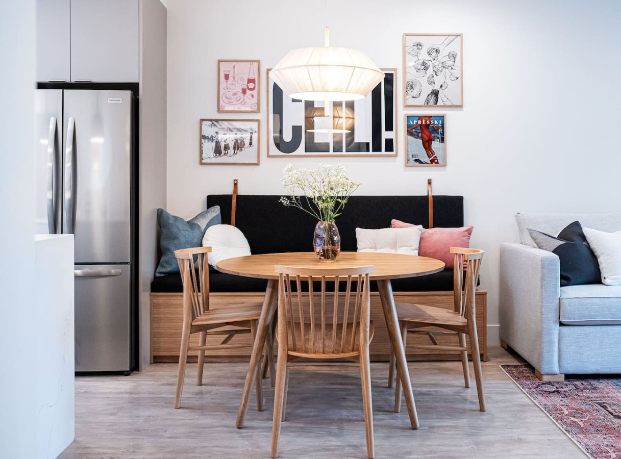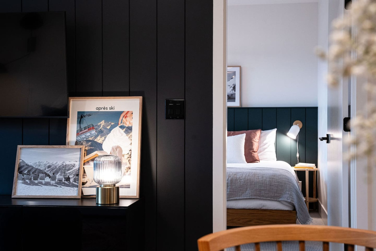Designed by Spruce and Arrow Design Studio, the living room offers cozy seating around the Smart TV, perfect for relaxing after a day of skiing, golfing, hiking, biking, or exploring the village. It extends to a private balcony equipped with a hot tub, BBQ, and stunning mountain views.