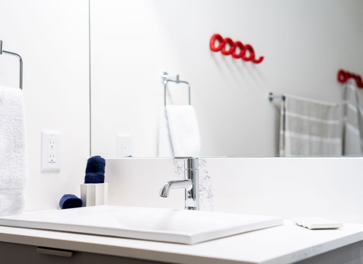 This condo has two separate bedrooms: the primary bedroom features a king bed, while the second bedroom has a double-over-queen bunk bed. Additional sleeping arrangements are available in the living room with a queen sofa bed. The condo includes one washroom with a shower.