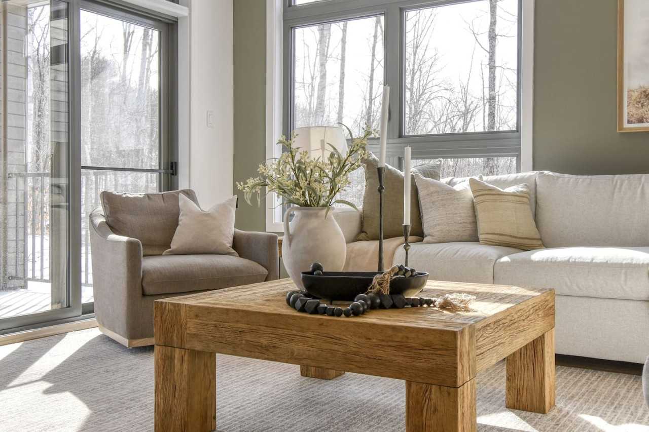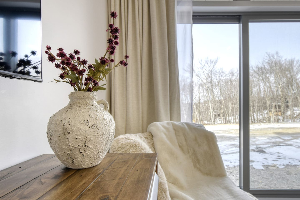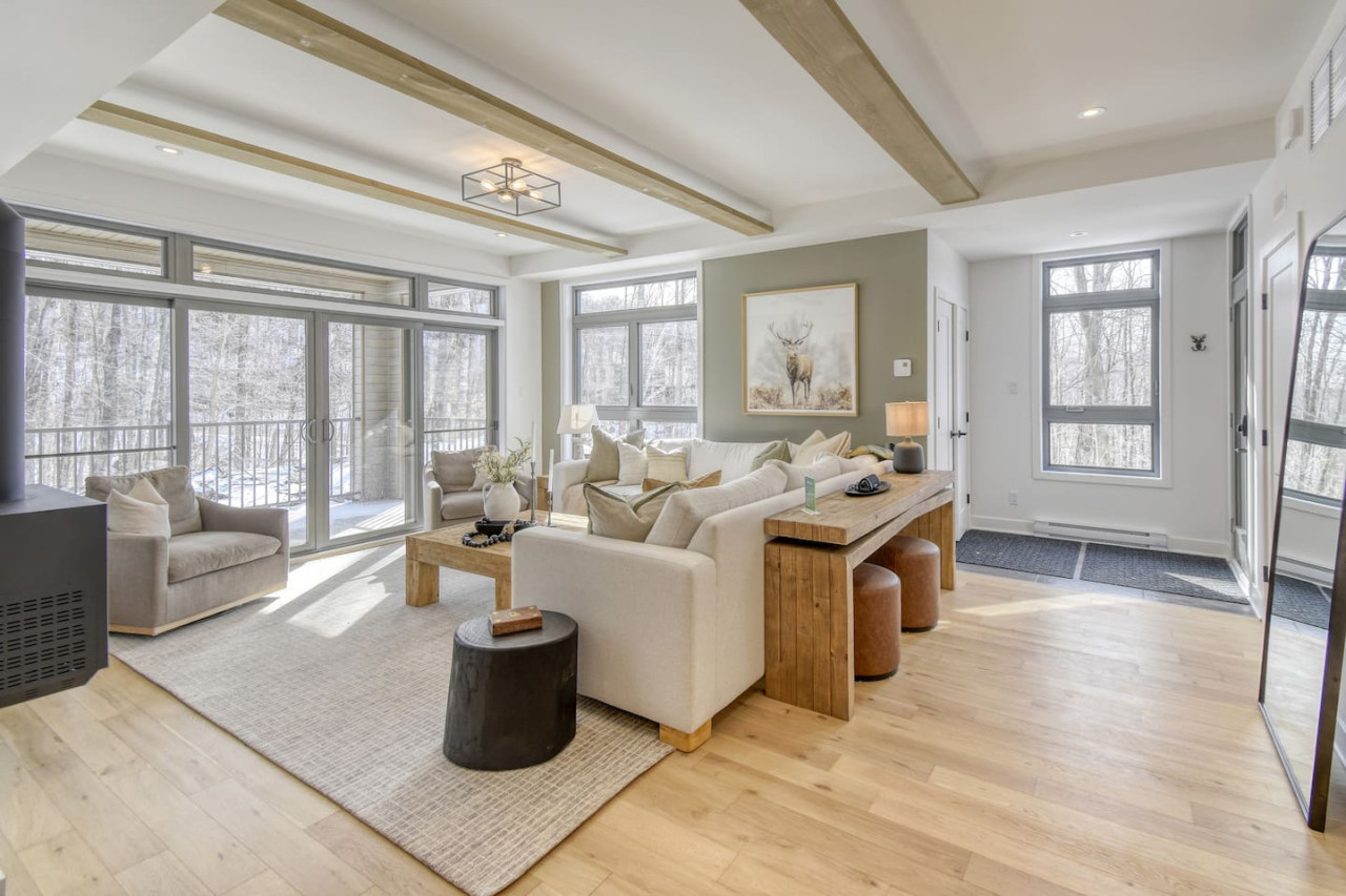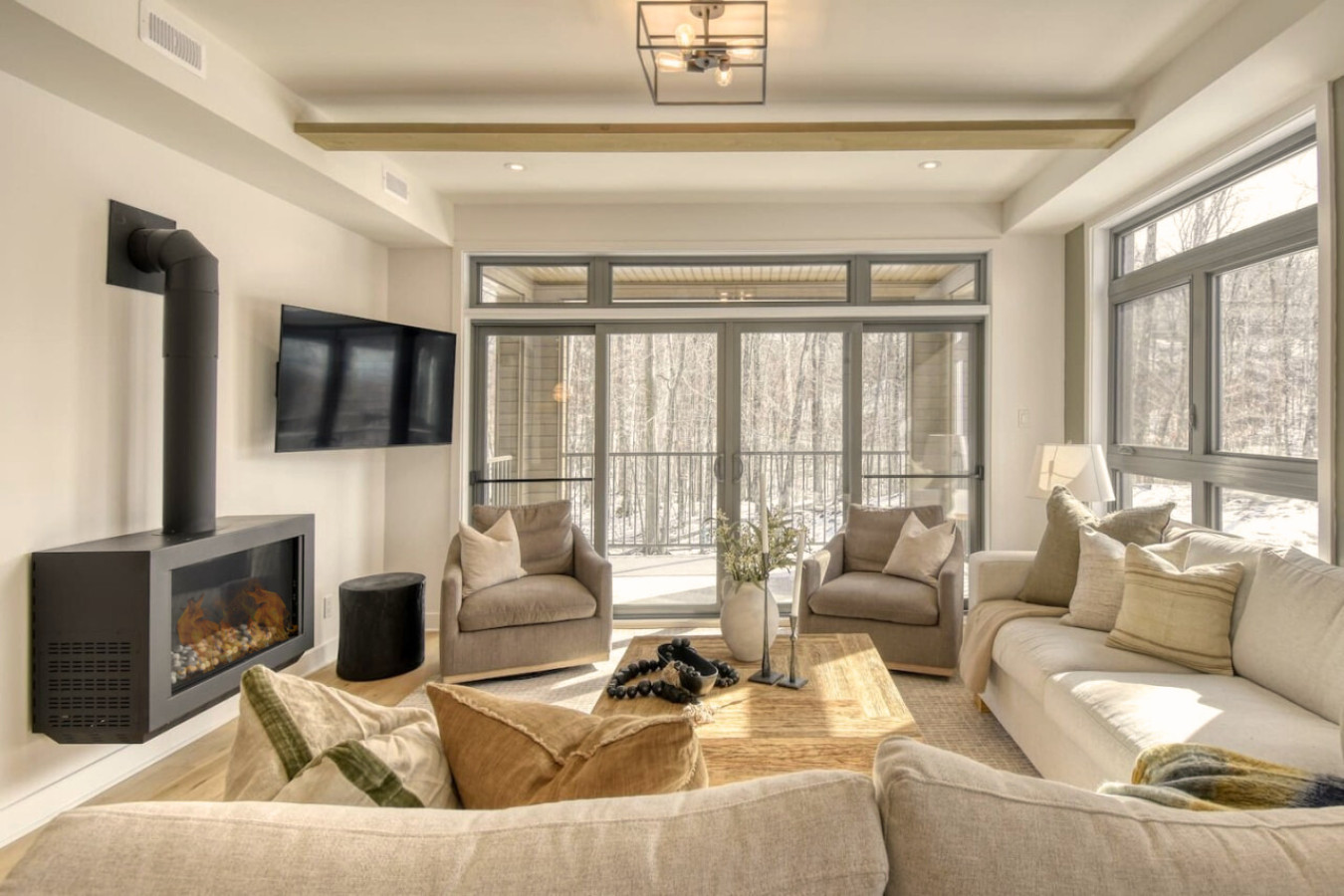 The living room is tastefully decorated and is set up with comfortable seating and a gas fireplace, perfect for unwinding after a day of adventure in the village. The living room couch is conveniently a double sofa bed for extra sleeping space. Equipped with state-of-the-art appliances, and cookware, the kitchen is ready for you to prepare delicious homemade meals.