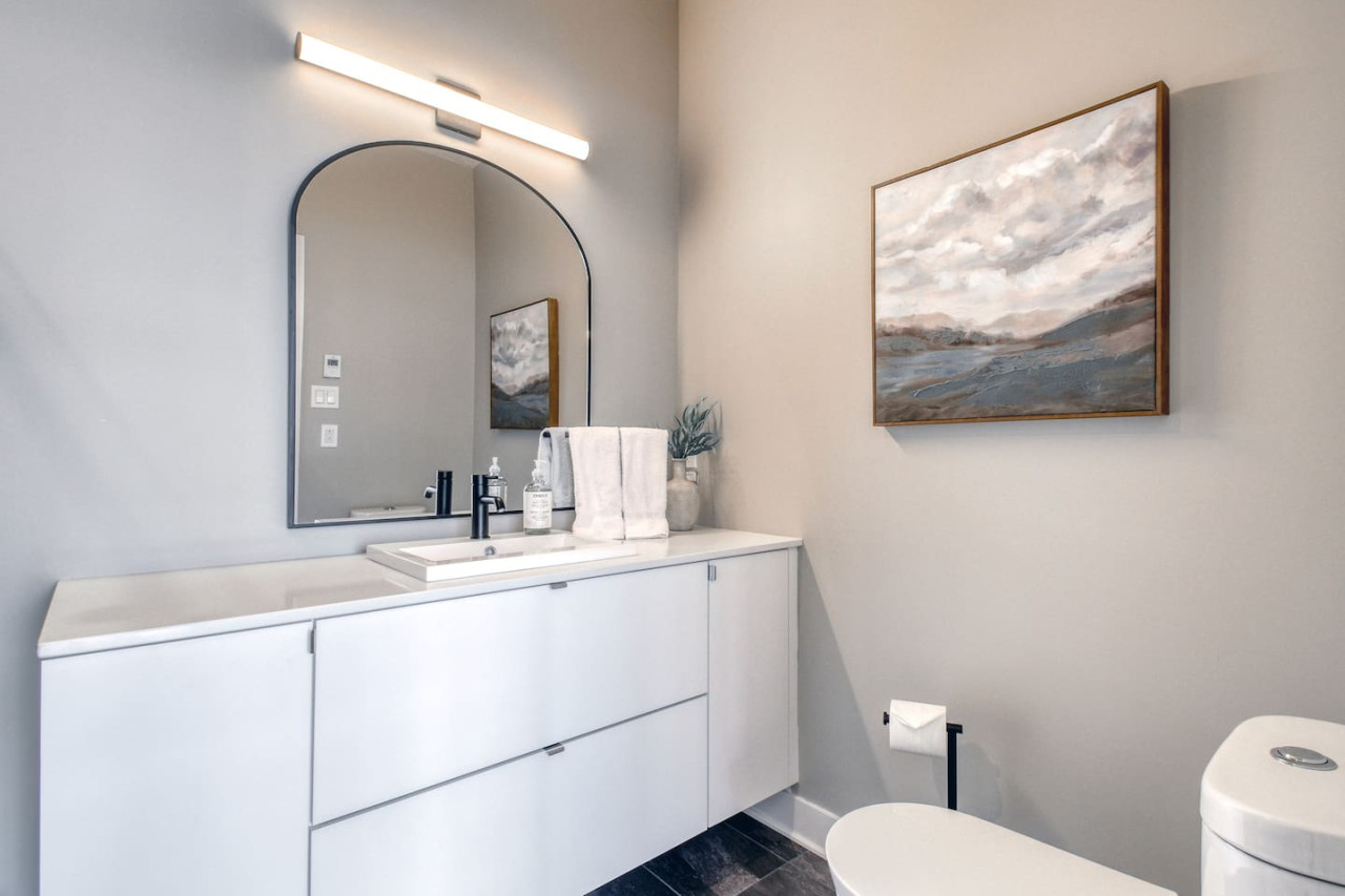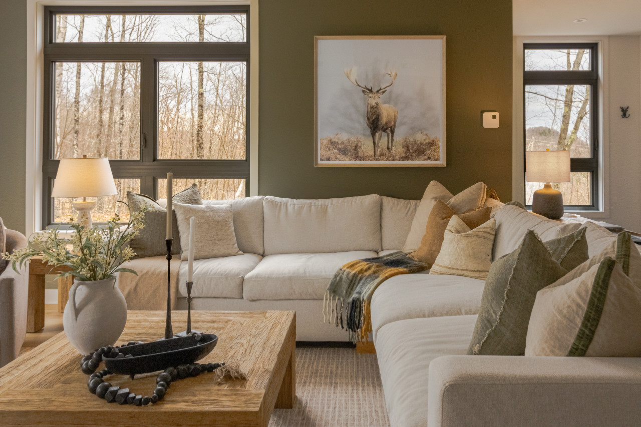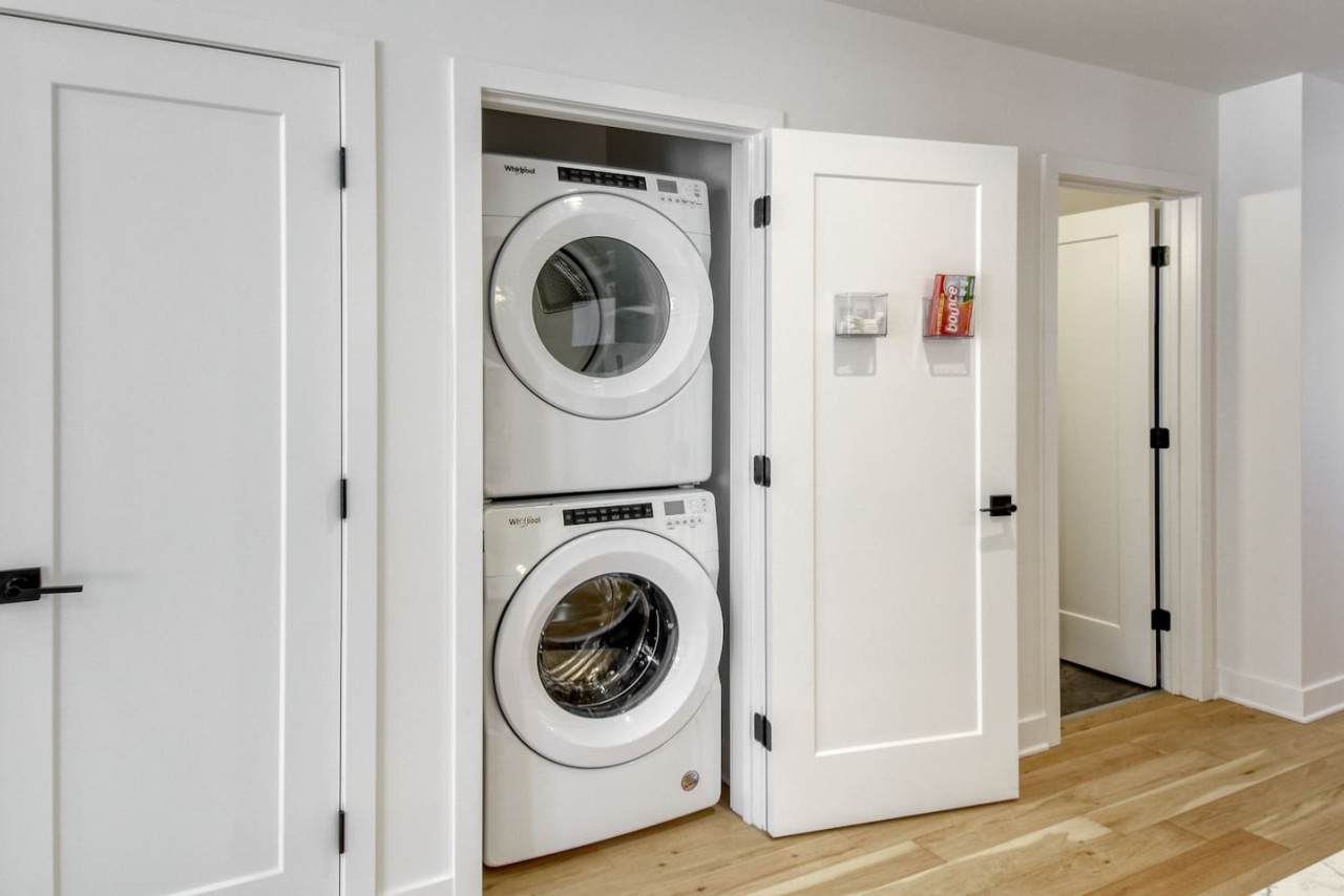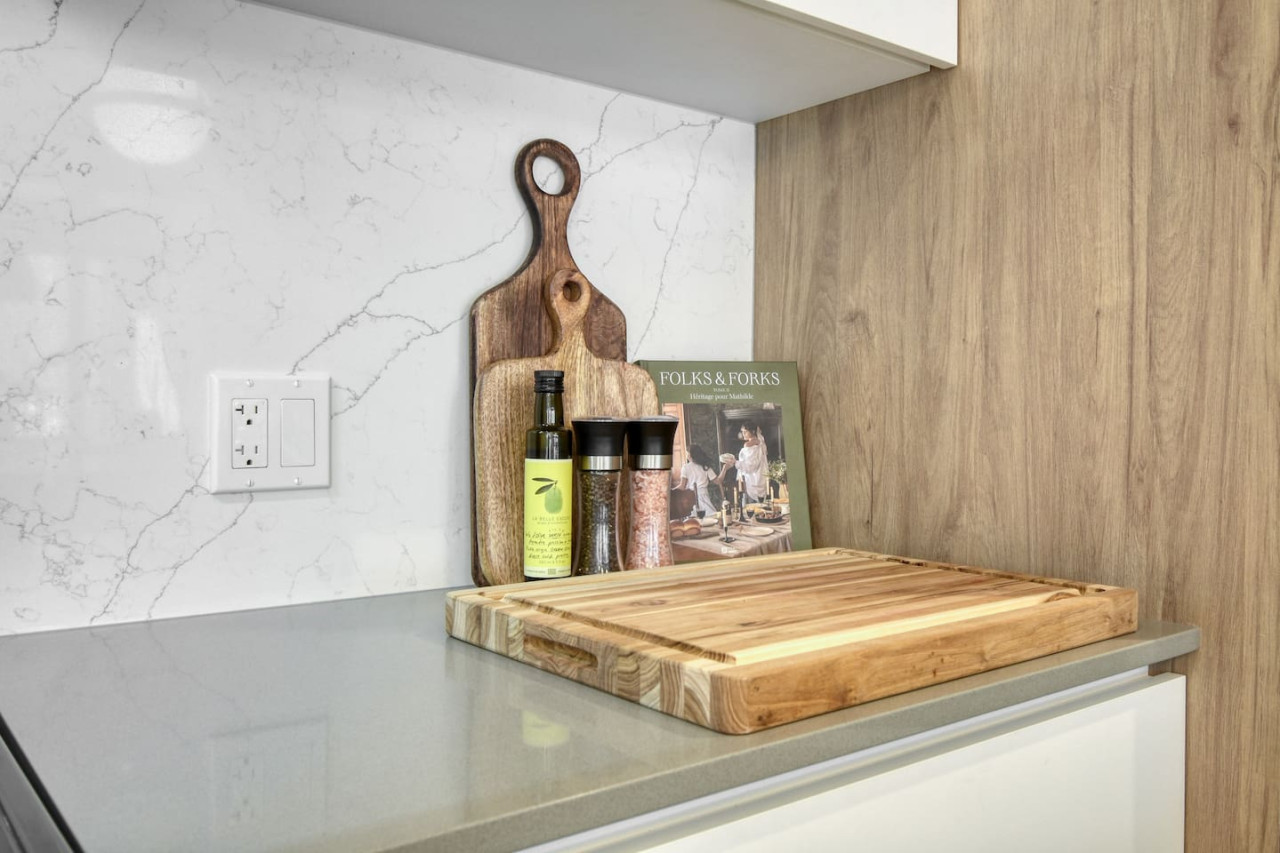 The living room is tastefully decorated and is set up with comfortable seating and a gas fireplace, perfect for unwinding after a day of adventure in the village. The living room couch is conveniently a double sofa bed for extra sleeping space. Equipped with state-of-the-art appliances, and cookware, the kitchen is ready for you to prepare delicious homemade meals.