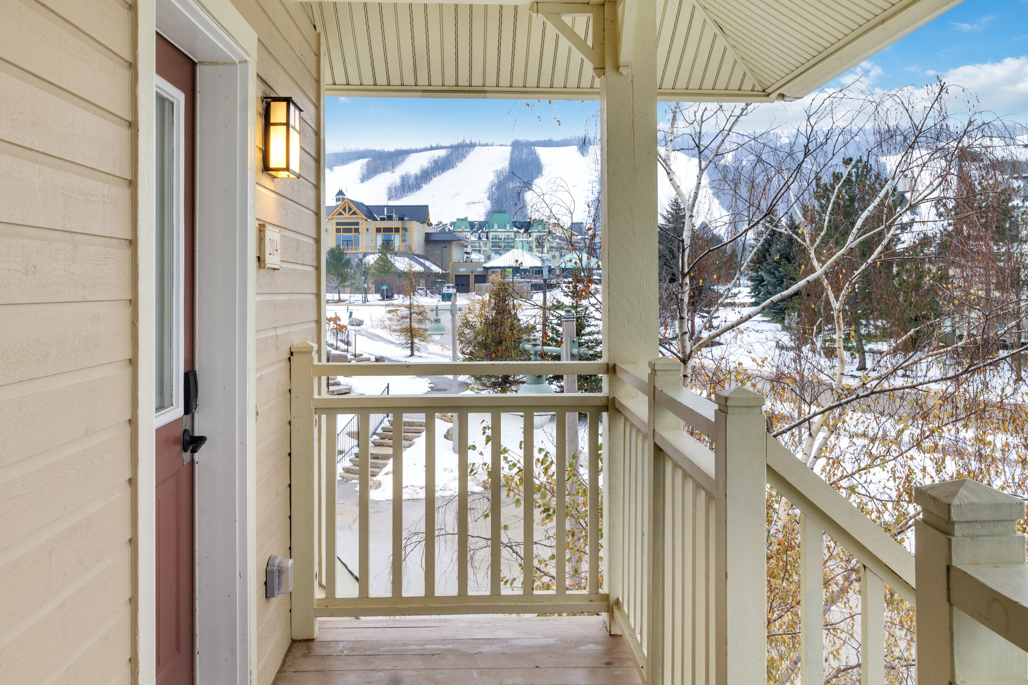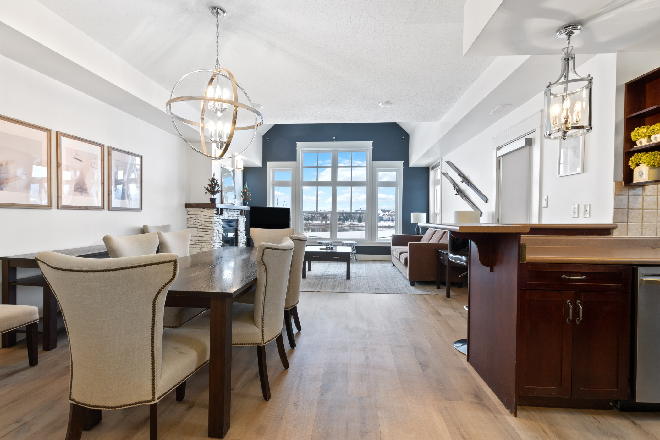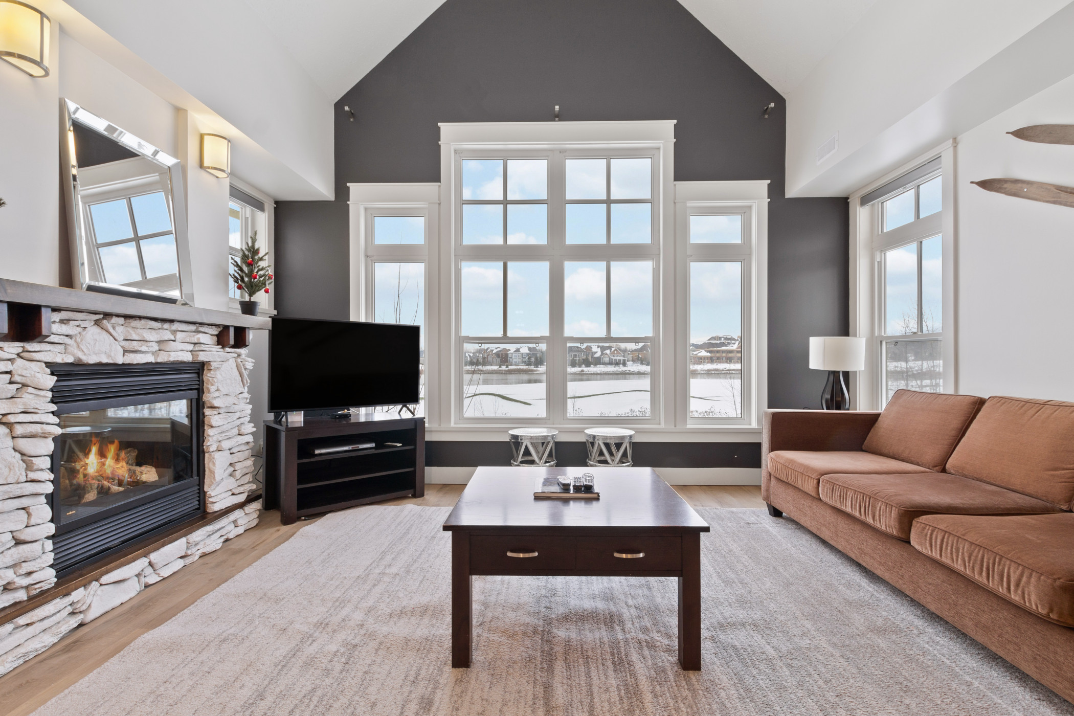 This exceptional Great Room was designed for guests to enjoy the abundance of natural light through the oversized windows surrounding the room, featuring vaulted ceilings for a bright and spacious feel. Entertain by the fire after your evening stroll to the village or enjoy a movie on a night-in on the flat-screen TV. Just steps away from your balcony walkout, enjoy a glimpse of the mountains without ever leaving your private retreat. The couch in the living room is a Queen pull-out for additional sleeping.