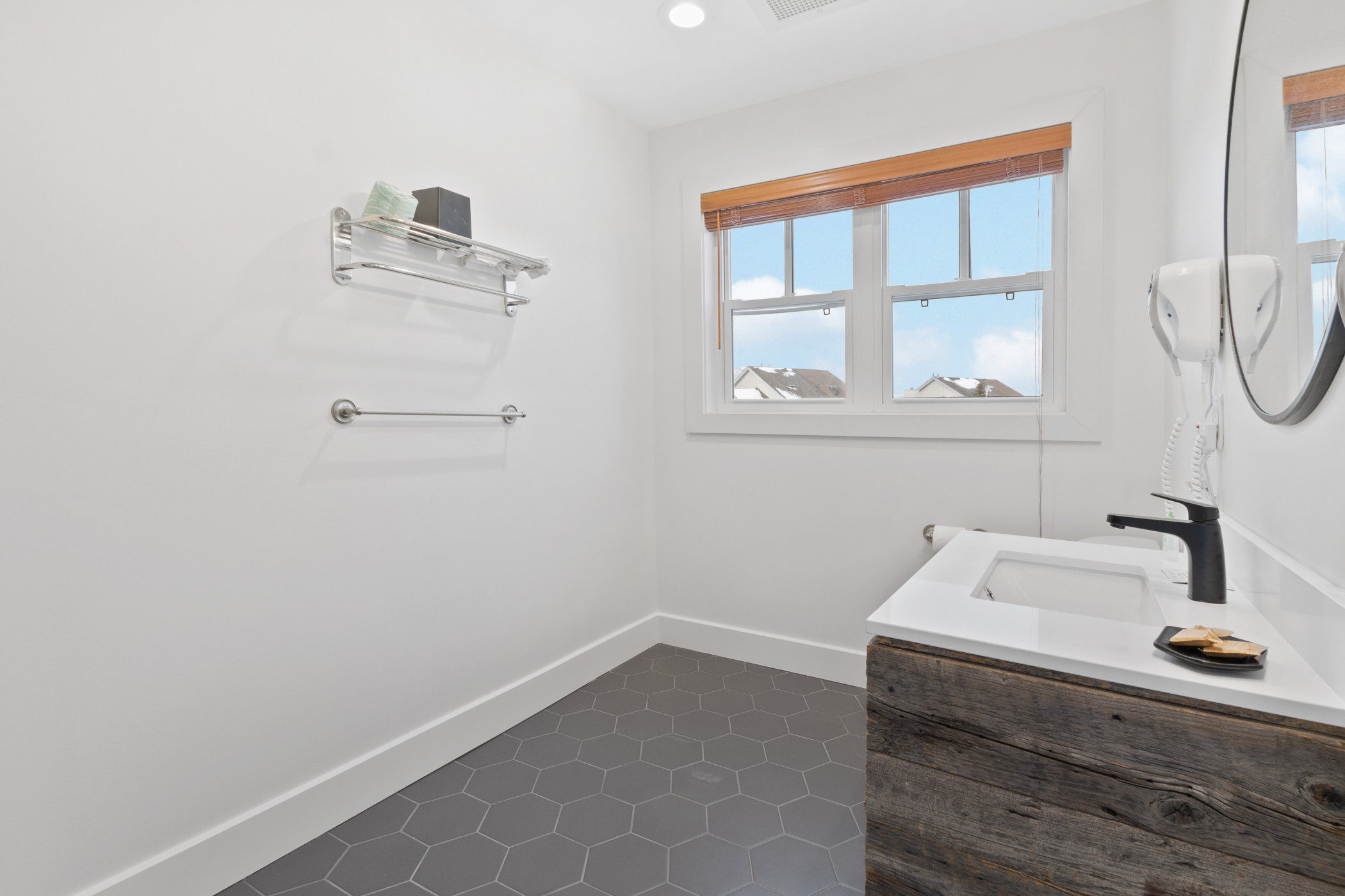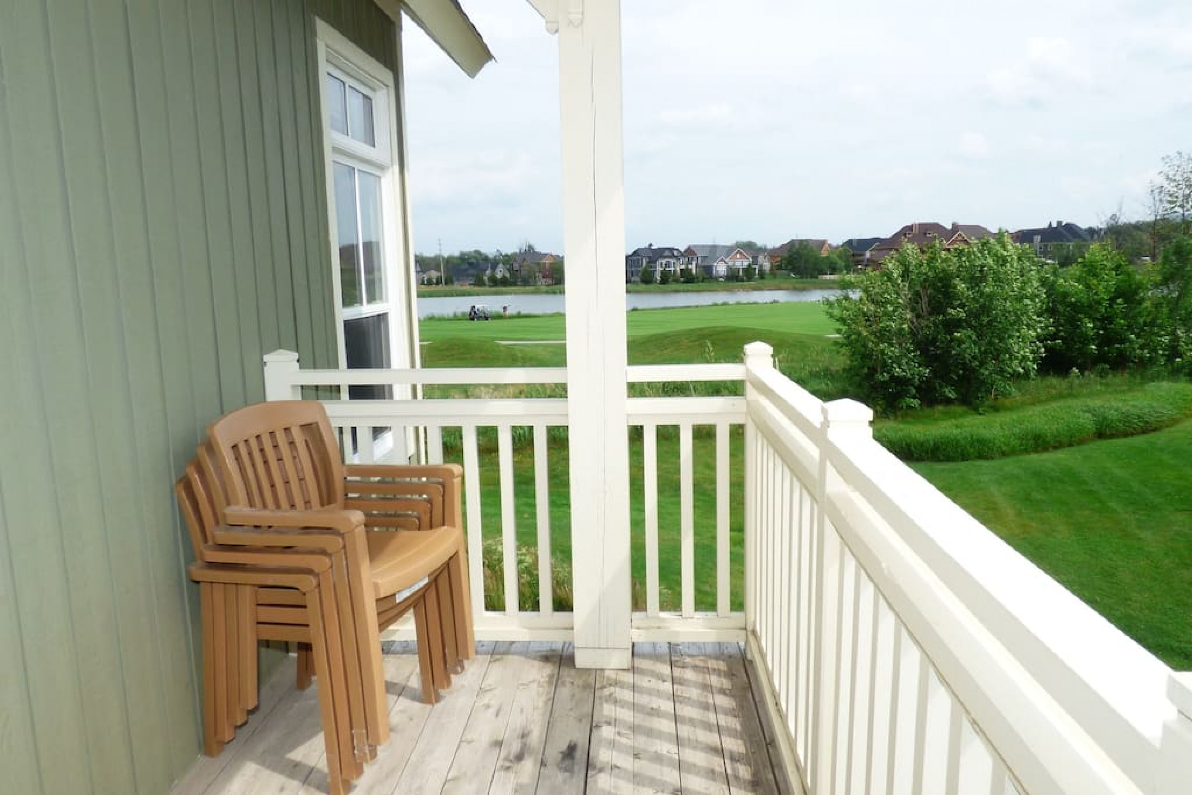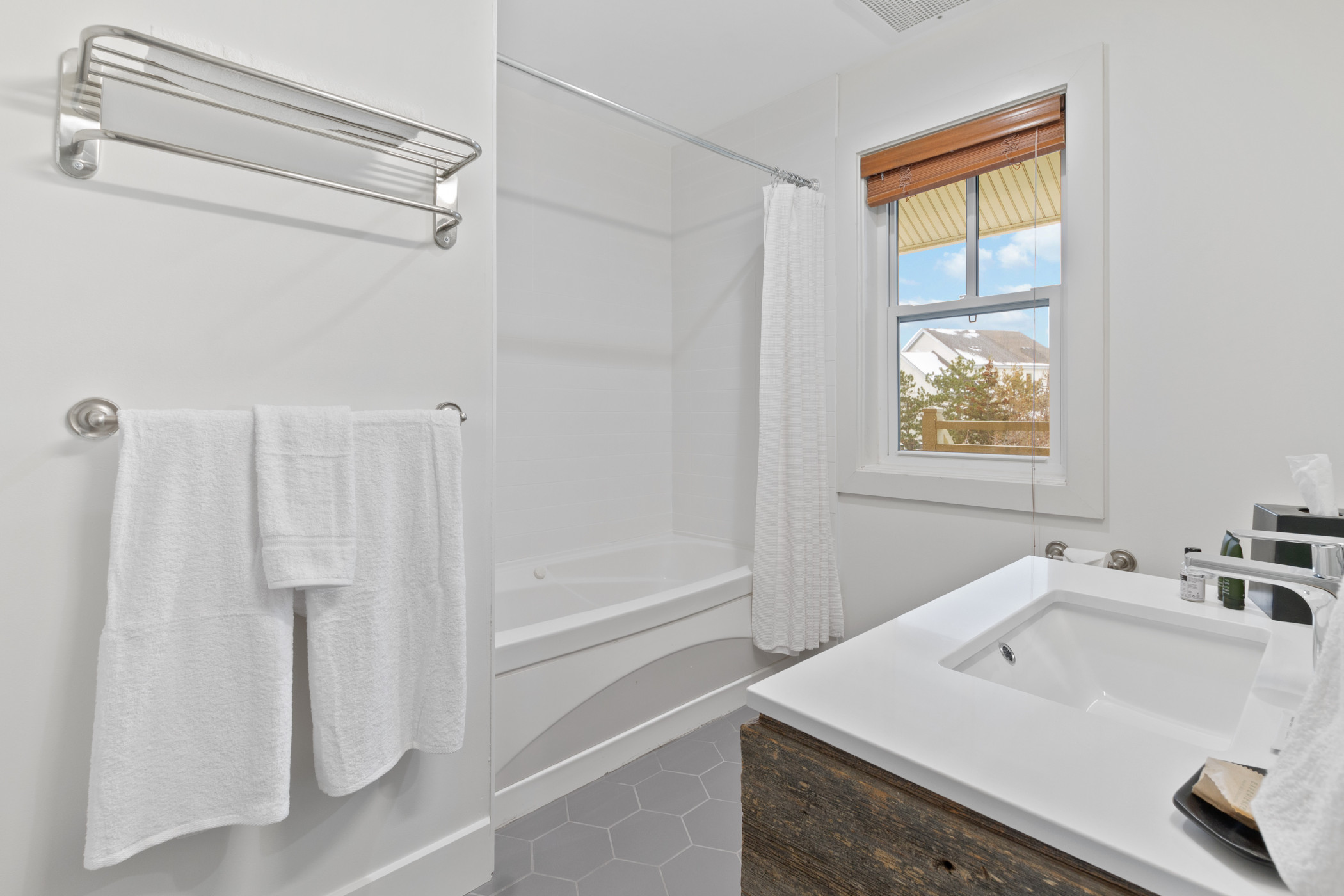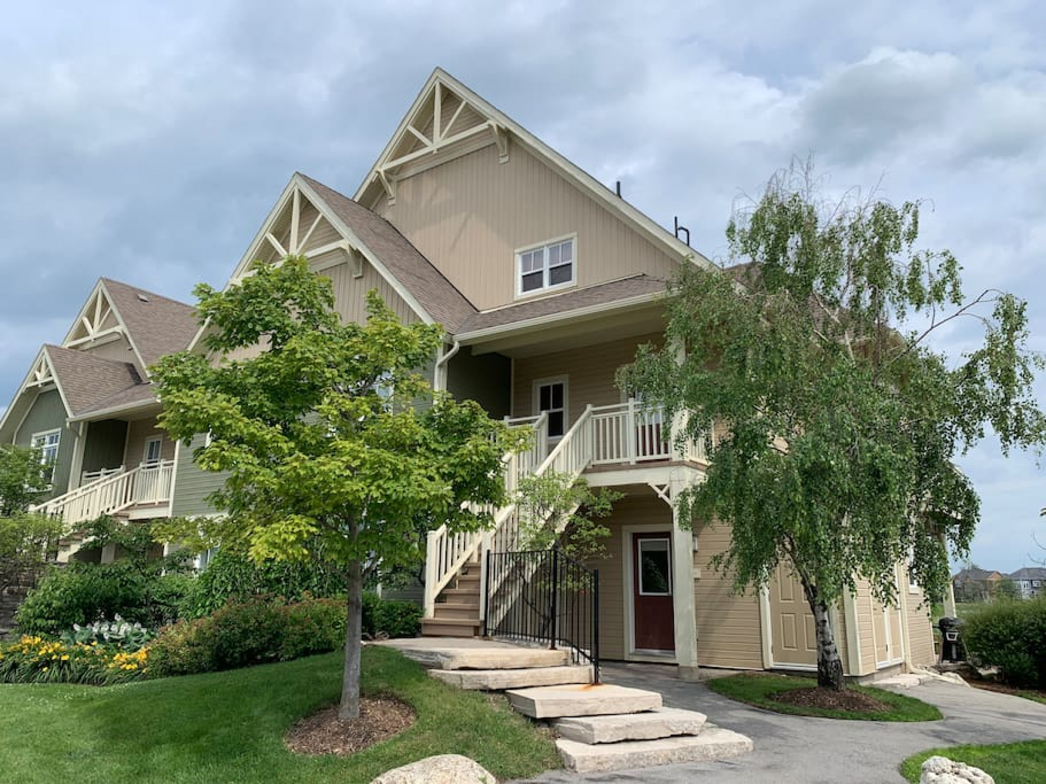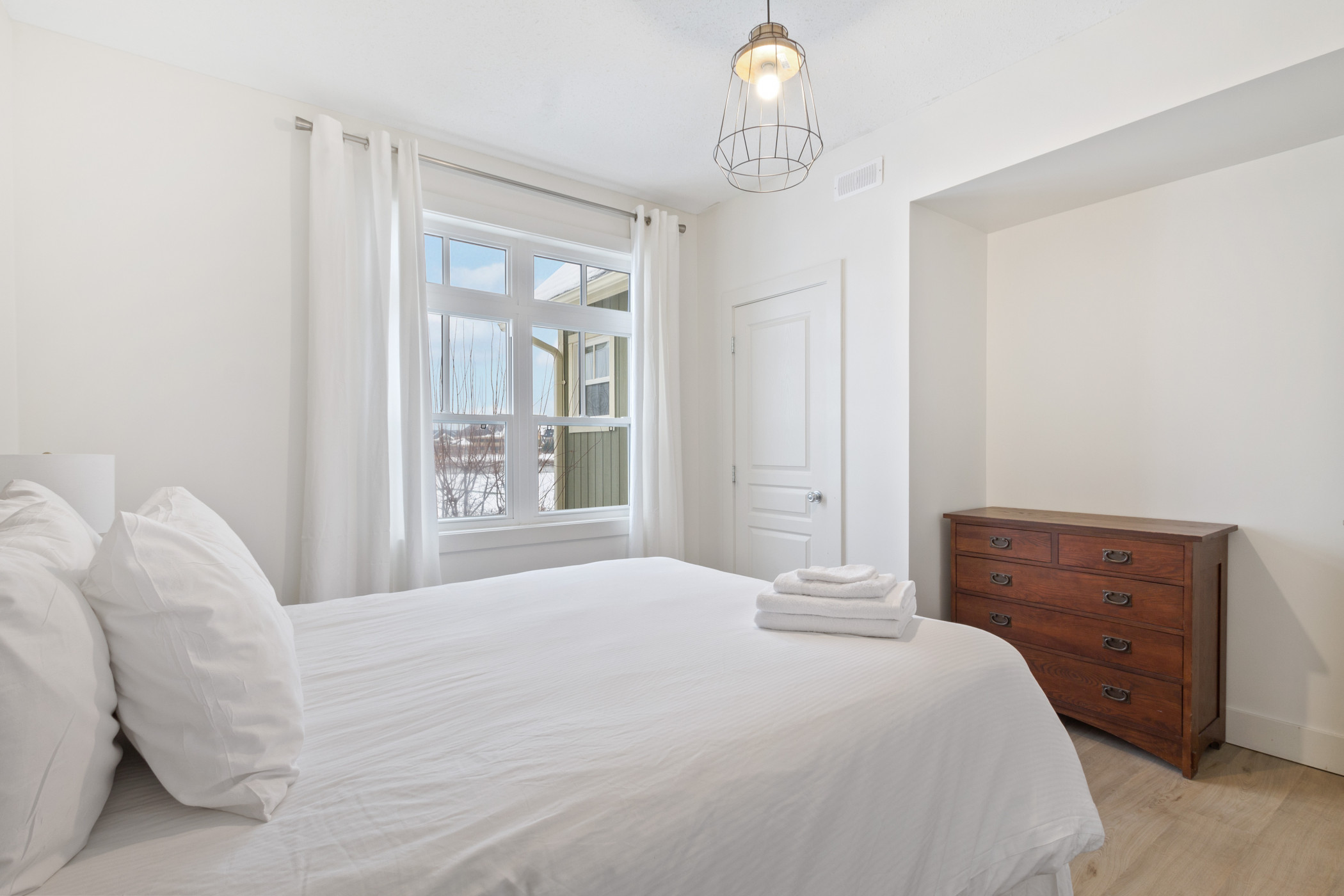 Your Blue Mountain rental has easy one-floor living with two bedrooms on the main floor. The first contains a Queen bed with morning views of the golf course through the large window. As you pass the four-piece bathroom, you’ll find another spacious bedroom containing two Twin beds with plenty of storage space. Upstairs, you’ll find the primary suite with King Bed and a three-piece ensuite. Guests in this room can enjoy the sunrise over the golf course and pond. The couch in the living room is a Queen pull-out for additional sleeping. All linens, pillows, and towels are included in your stay!