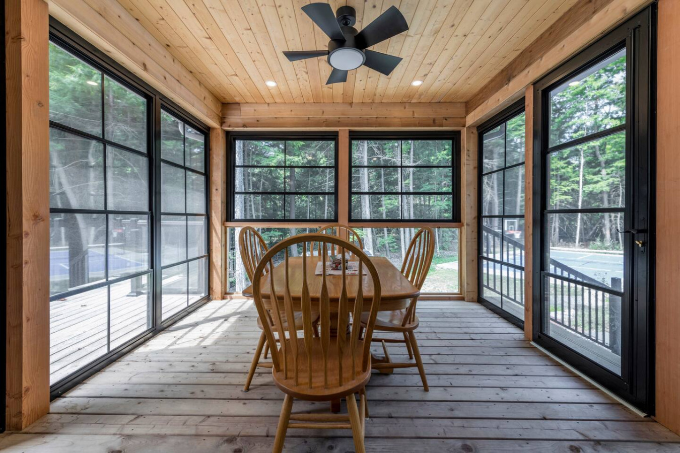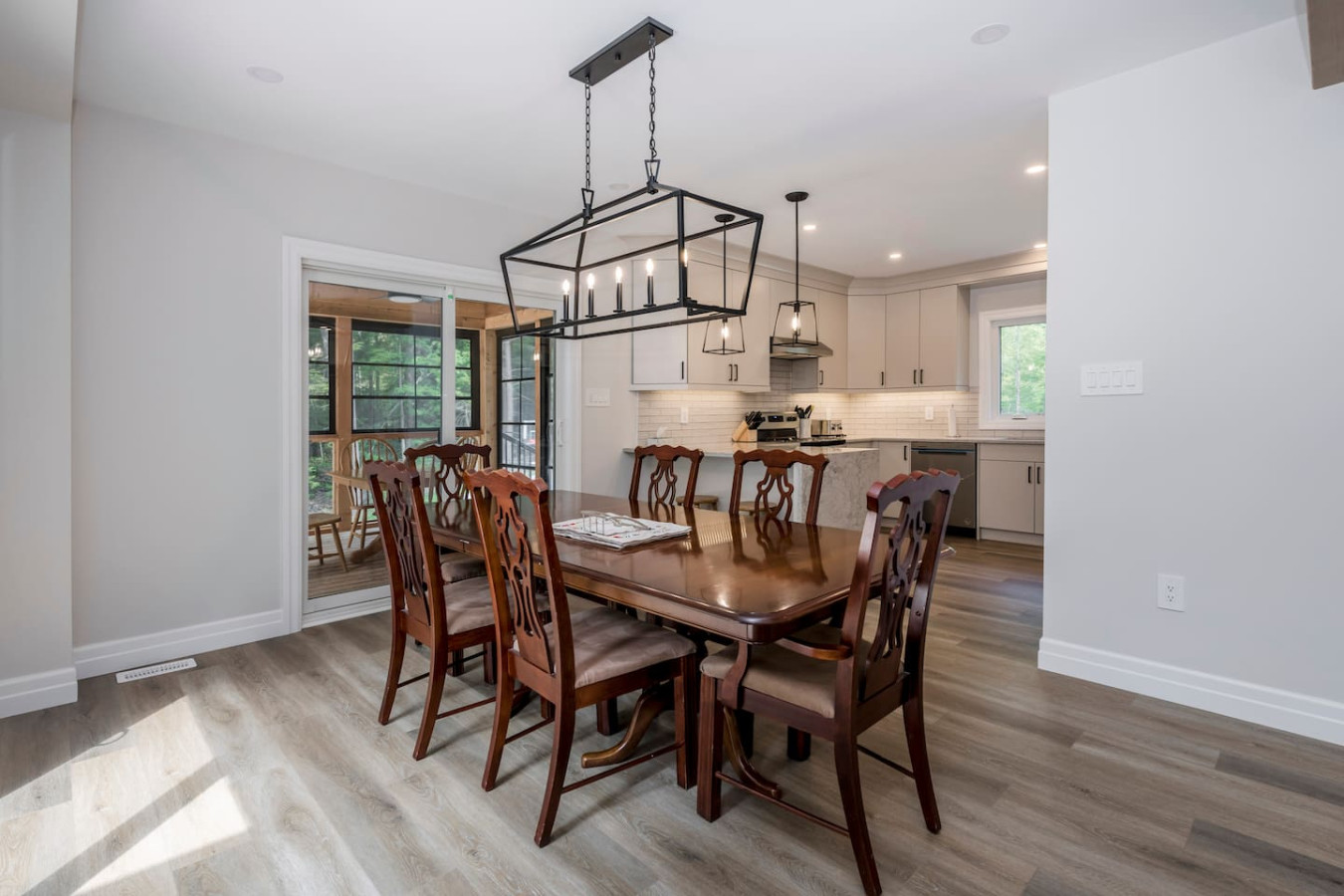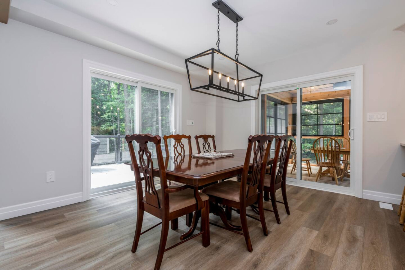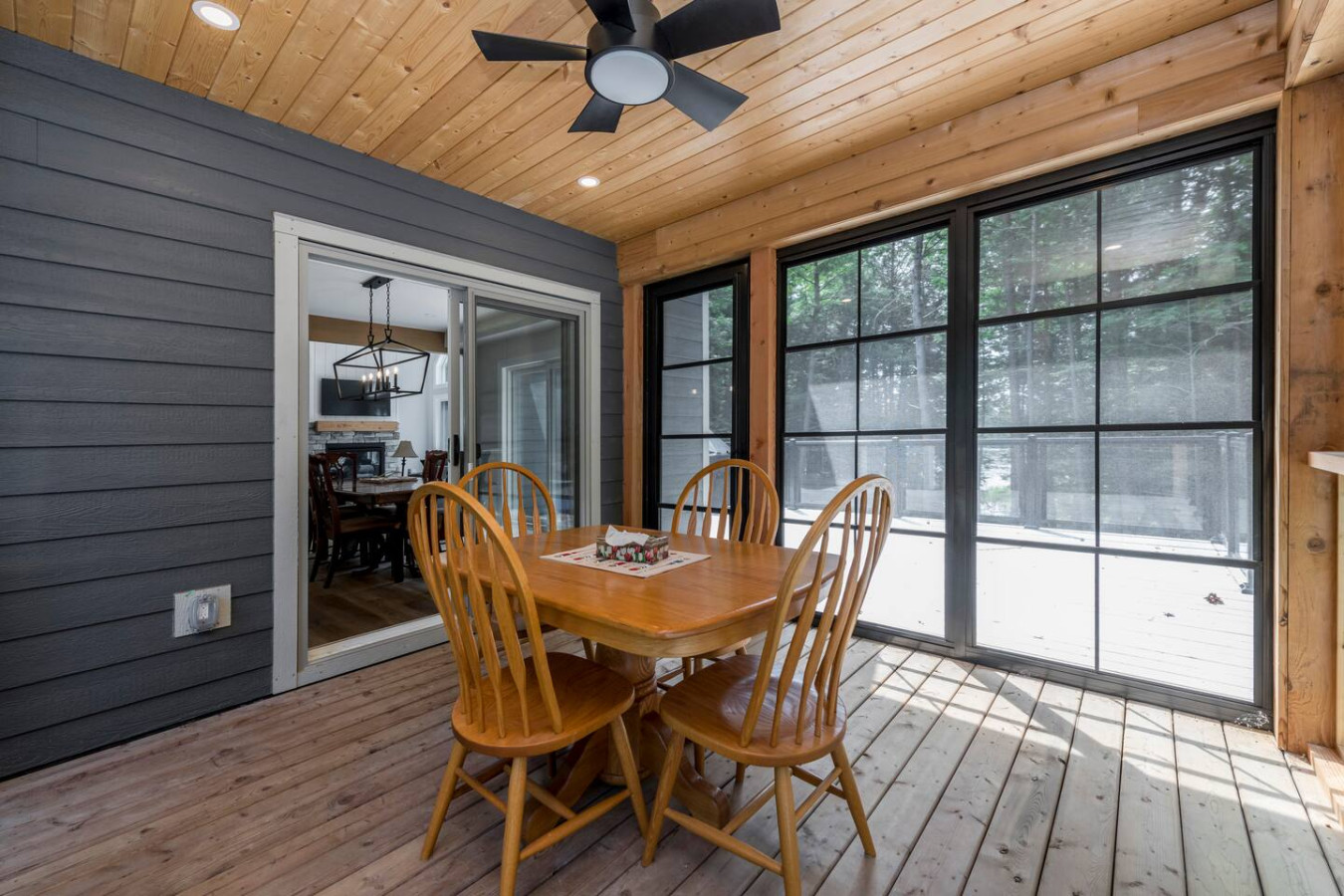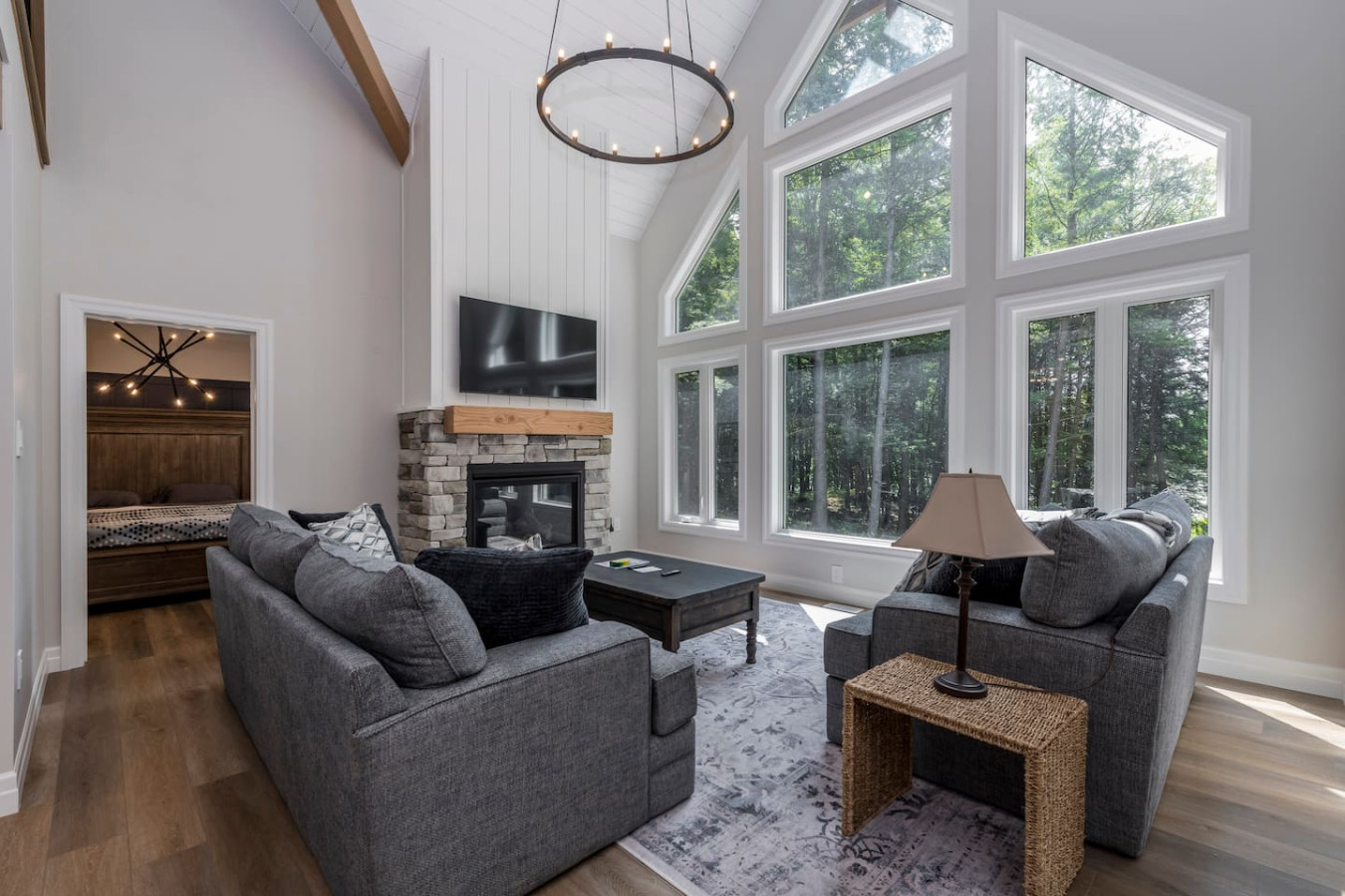 The living room surrounds you with large windows, a stone gas fireplace, and plush sofas overlooking the forest. Perfect for gathering, you can enjoy cozy evenings by the fire, stream a movie on the Smart TV, or simply soak in the natural light. Dine together in the open-concept space or enjoy the Muskoka room - a screened-in porch that lets you take in the outdoors without the bugs.