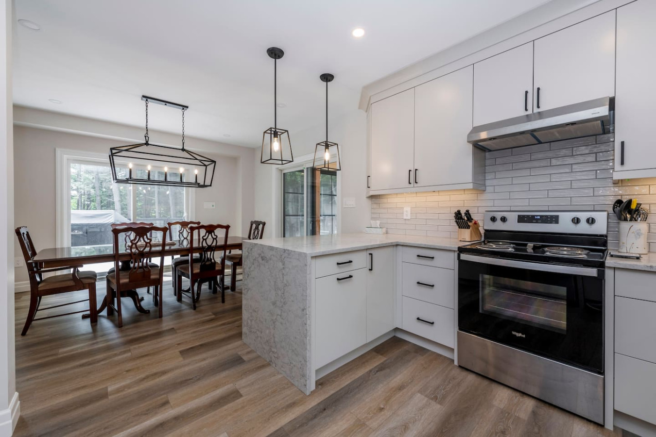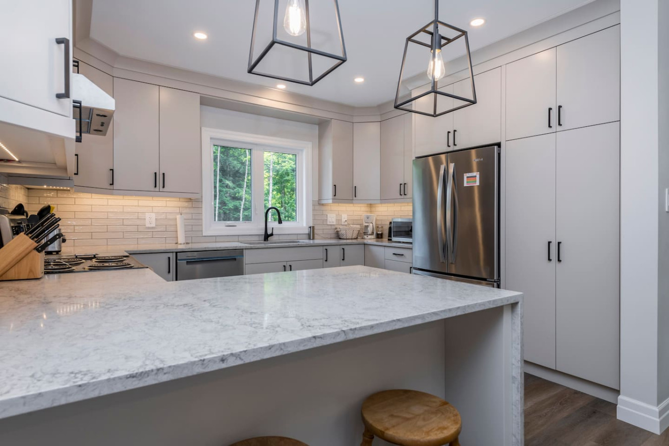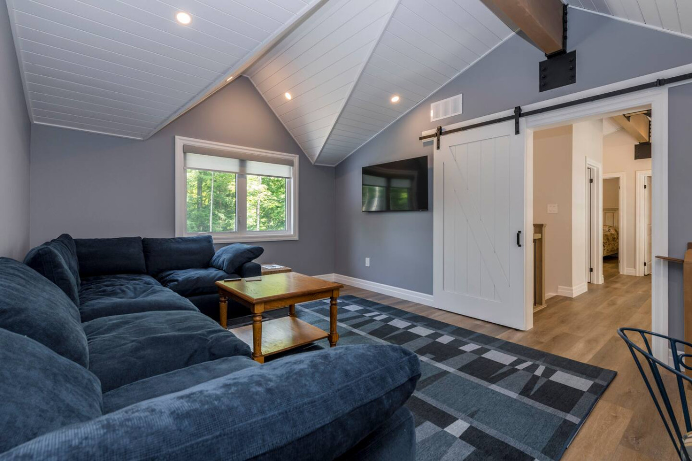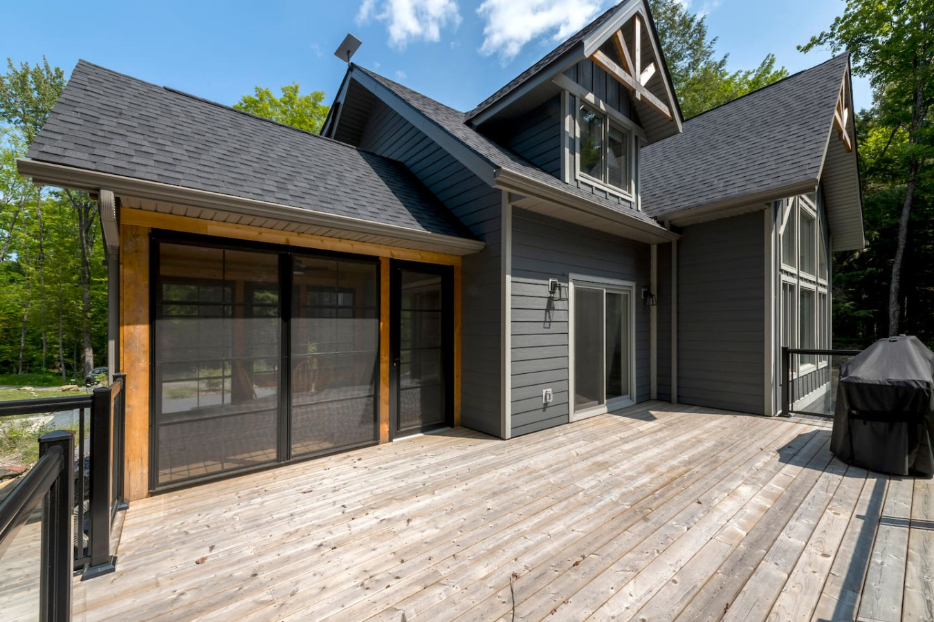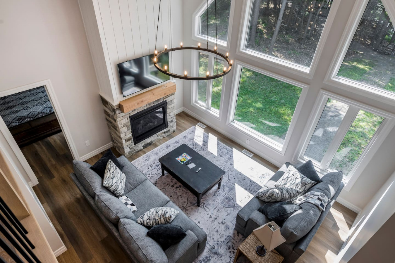 The living room surrounds you with large windows, a stone gas fireplace, and plush sofas overlooking the forest. Perfect for gathering, you can enjoy cozy evenings by the fire, stream a movie on the Smart TV, or simply soak in the natural light. Dine together in the open-concept space or enjoy the Muskoka room - a screened-in porch that lets you take in the outdoors without the bugs.