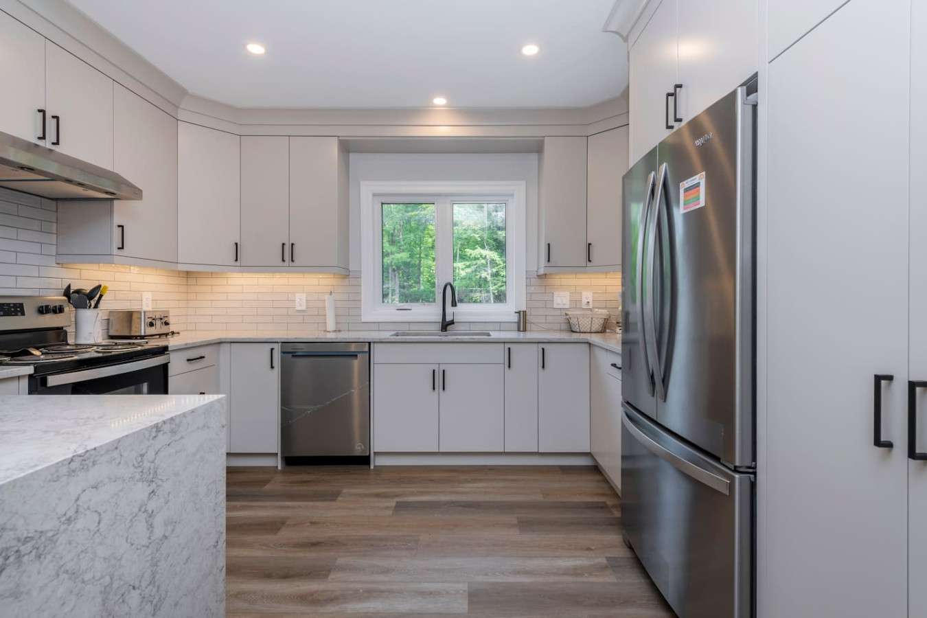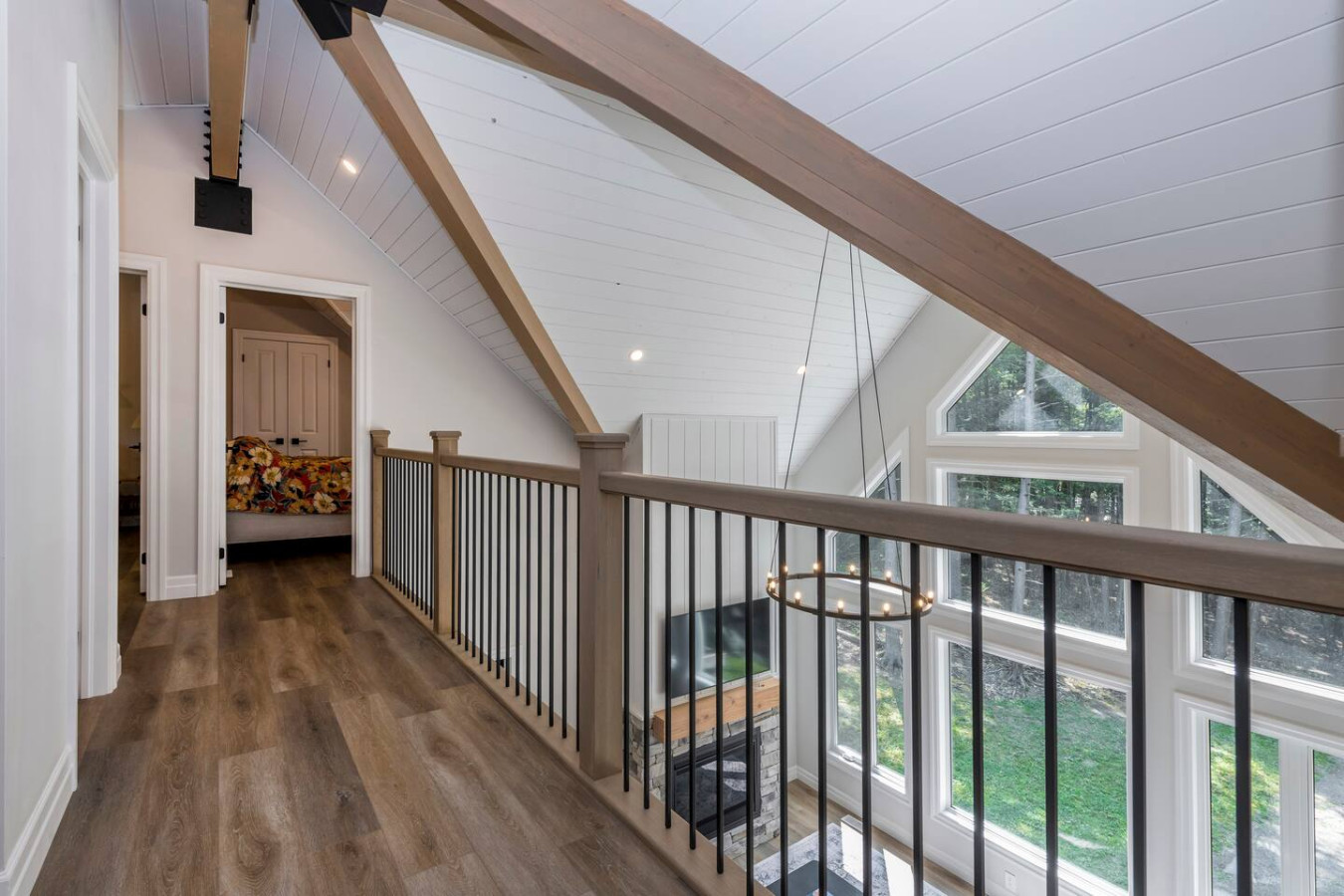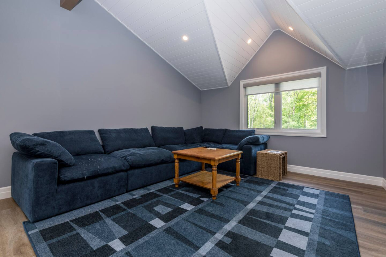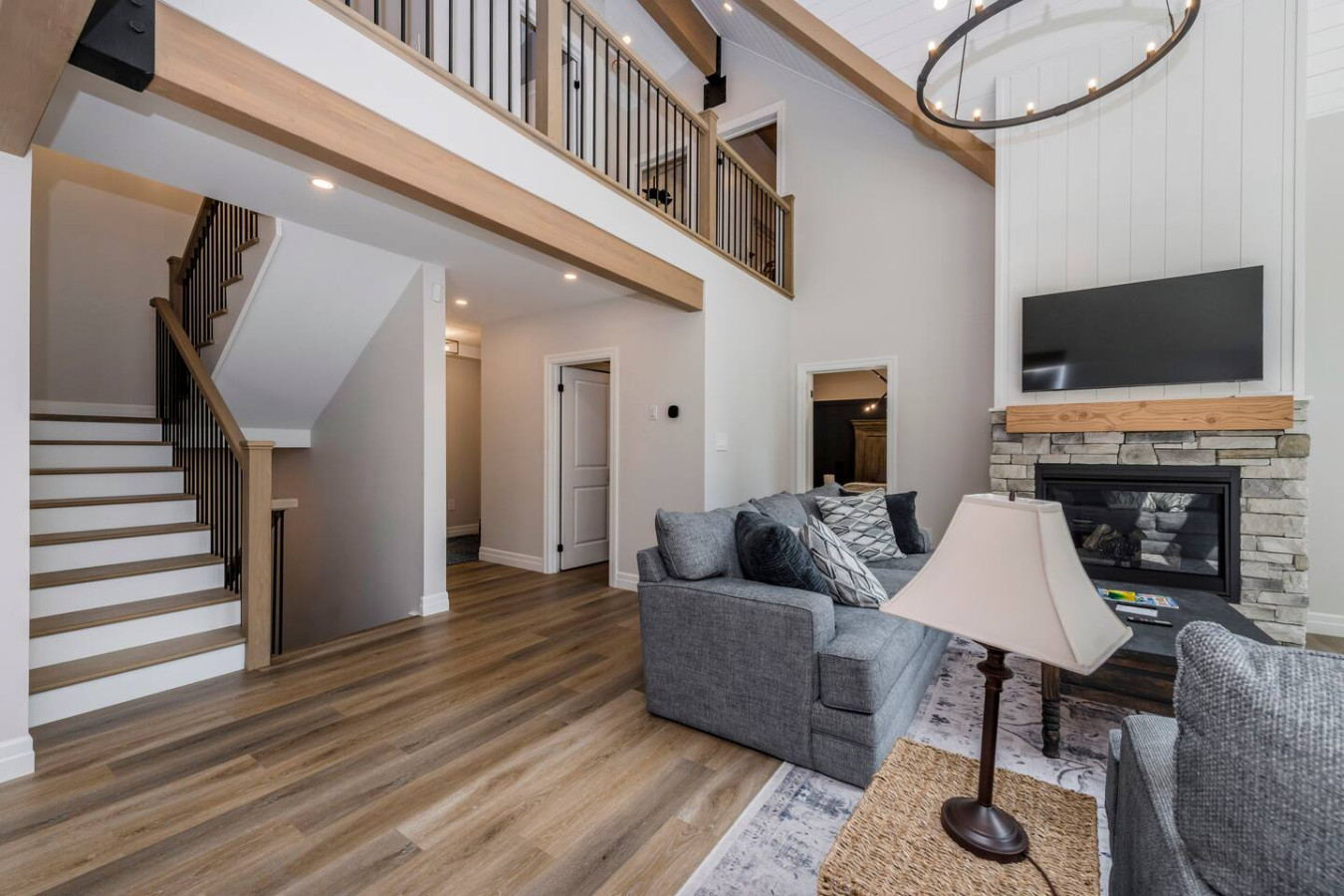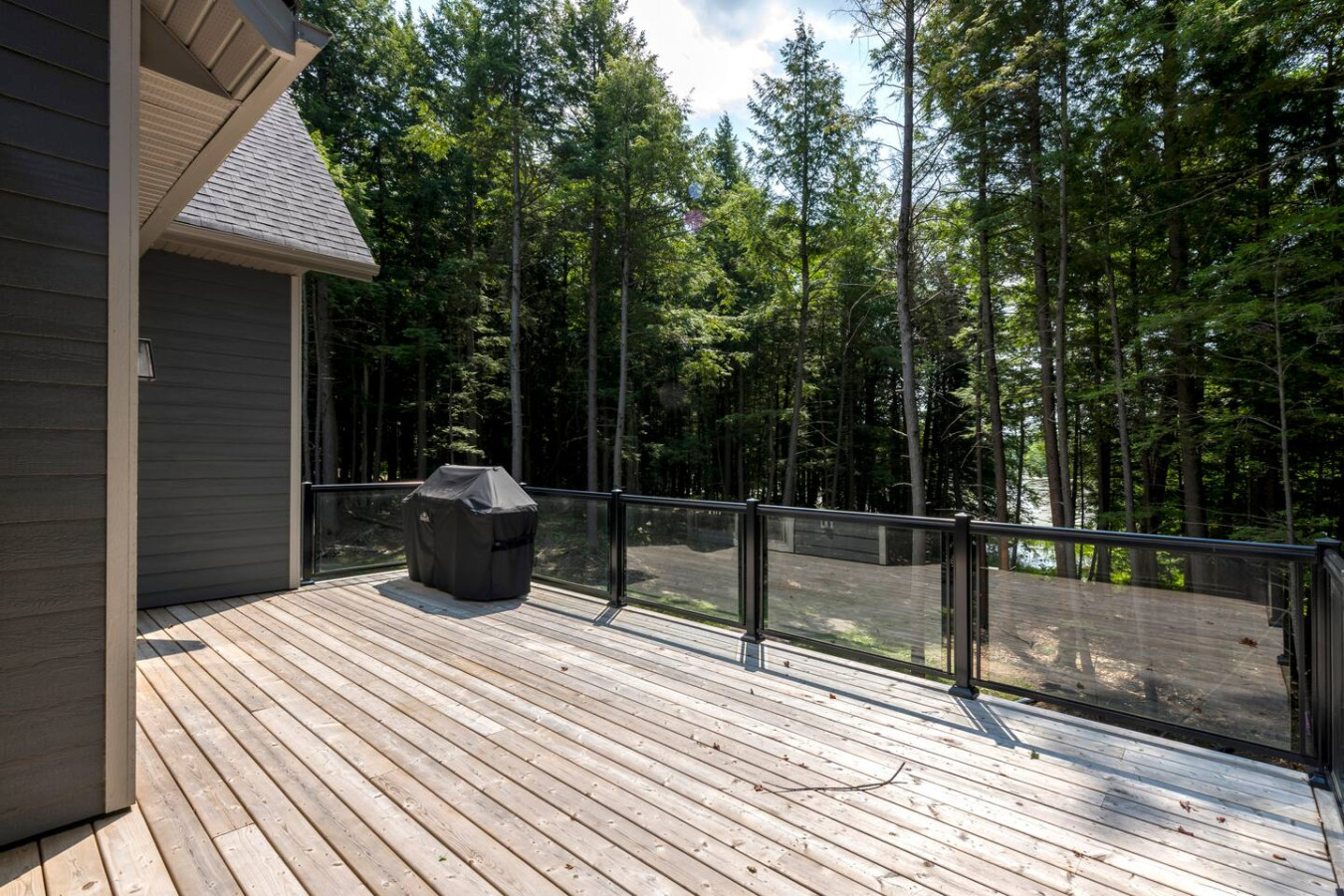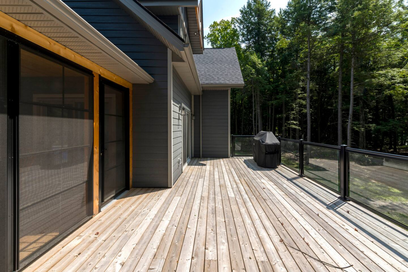 The living room surrounds you with large windows, a stone gas fireplace, and plush sofas overlooking the forest. Perfect for gathering, you can enjoy cozy evenings by the fire, stream a movie on the Smart TV, or simply soak in the natural light. Dine together in the open-concept space or enjoy the Muskoka room - a screened-in porch that lets you take in the outdoors without the bugs.