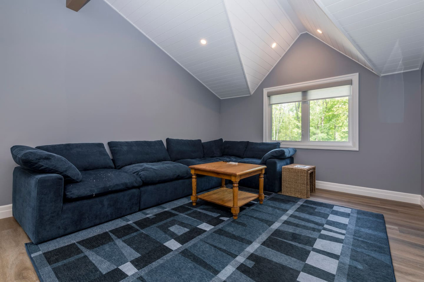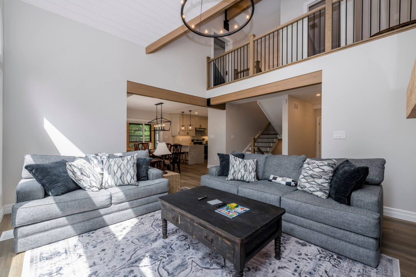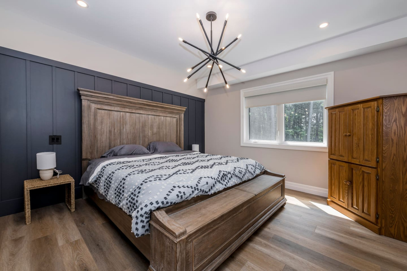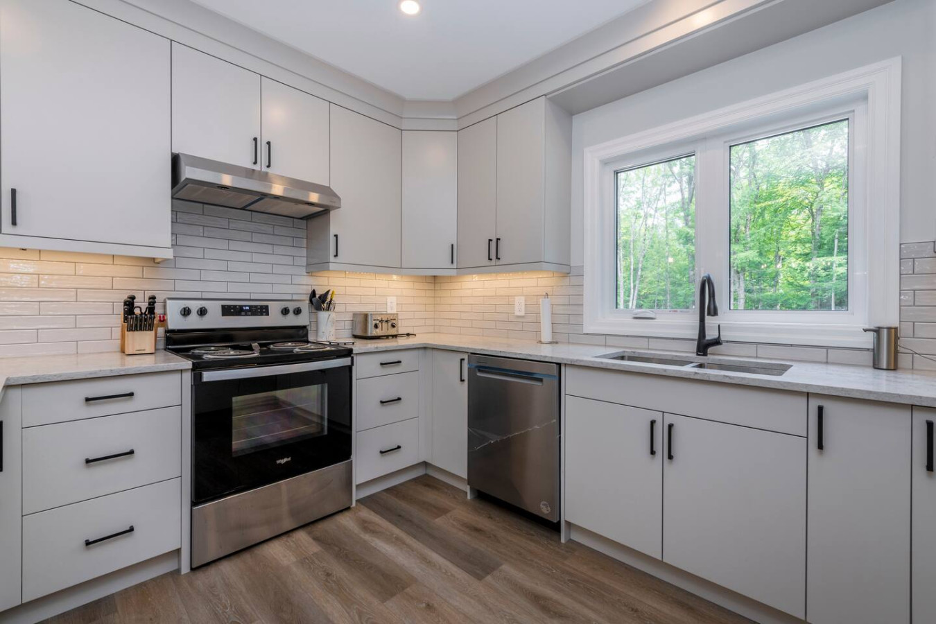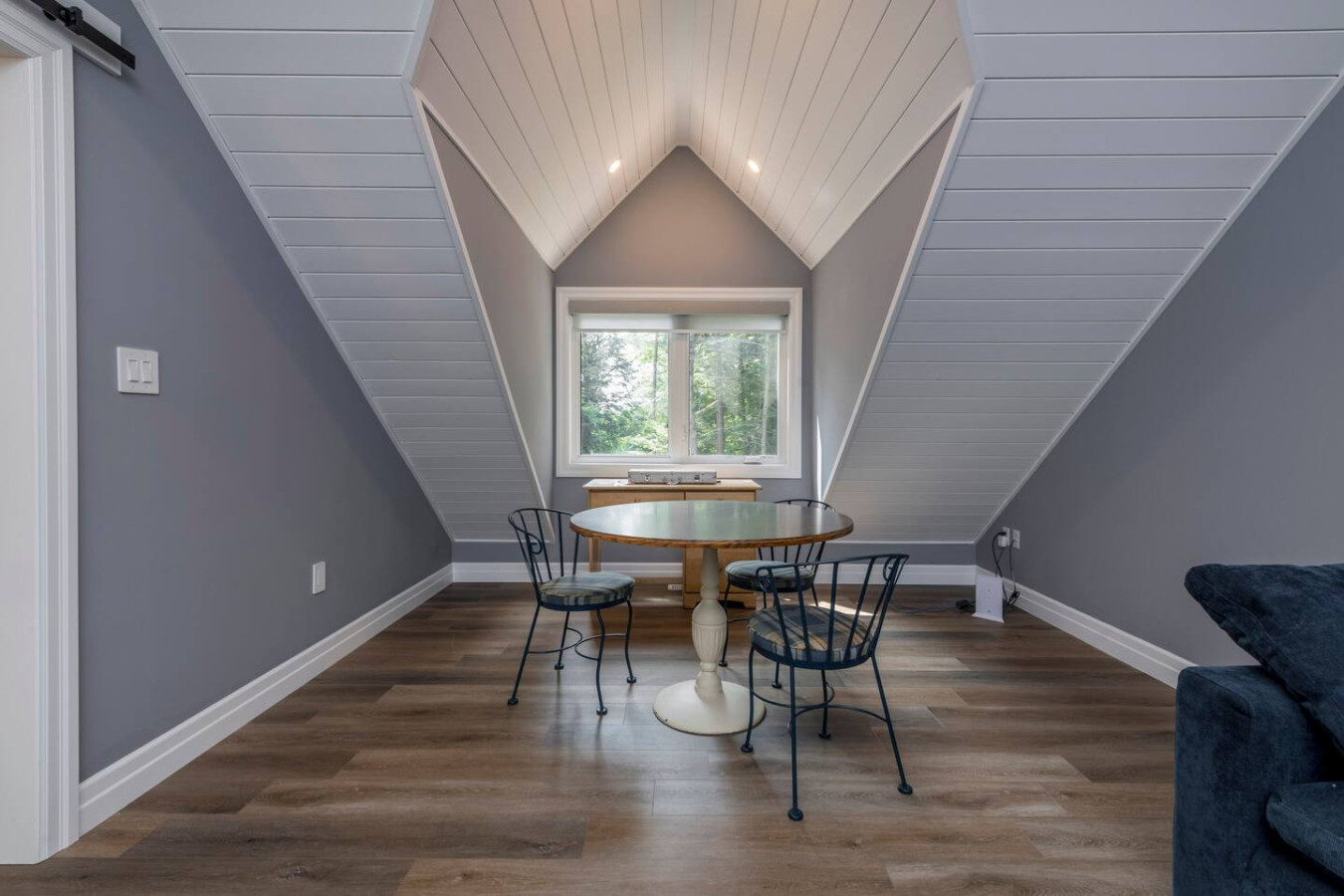The living room surrounds you with large windows, a stone gas fireplace, and plush sofas overlooking the forest. Perfect for gathering, you can enjoy cozy evenings by the fire, stream a movie on the Smart TV, or simply soak in the natural light. Dine together in the open-concept space or enjoy the Muskoka room - a screened-in porch that lets you take in the outdoors without the bugs.
