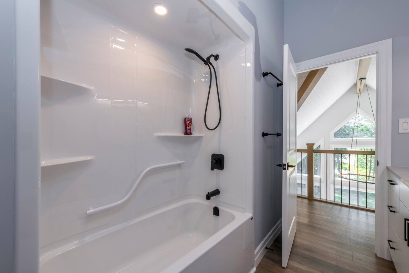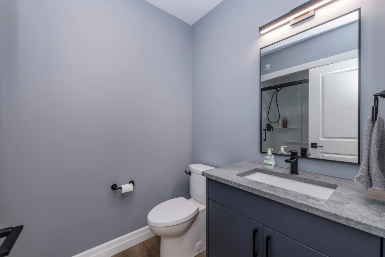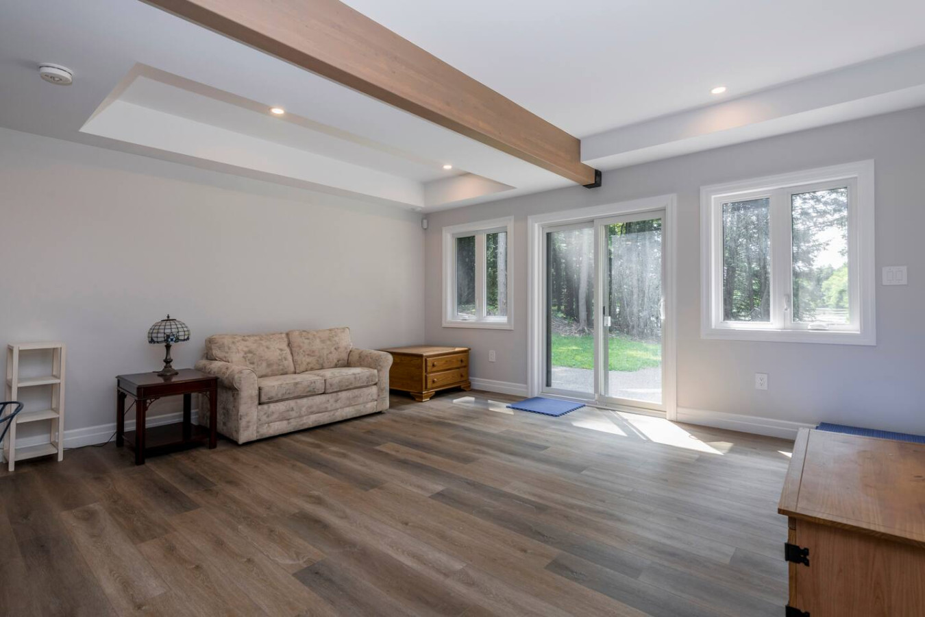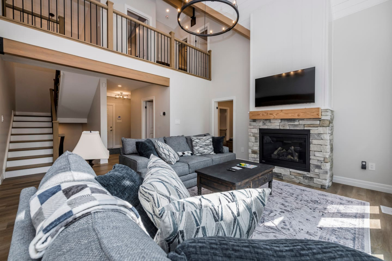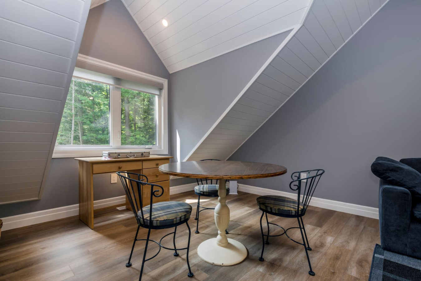 The living room surrounds you with large windows, a stone gas fireplace, and plush sofas overlooking the forest. Perfect for gathering, you can enjoy cozy evenings by the fire, stream a movie on the Smart TV, or simply soak in the natural light. Dine together in the open-concept space or enjoy the Muskoka room - a screened-in porch that lets you take in the outdoors without the bugs.