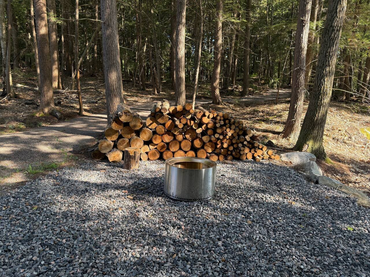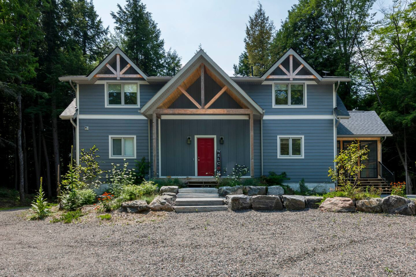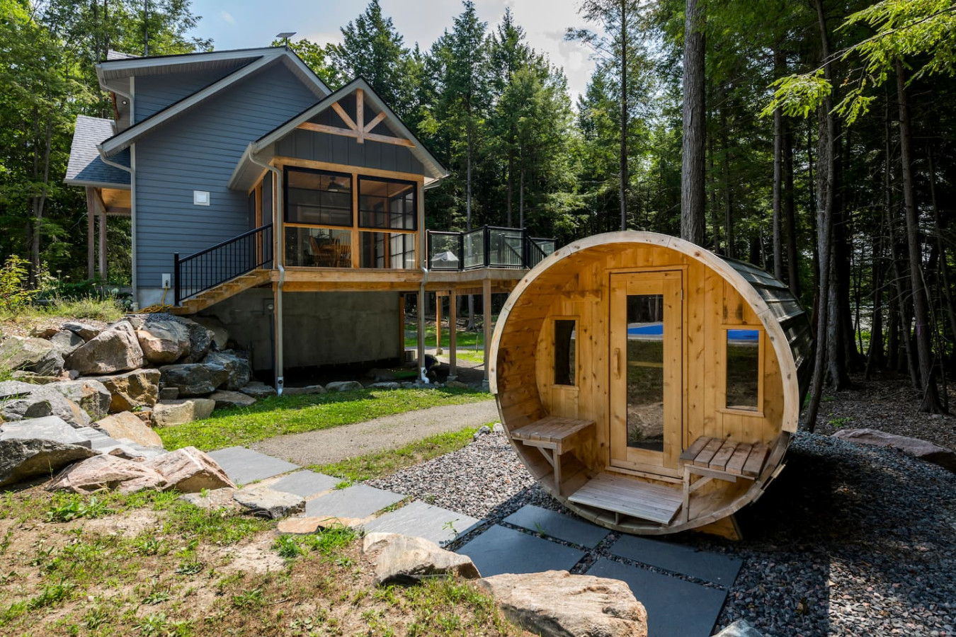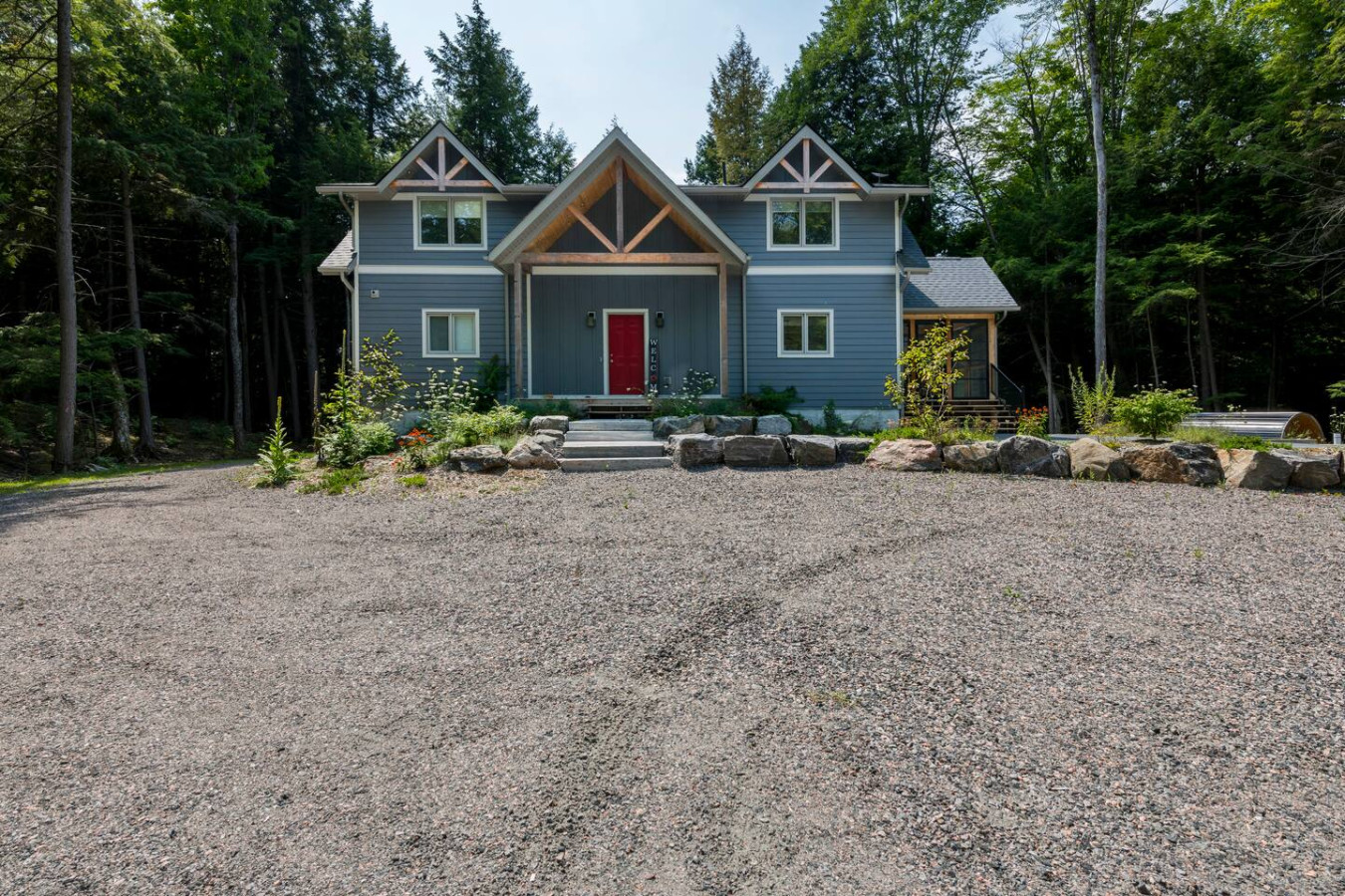 The outdoors here are just as inviting as the inside. Spend your afternoons enjoying the private multi-sport court, where you can play basketball, pickleball, volleyball, or badminton. Afterward, step into the wood-fired barrel sauna for some relaxation, or gather around the firepit for s’mores and stargazing. Trails weave through the property leading to the water, offering quiet moments immersed in nature. There is an access point to the water for launching your kayaks or paddle boards.