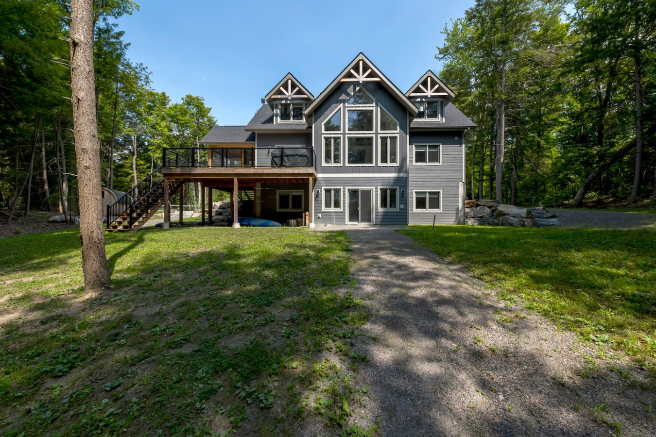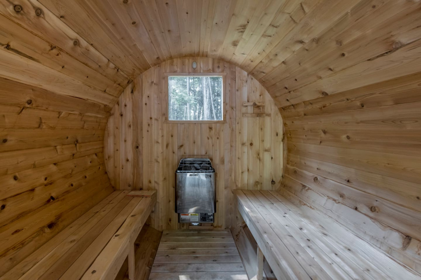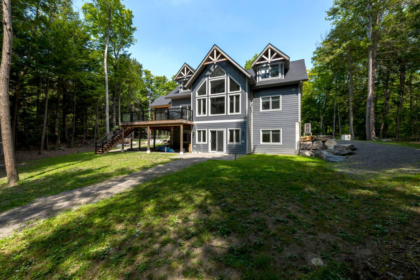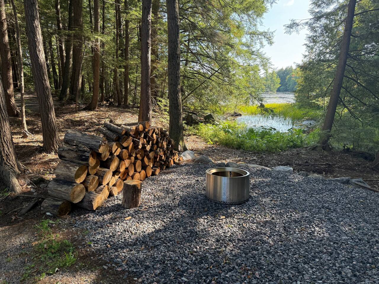 The outdoors here are just as inviting as the inside. Spend your afternoons enjoying the private multi-sport court, where you can play basketball, pickleball, volleyball, or badminton. Afterward, step into the wood-fired barrel sauna for some relaxation, or gather around the firepit for s’mores and stargazing. Trails weave through the property leading to the water, offering quiet moments immersed in nature. There is an access point to the water for launching your kayaks or paddle boards.