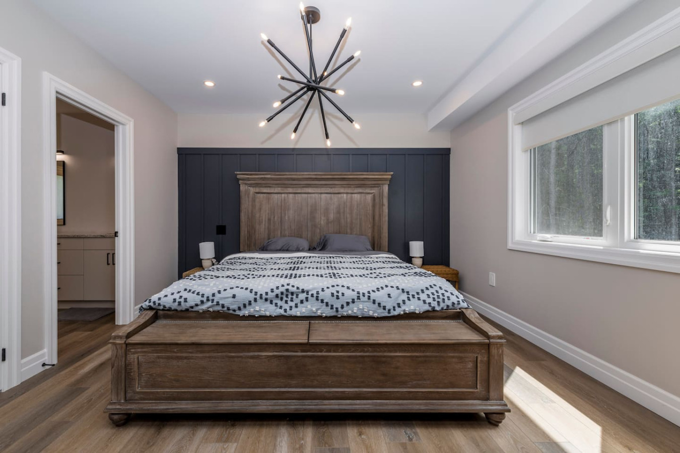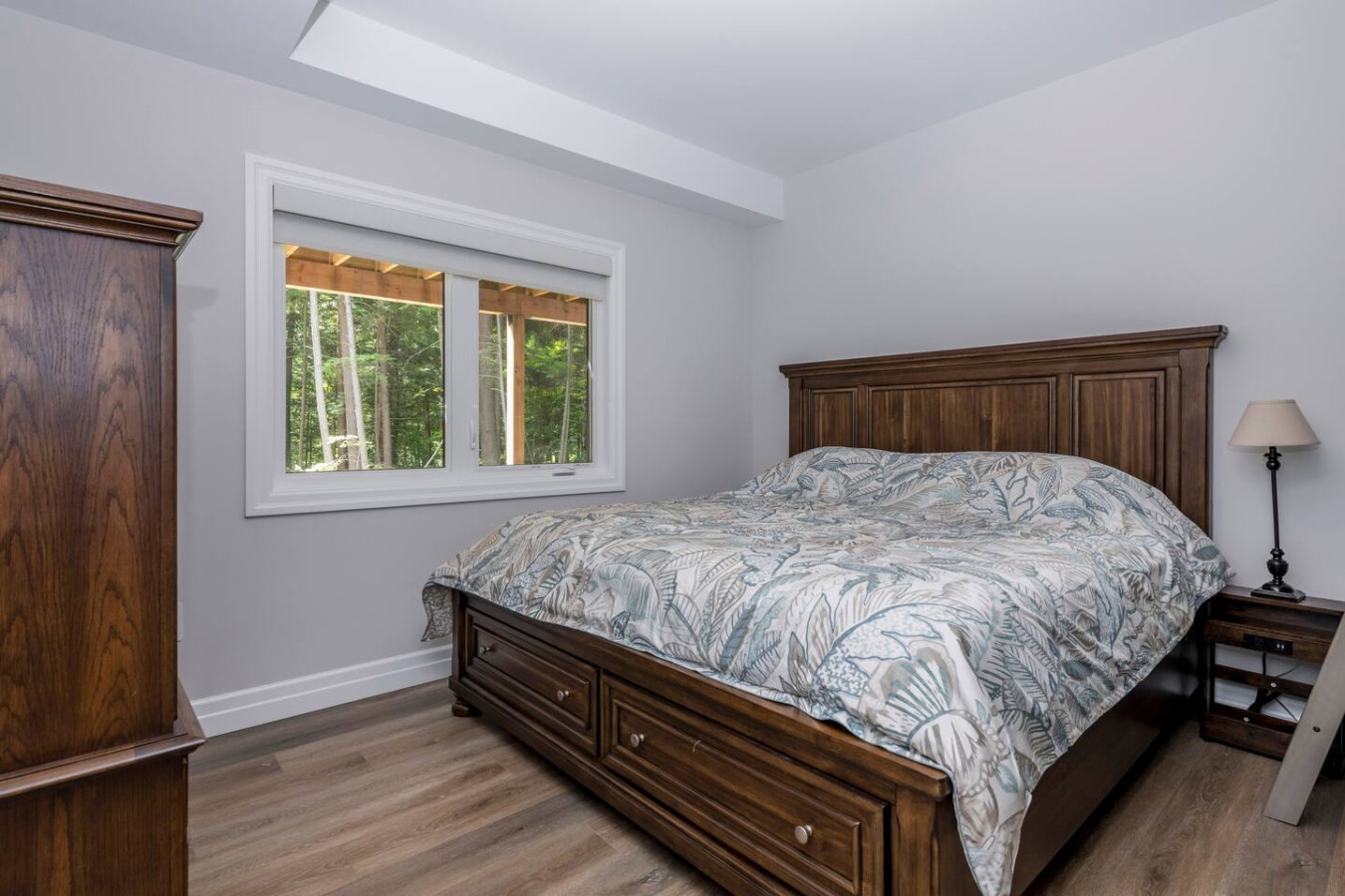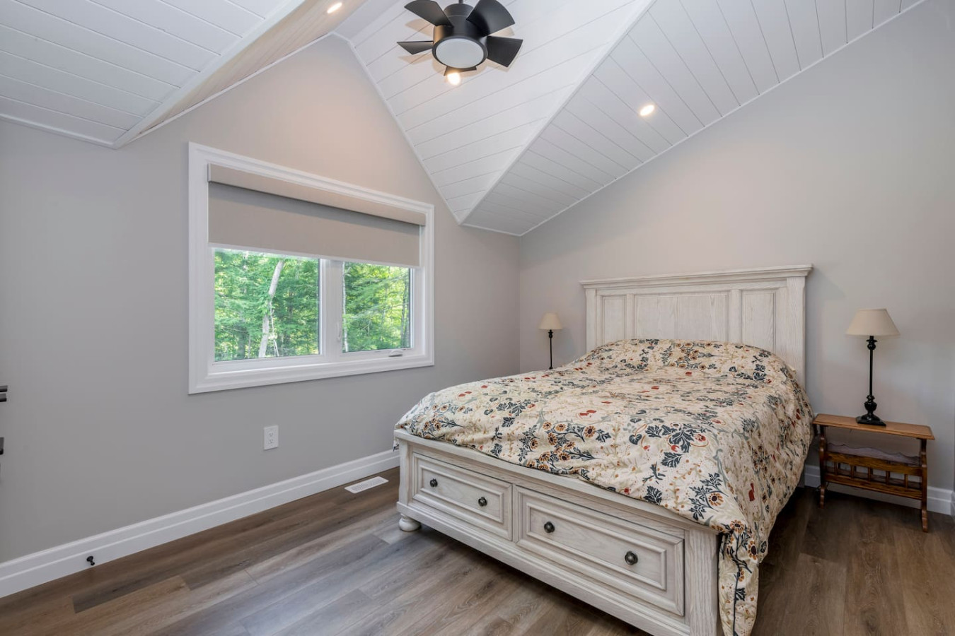 Each bedroom has cozy linens and peaceful views of the surrounding forest.