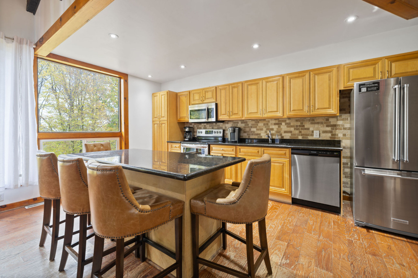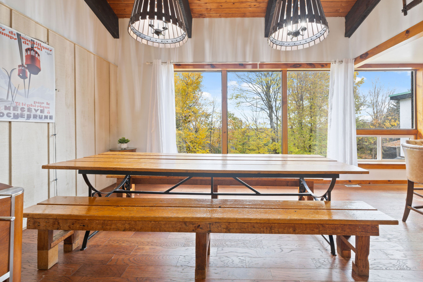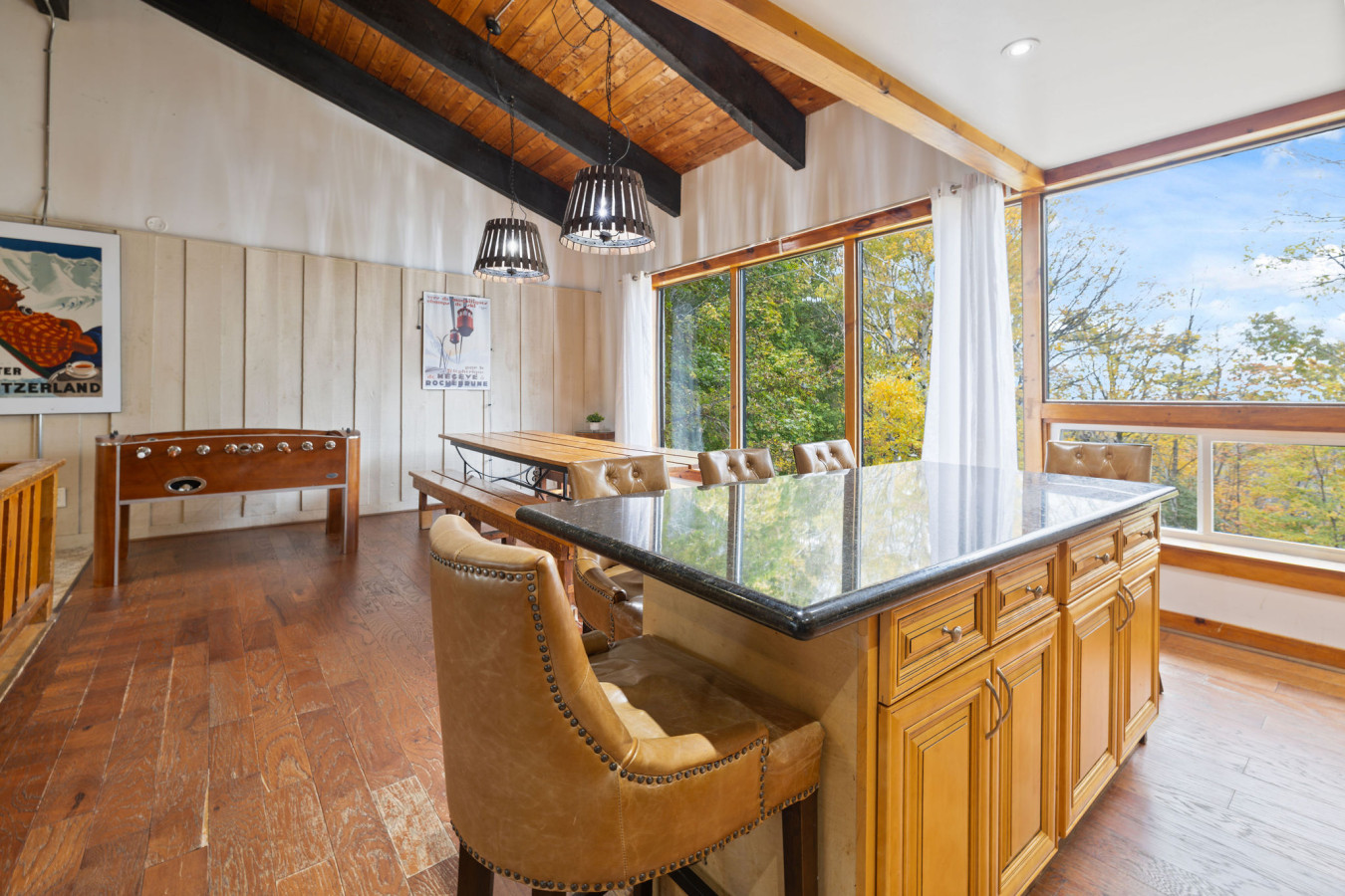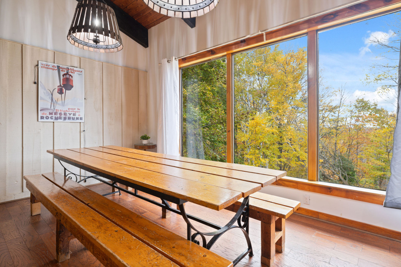 The swiss-style chalet has an open concept top floor featuring a super high ceiling with exposed wood beams. Kitchen, dining room and living room are all on the top floor making it a great place for families and friends to dine and hang out. There's also a large balcony at the back of this top floor with propane BBQ and patio furniture to enjoy your gourmet food outdoors.