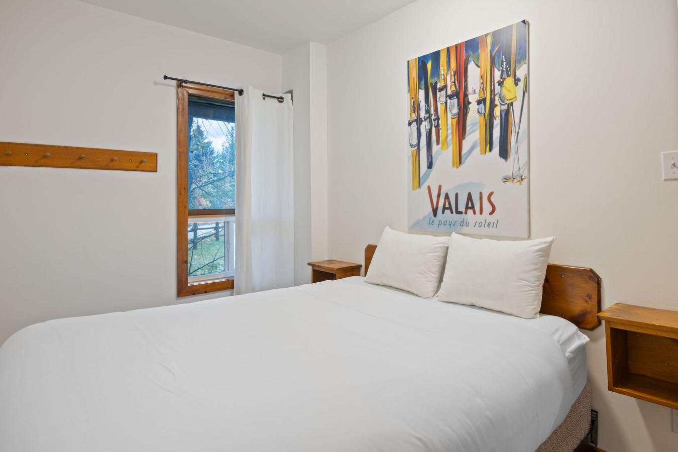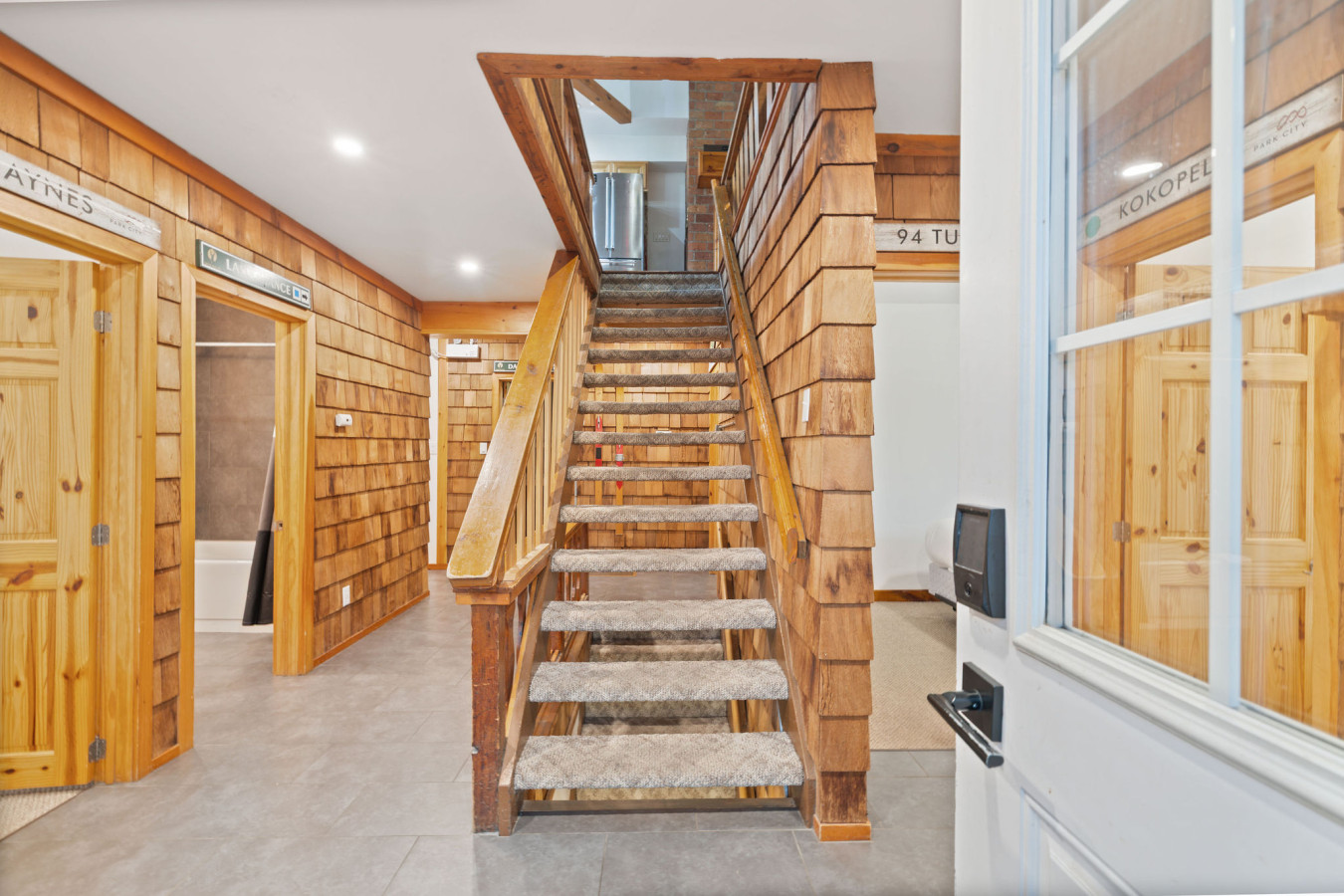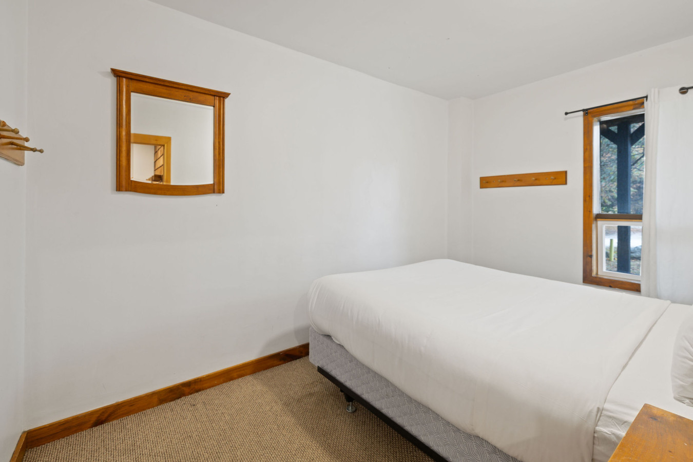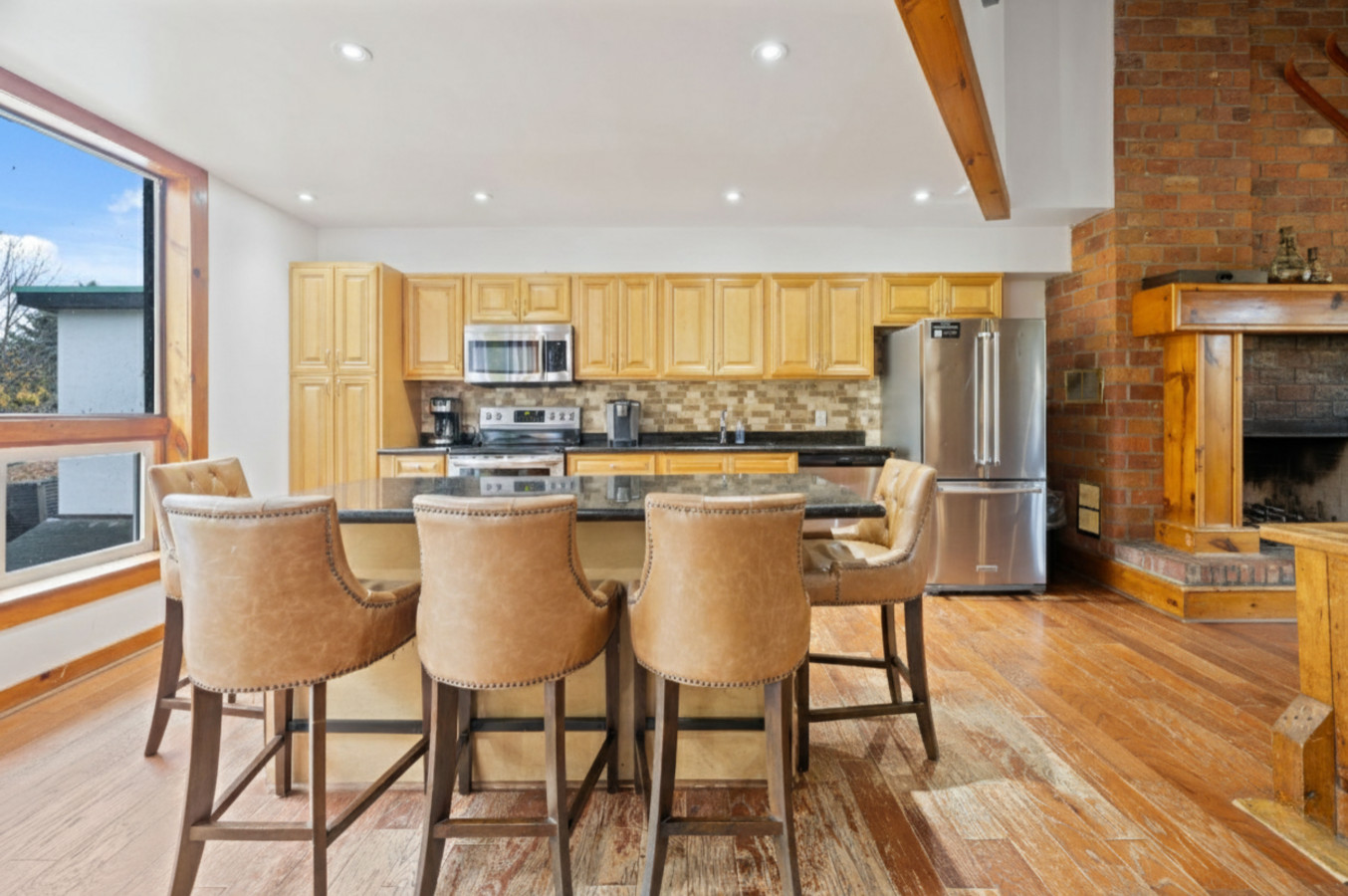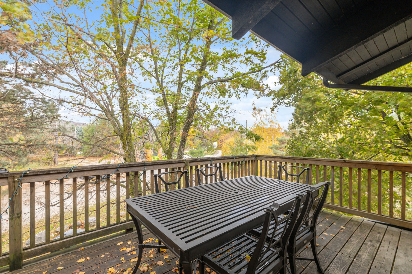 The swiss-style chalet has an open concept top floor featuring a super high ceiling with exposed wood beams. Kitchen, dining room and living room are all on the top floor making it a great place for families and friends to dine and hang out. There's also a large balcony at the back of this top floor with propane BBQ and patio furniture to enjoy your gourmet food outdoors.