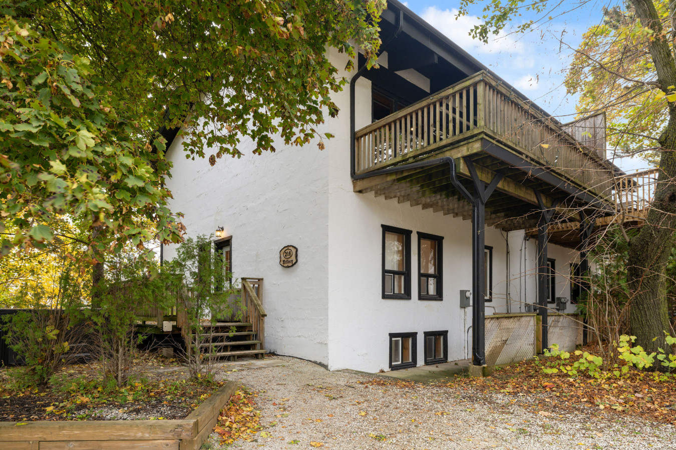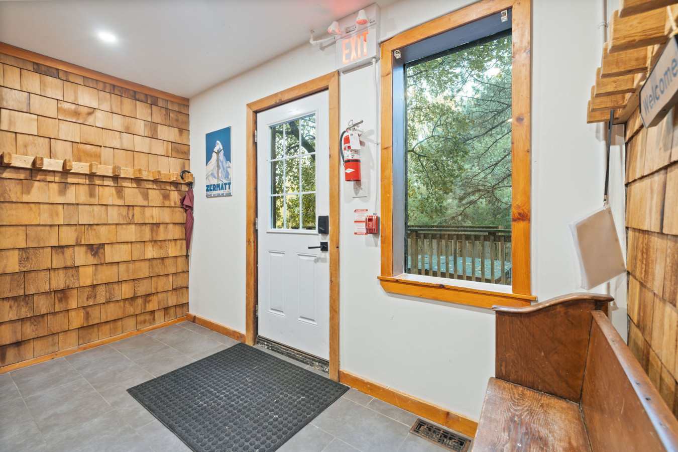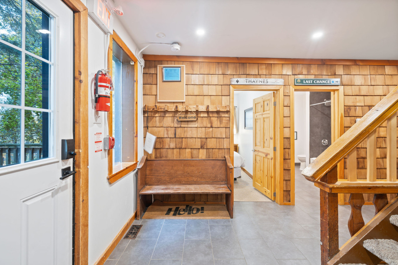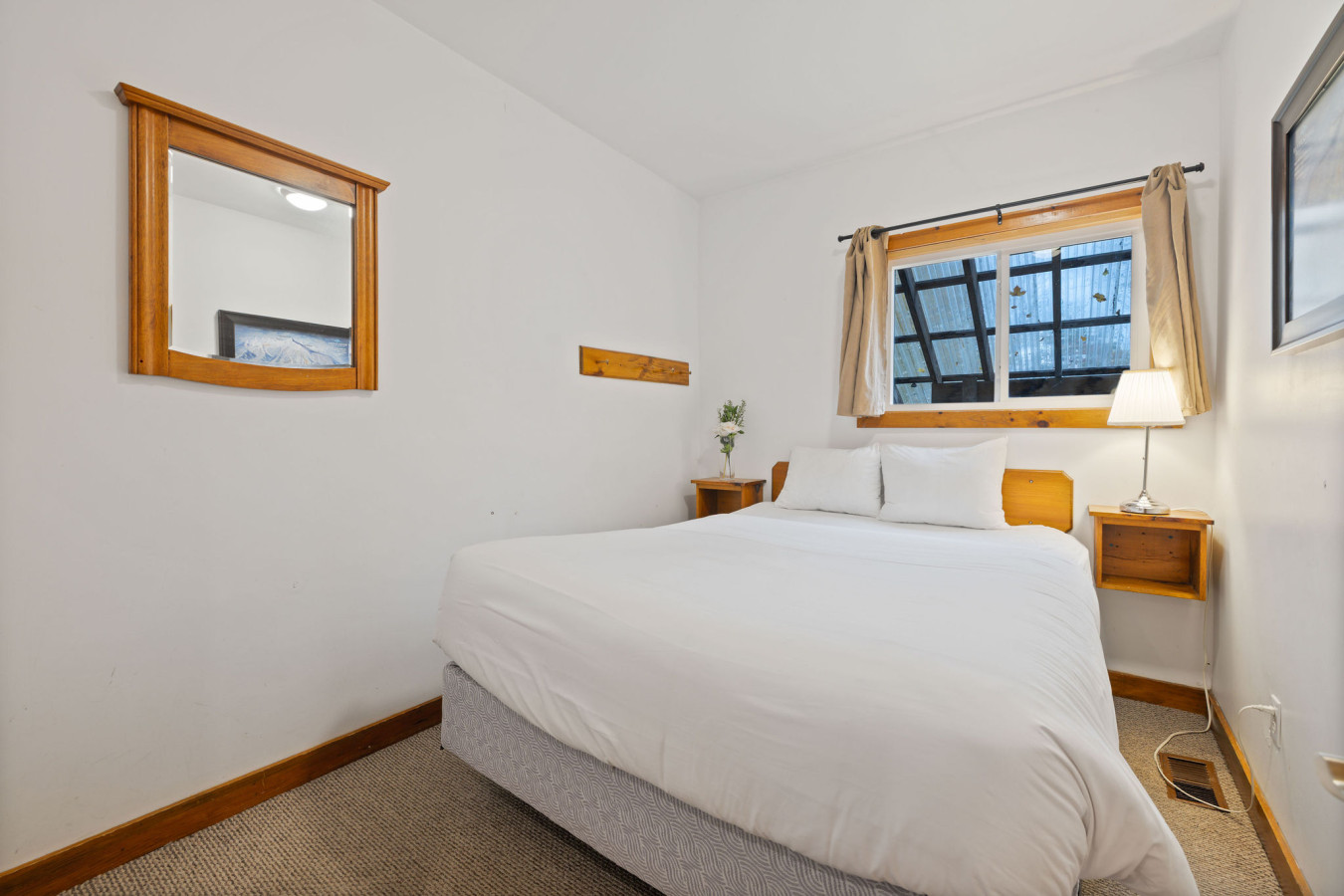 The swiss-style chalet has an open concept top floor featuring a super high ceiling with exposed wood beams. Kitchen, dining room and living room are all on the top floor making it a great place for families and friends to dine and hang out. There's also a large balcony at the back of this top floor with propane BBQ and patio furniture to enjoy your gourmet food outdoors.