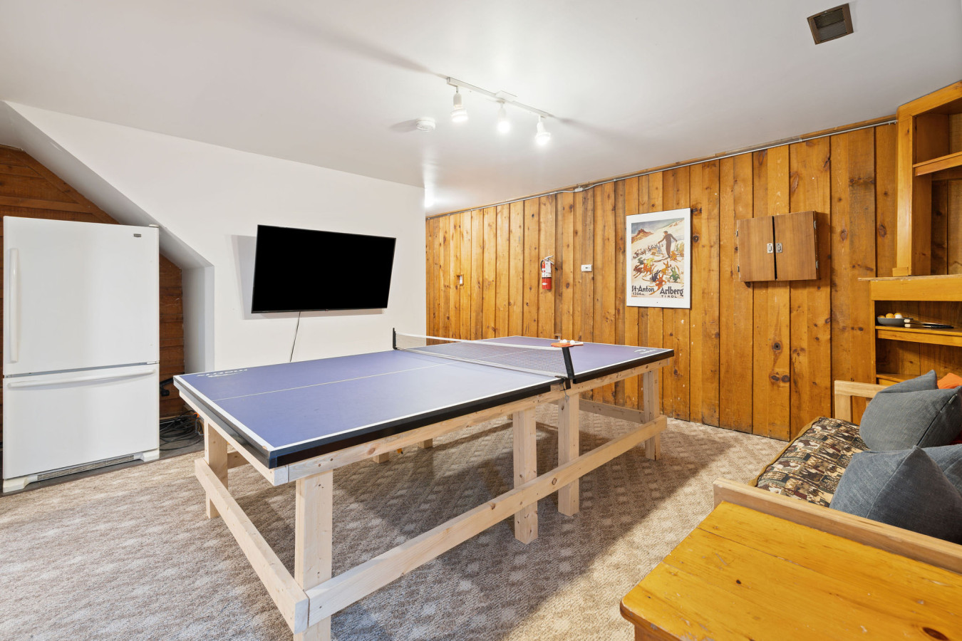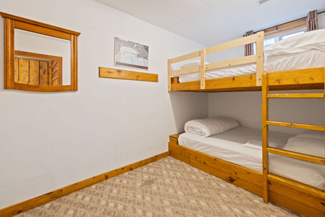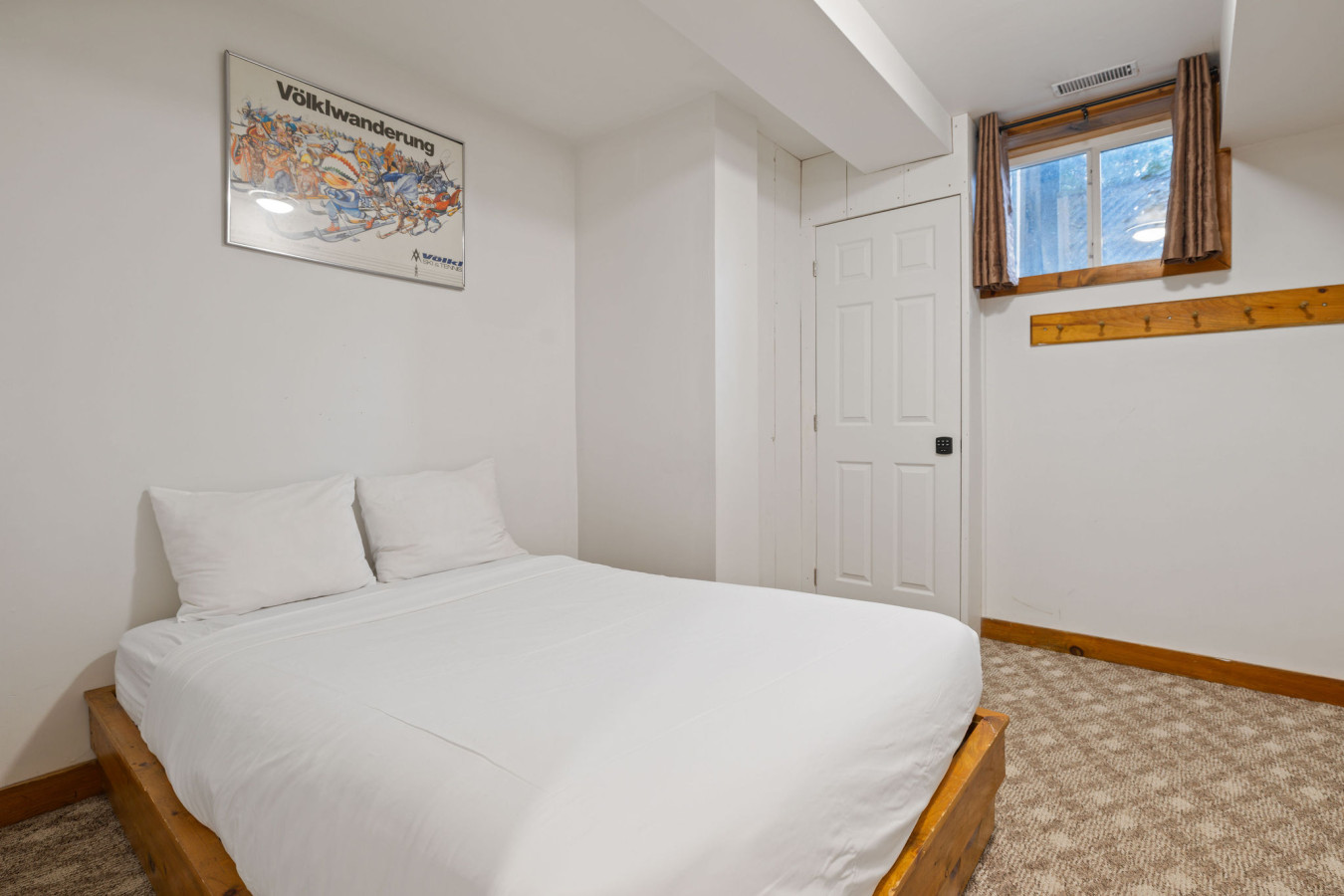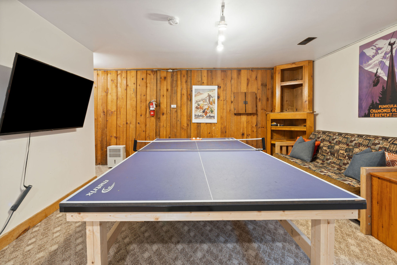 The finished basement has a lounging space with a TV and 4 bedrooms on this level, 2 bedrooms with a double size bunk bed and 2 with a queen bed.