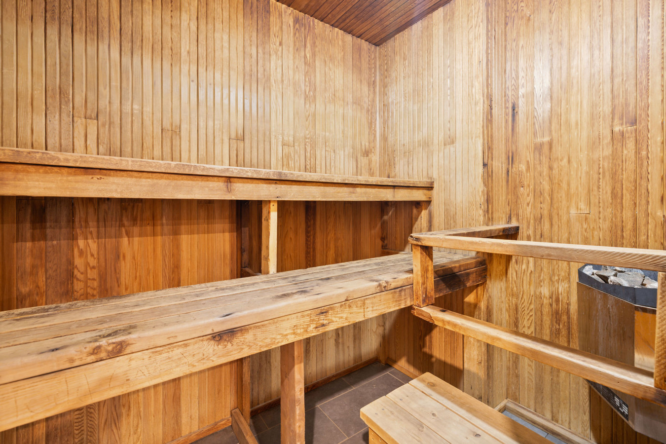 The main floor has 4 bedrooms (3 queen beds in each of 3 bedrooms, 2 single beds in the other), 2 bathrooms, a shower room and a sauna.