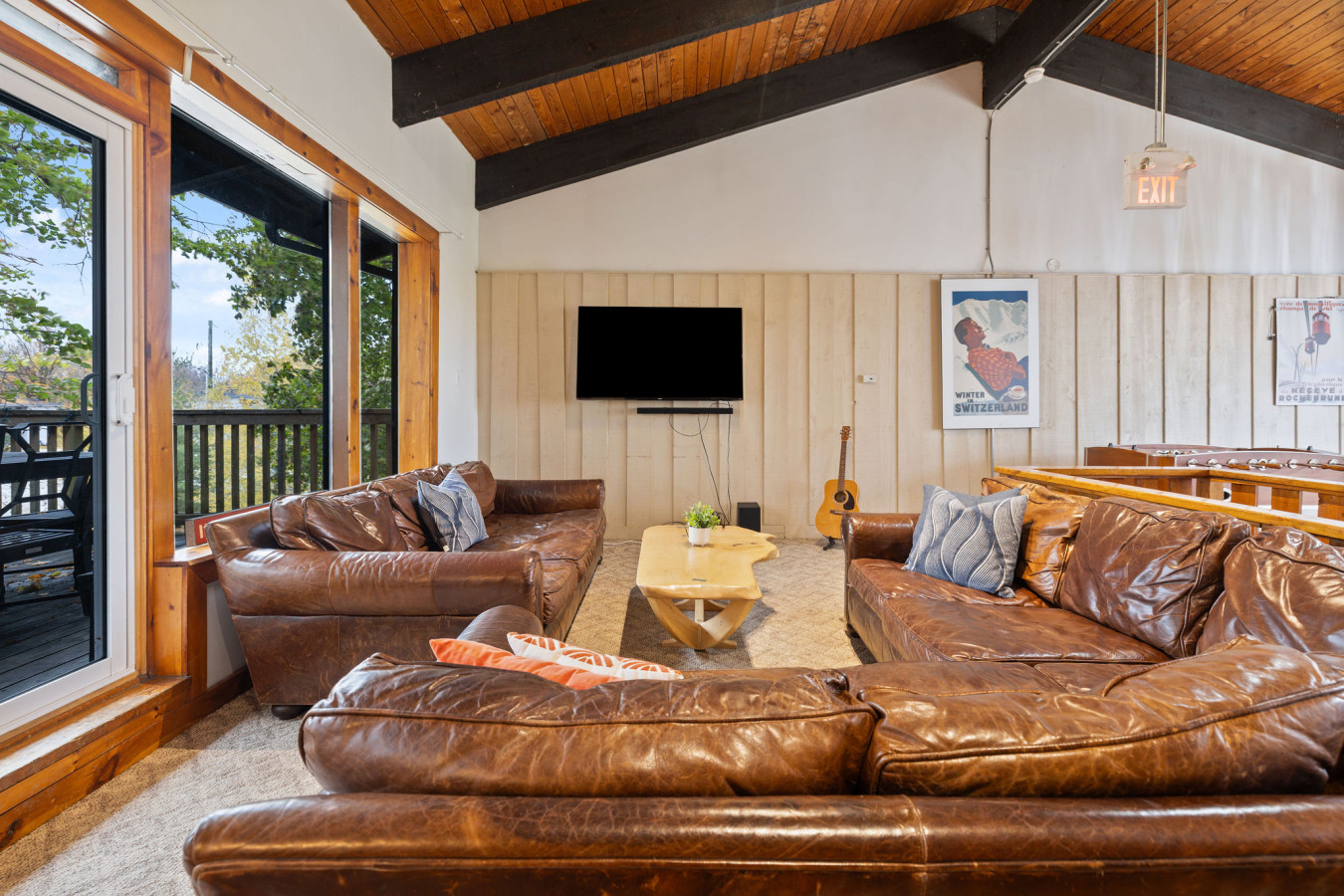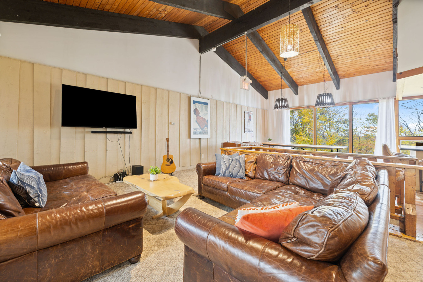 The large living room has super comfy couches and a large 50” smart TV for you to kick back and relax or play a game of foosball. There is a front balcony with a BBQ where you will get a glimpse of the Blue Mountain ski hill in the winter.